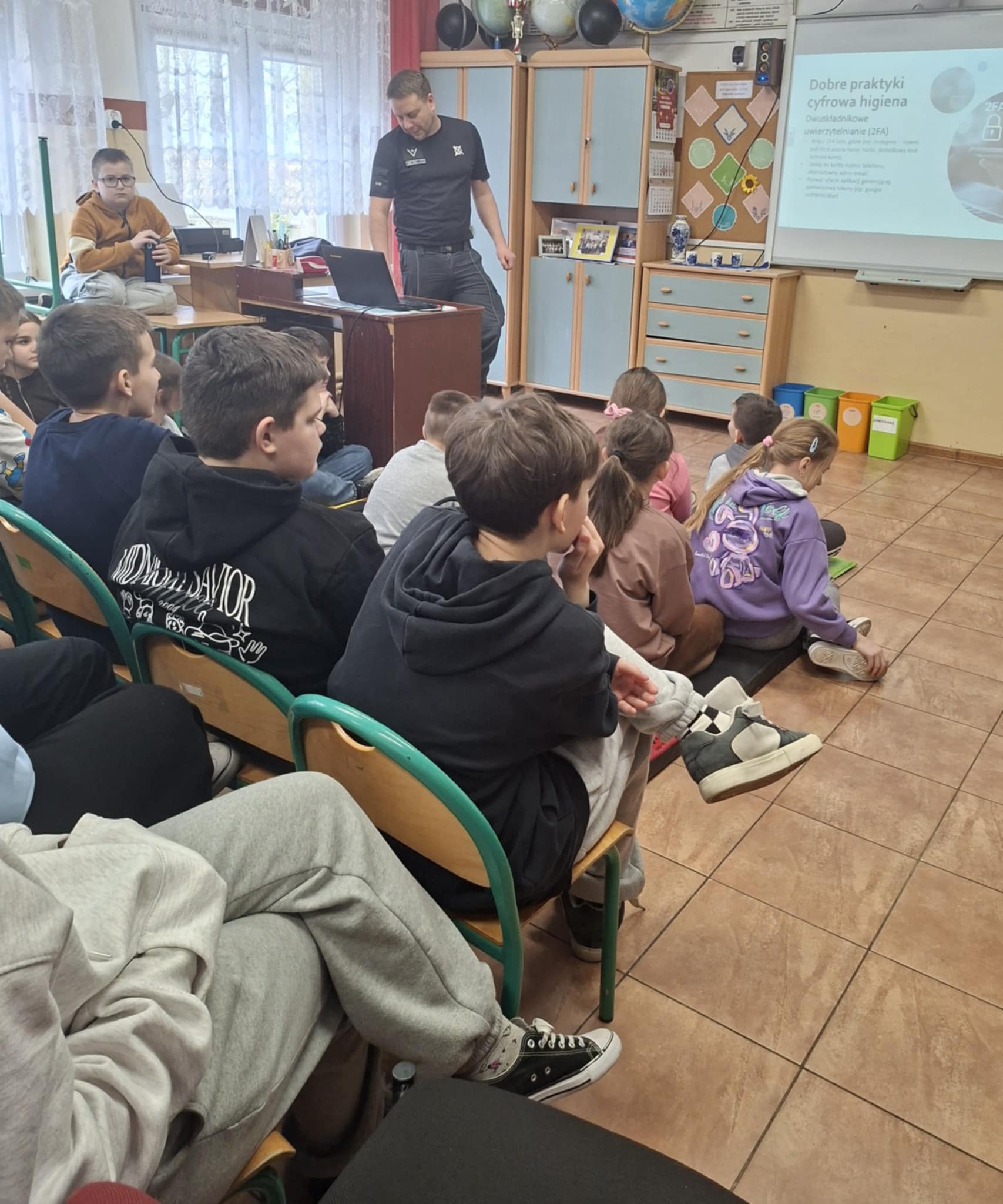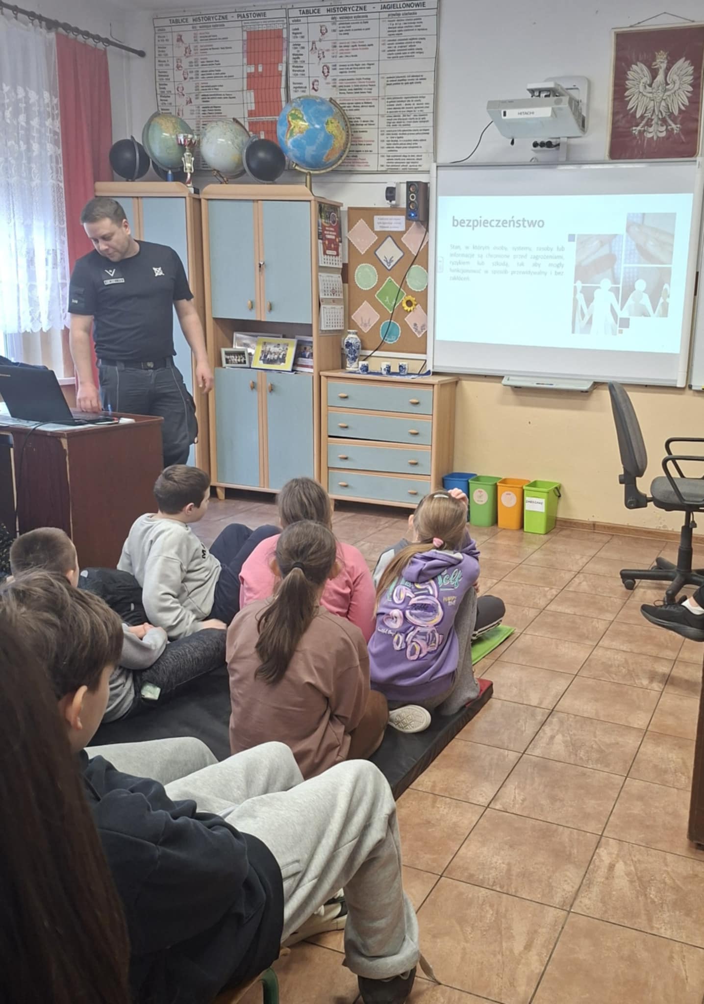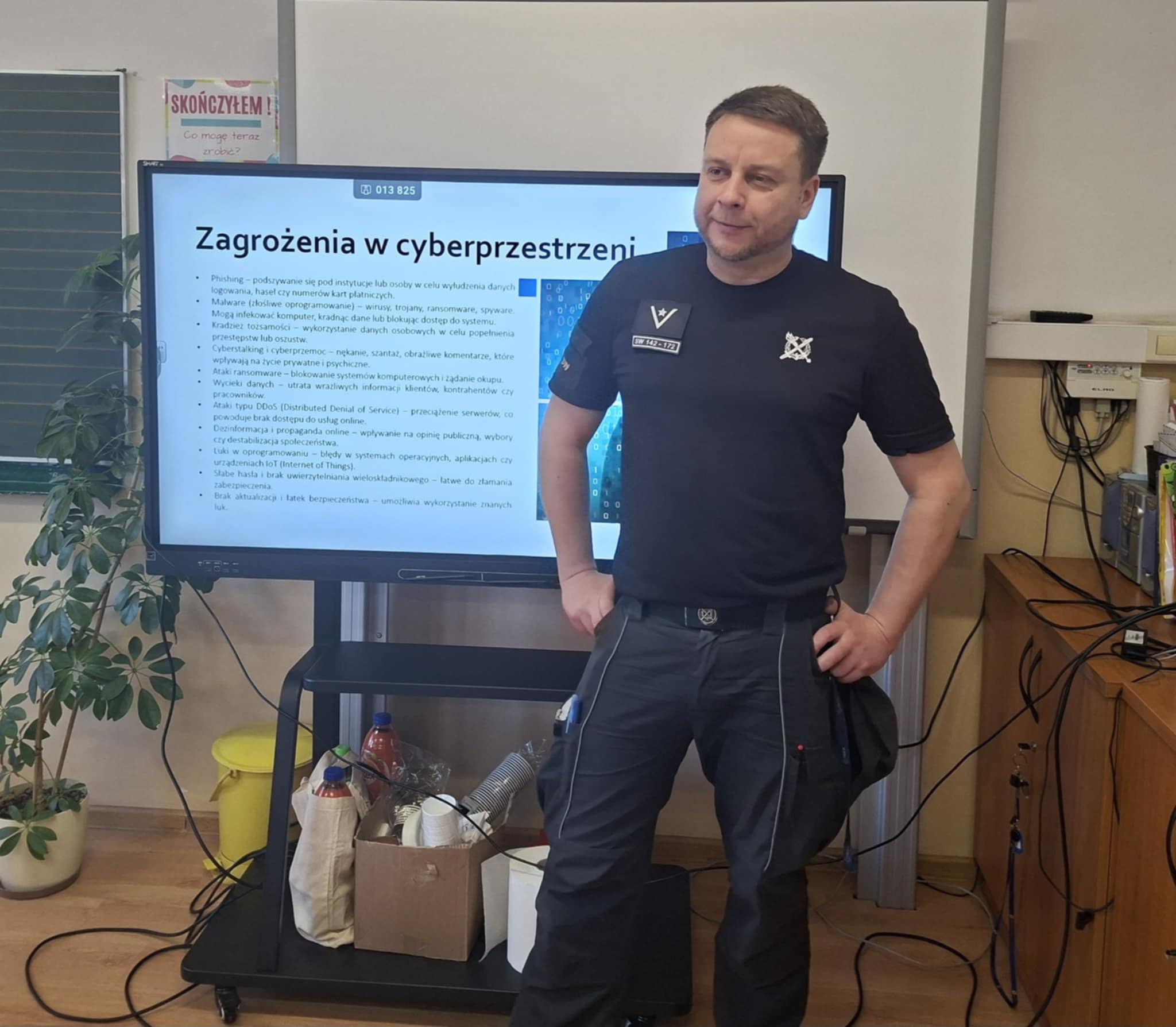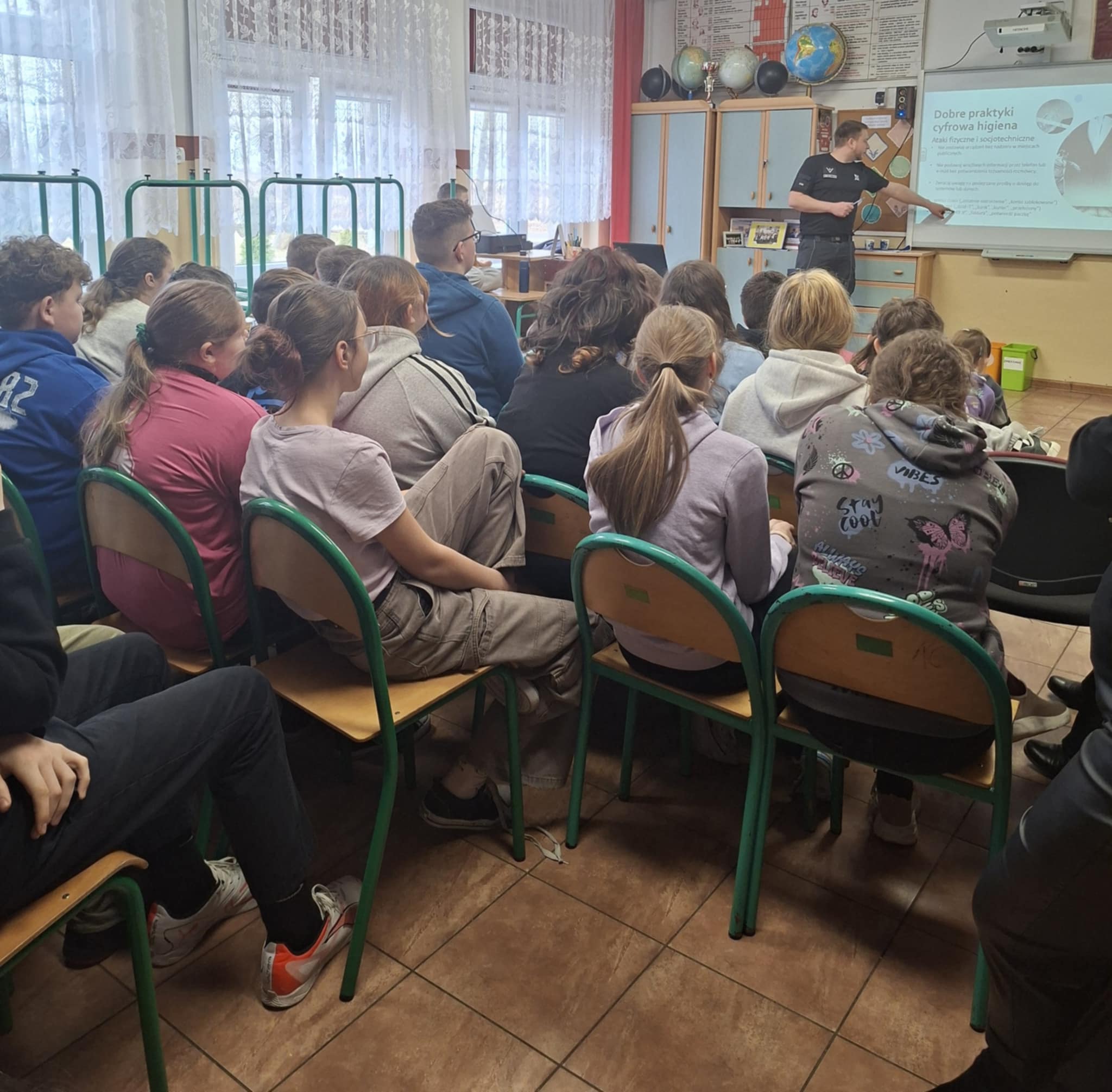 Naszym gościem był funkcjonariusz z Zakład Karnego w Inowrocławiu, który w przystępny i interesujący sposób omówił zagadnienia związane z bezpieczeństwem w sieci. Podczas prelekcji uczniowie poznali przykłady najczęstszych oszustw internetowych oraz technik socjotechnicznych stosowanych przez cyberprzestępców. Prowadzący zwrócił uwagę na konsekwencje nieodpowiedzialnych działań w Internecie oraz podkreślił, jak ważna jest ostrożność i ograniczone zaufanie wobec nieznanych osób w sieci.