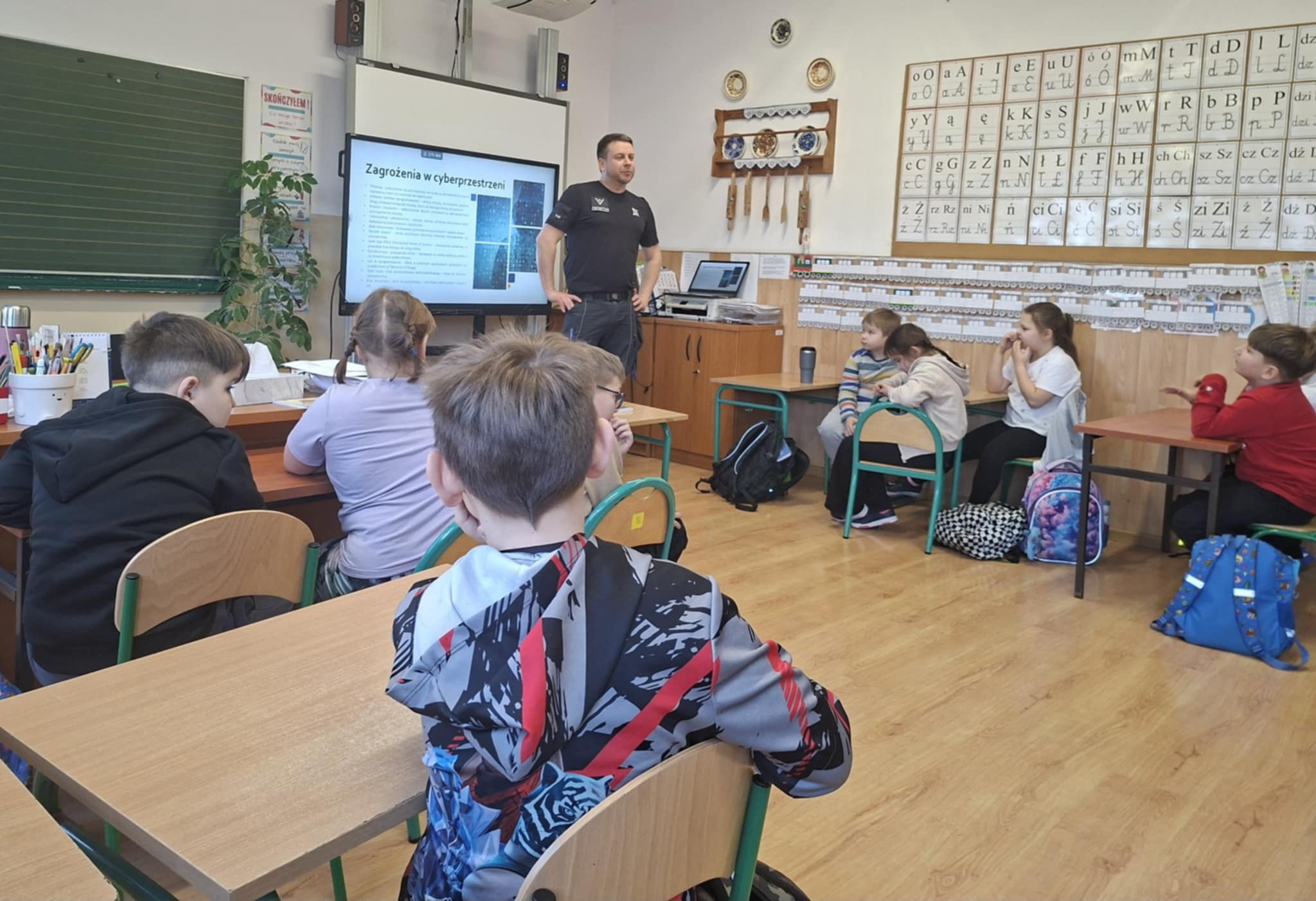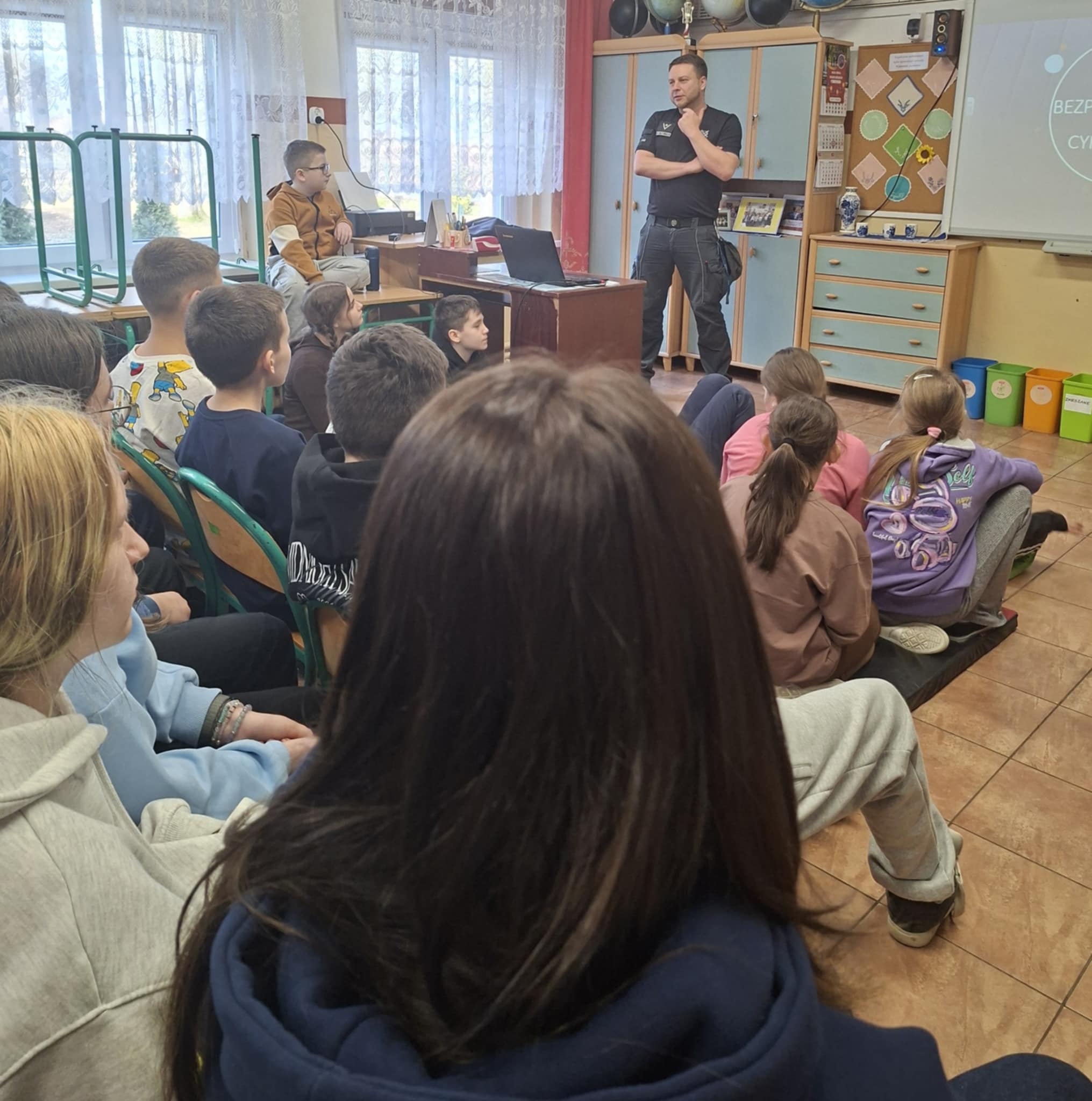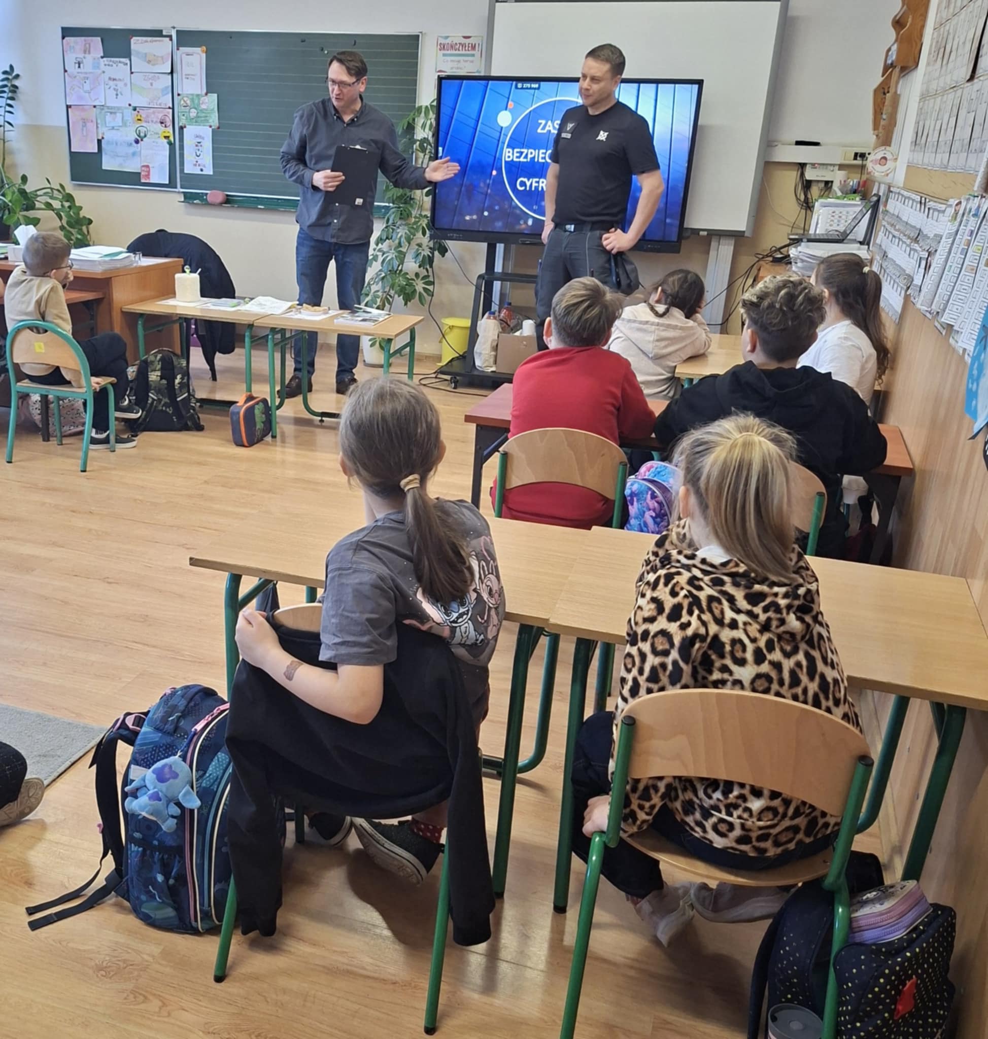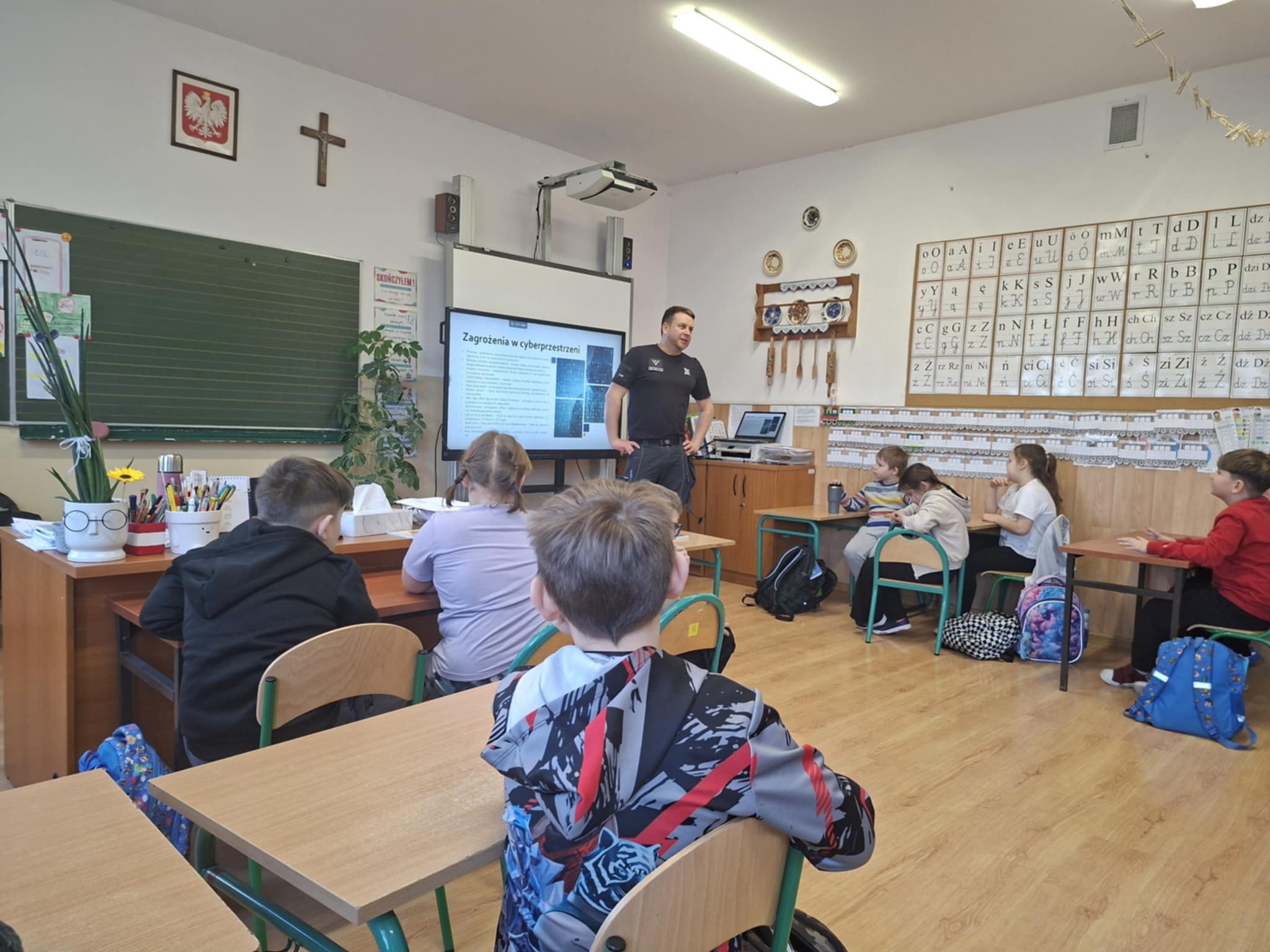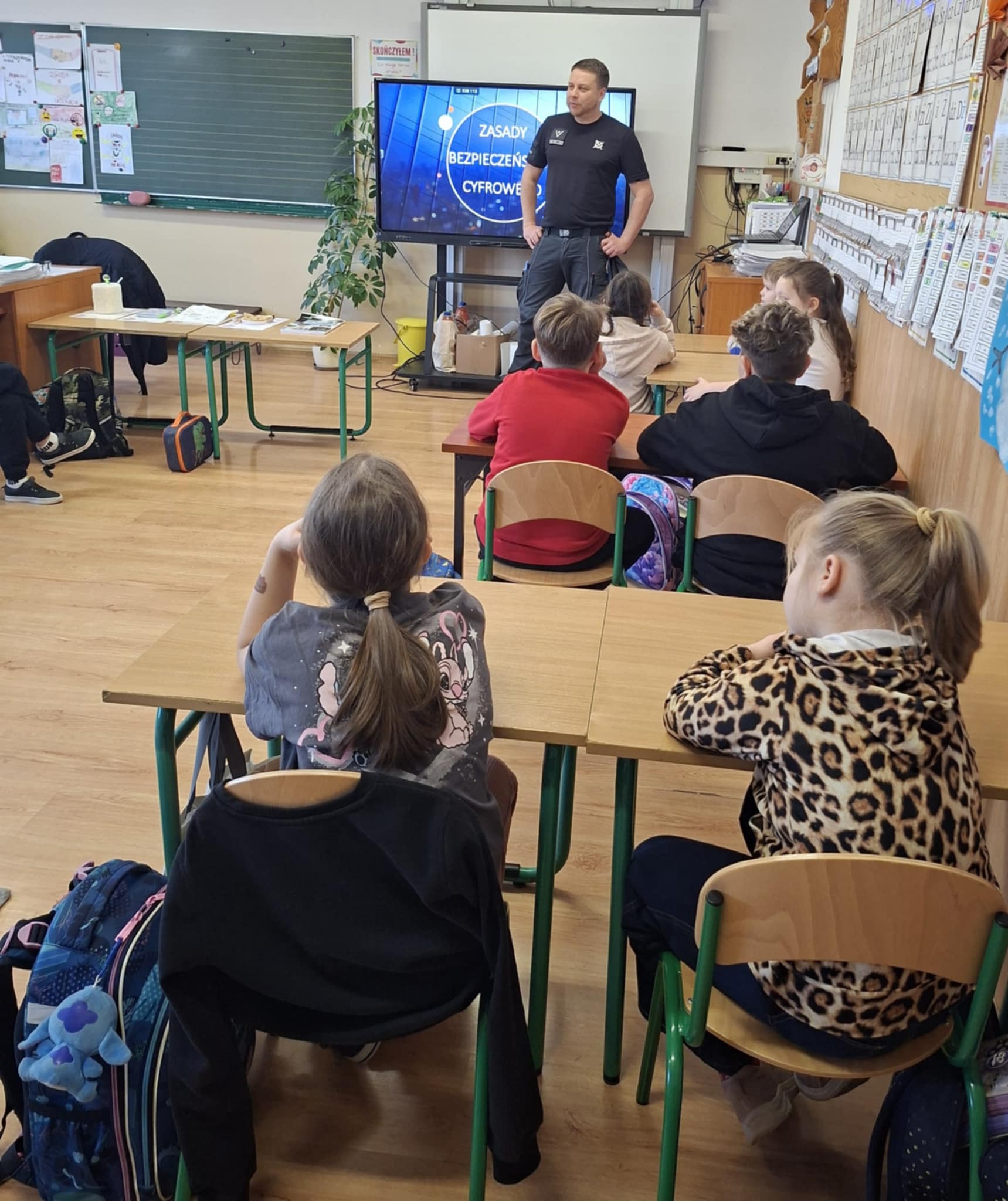 Naszym gościem był funkcjonariusz z Zakład Karnego w Inowrocławiu, który w przystępny i interesujący sposób omówił zagadnienia związane z bezpieczeństwem w sieci. Podczas prelekcji uczniowie poznali przykłady najczęstszych oszustw internetowych oraz technik socjotechnicznych stosowanych przez cyberprzestępców. Prowadzący zwrócił uwagę na konsekwencje nieodpowiedzialnych działań w Internecie oraz podkreślił, jak ważna jest ostrożność i ograniczone zaufanie wobec nieznanych osób w sieci.