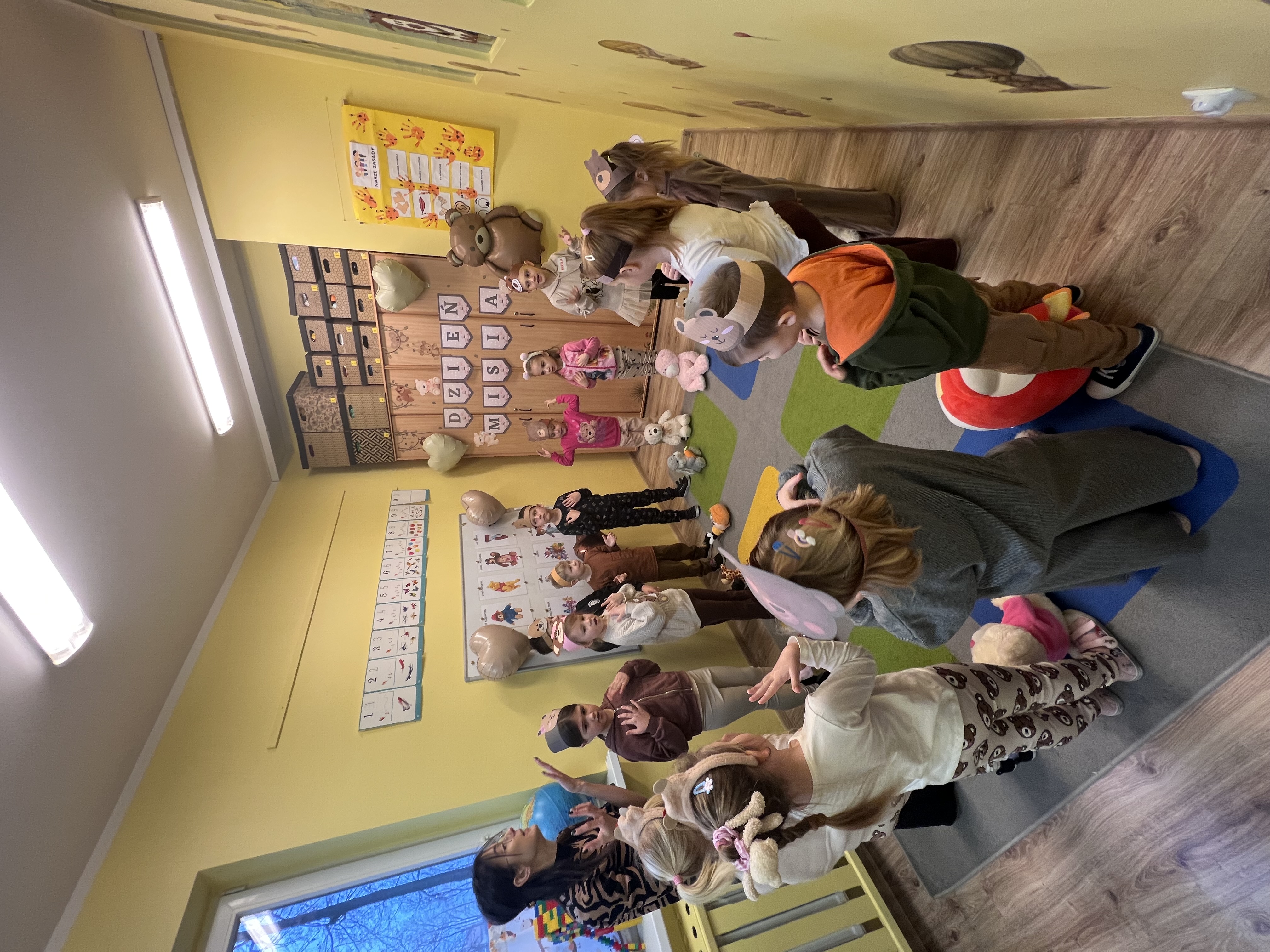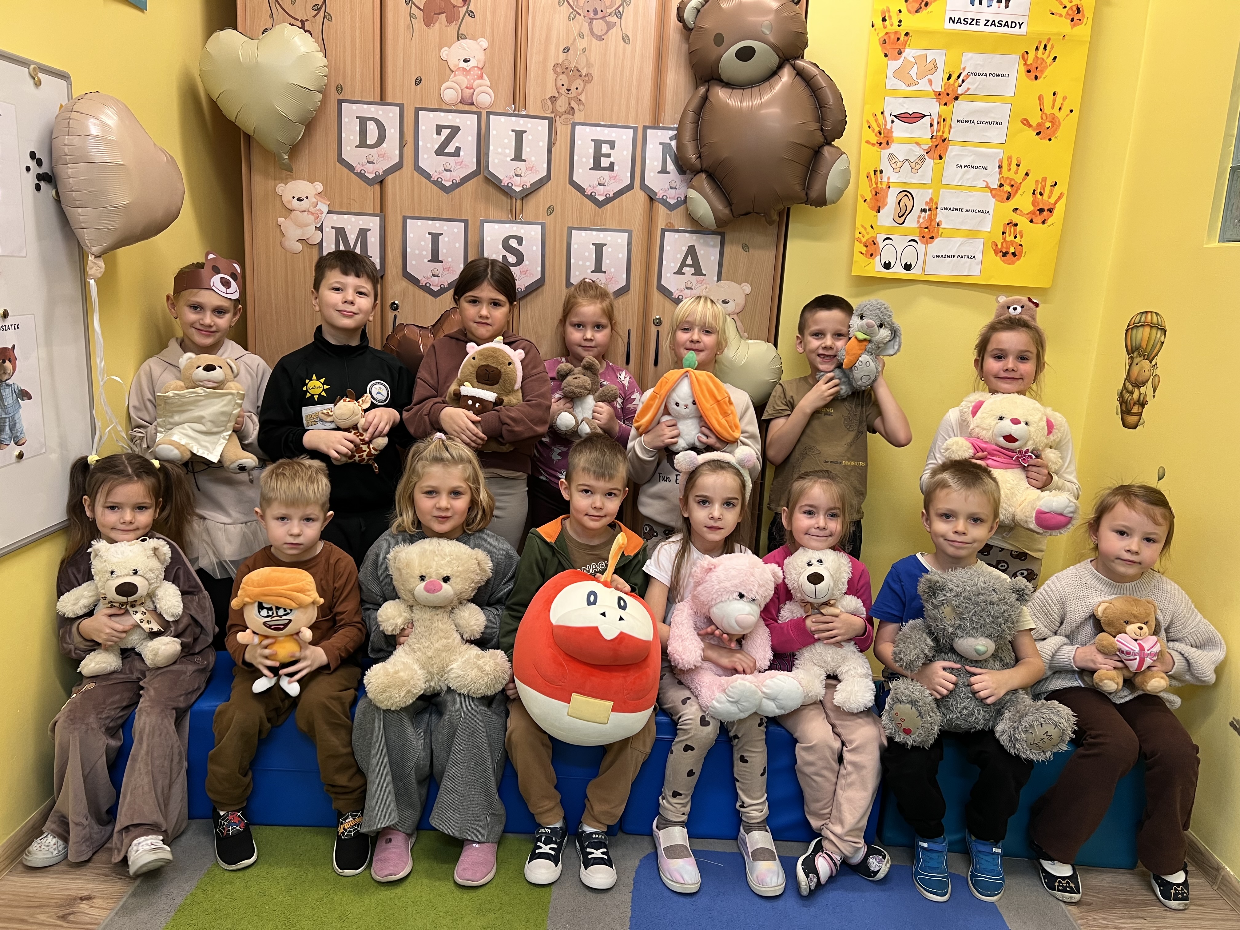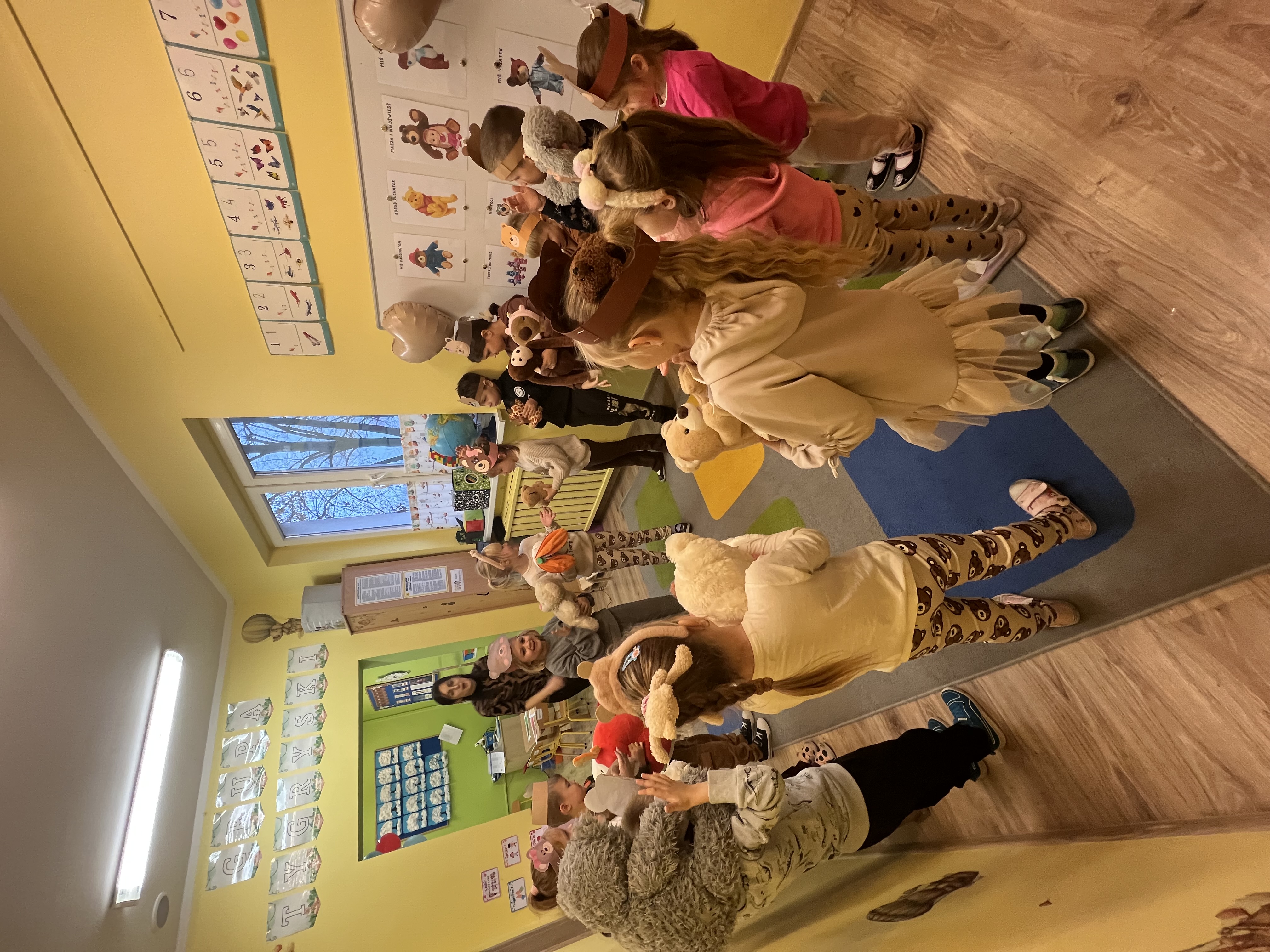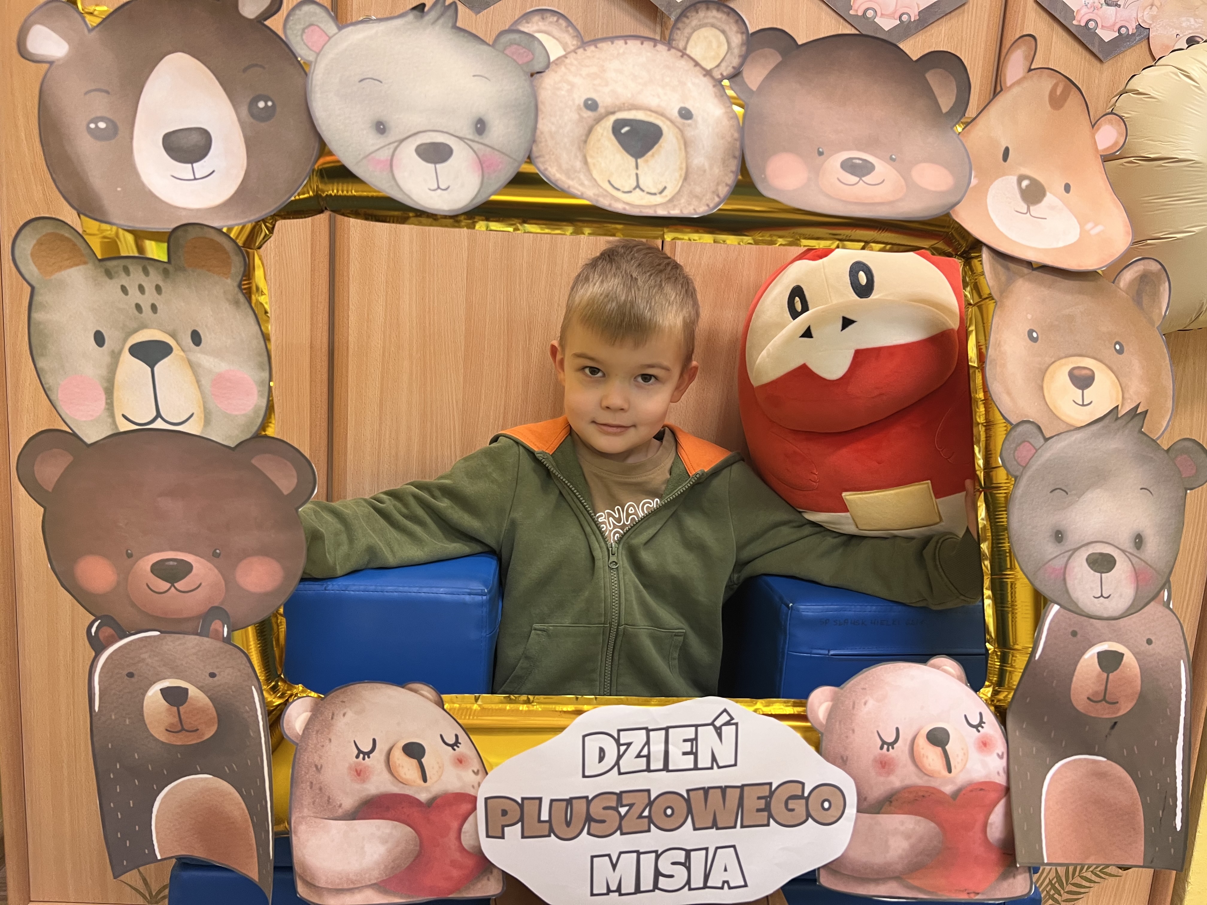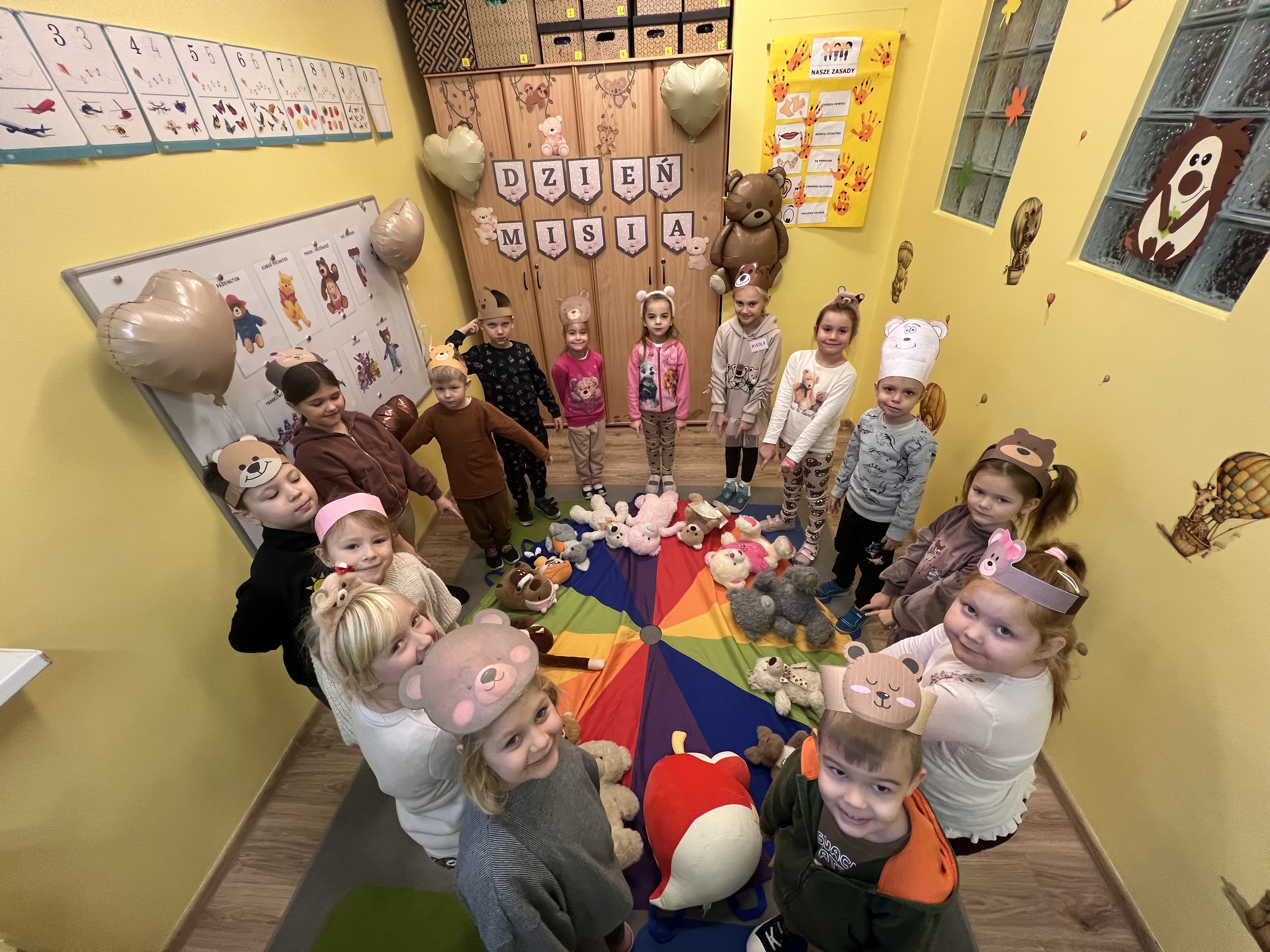 W grupie „Tygryski” świętowaliśmy Dzień Pluszowego Misia, łącząc naukę z aktywną zabawą i naturalną energią naszych przedszkolaków. Rozpoczęliśmy od radosnej powitanki ruchowej, po której dzieci poznały ciekawą historię pluszowego misia. Ruch był ważnym elementem tego wyjątkowego dnia – „Tygryski” z entuzjazmem uczestniczyły w gimnastyce z misiem oraz sprawdzały swoją sprawność na specjalnie przygotowanym torze przeszkód. Nie zabrakło wyzwań edukacyjnych: dzieci samodzielnie mierzyły misie używając klocków jako nietypowej jednostki miary.Następnie doskonaliły liczenie, precyzyjnie dopasowując plastry miodu do danego misia. Wiele radości sprawiła również zabawa w „Szukanie miodku ”, dzięki której przedszkolaki rozwijały słuch fonemowy. Wyjątkową atrakcją dnia była także fotobudka, z której dzieci mogły korzystać w trakcie zabaw, tworząc pamiątkowe, radosne zdjęcia. Dzień upłynął w atmosferze uśmiechu, ruchu i kreatywnej nauki, pozostawiając wiele ciepłych wspomnień.