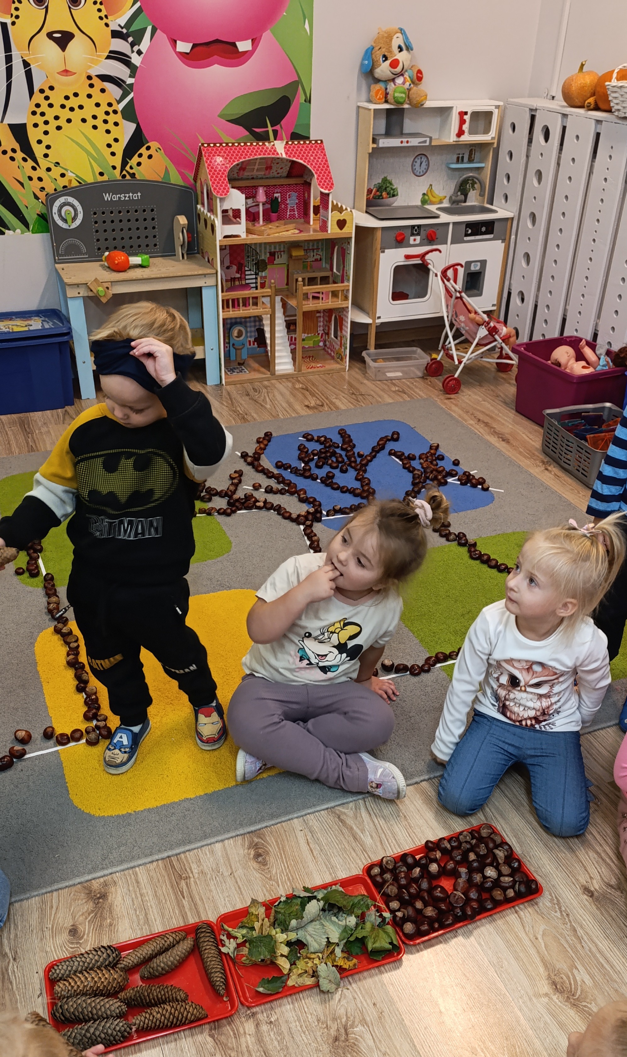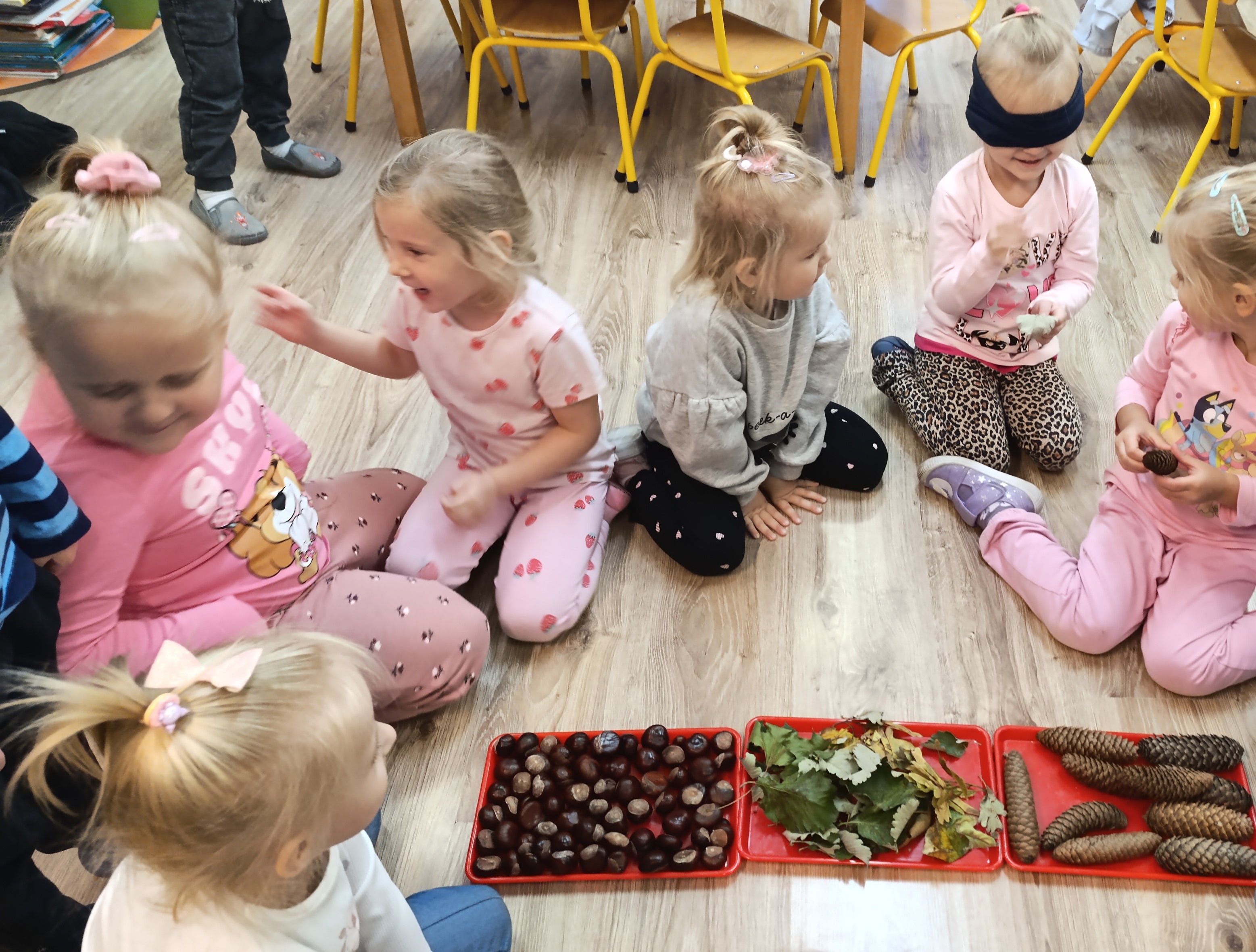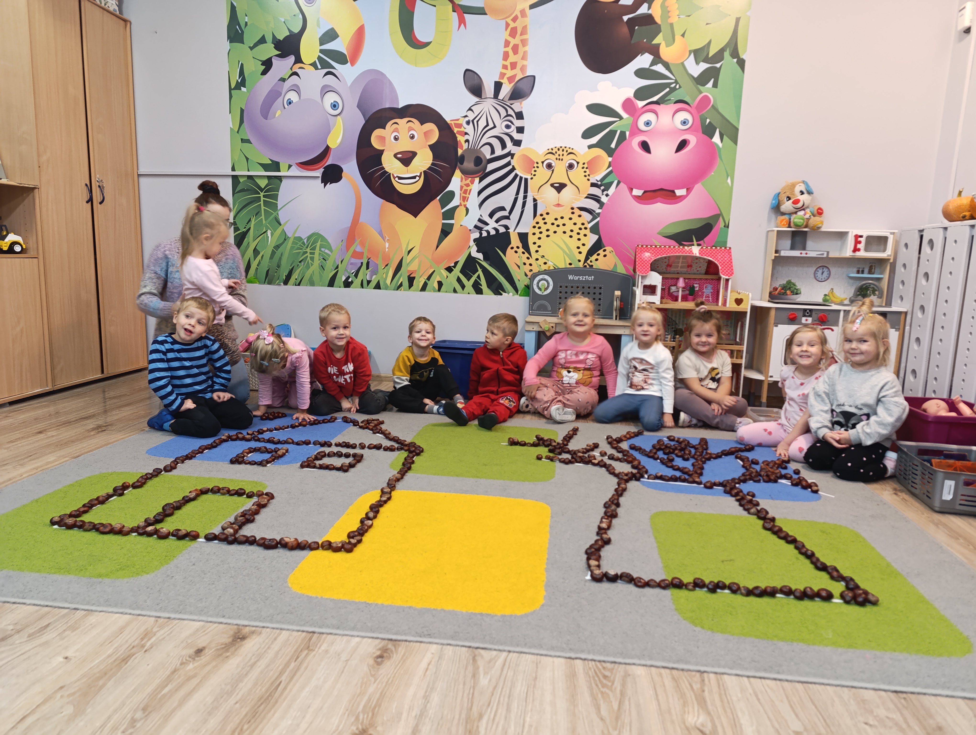 W tym tygodniu grupa „Motyli” realizowała temat „Jesień w parku”. Dzieci z dużym zaangażowaniem przyniosły do przedszkola różne dary jesieni – kasztany, żołędzie, liście, szyszki i orzechy. Podczas zajęć poznawały ich nazwy, uczyły się je rozpoznawać oraz badały je za pomocą zmysłów: dotyku, wzroku i węchu. Nie zabrakło również działań plastyczno-technicznych – przedszkolaki stworzyły własne kasztanowe ludziki, a także wspólnie ułożyły kompozycję z darów jesieni. Był to tydzień pełen kolorów, zapachów i radości z odkrywania uroków jesieni!