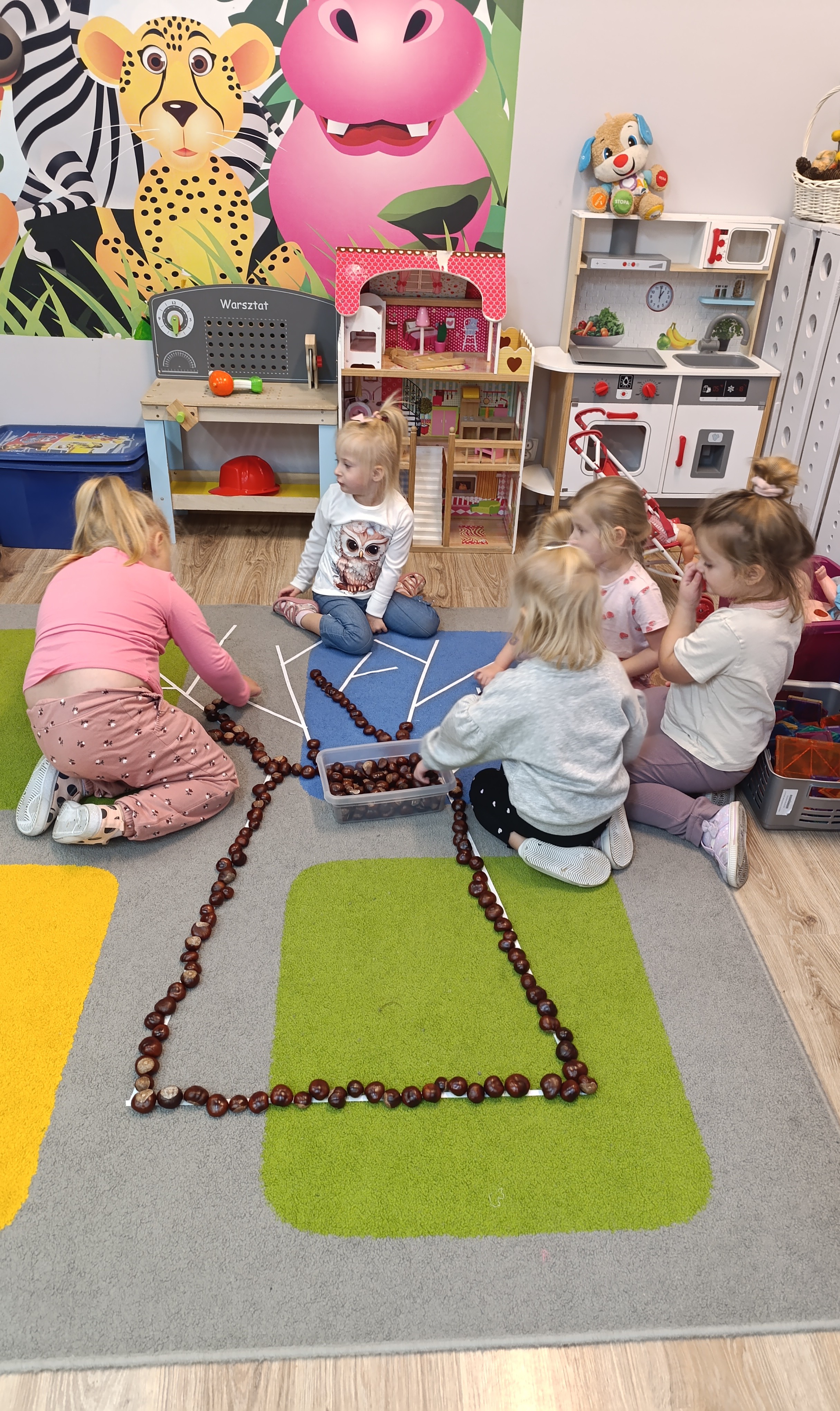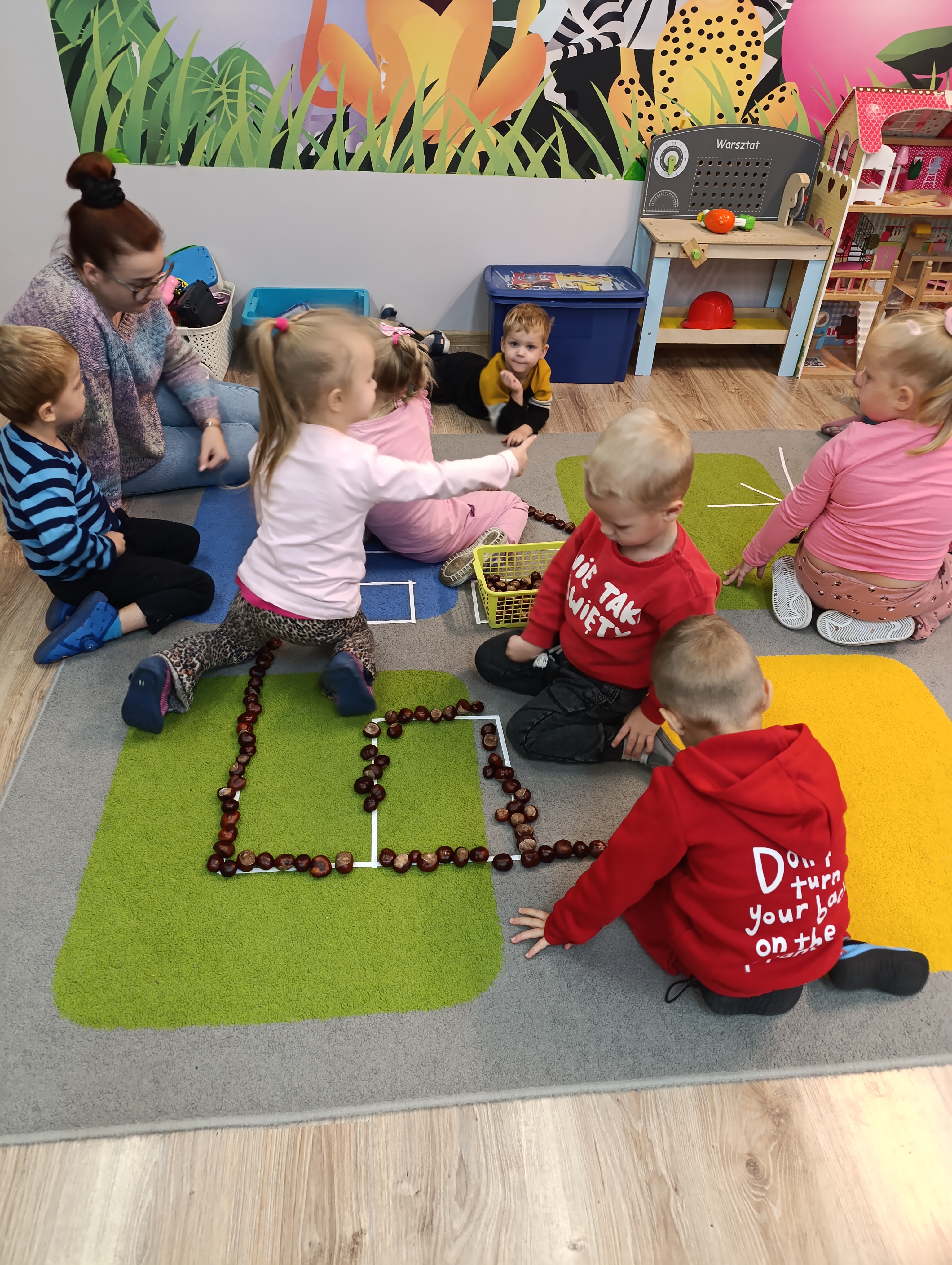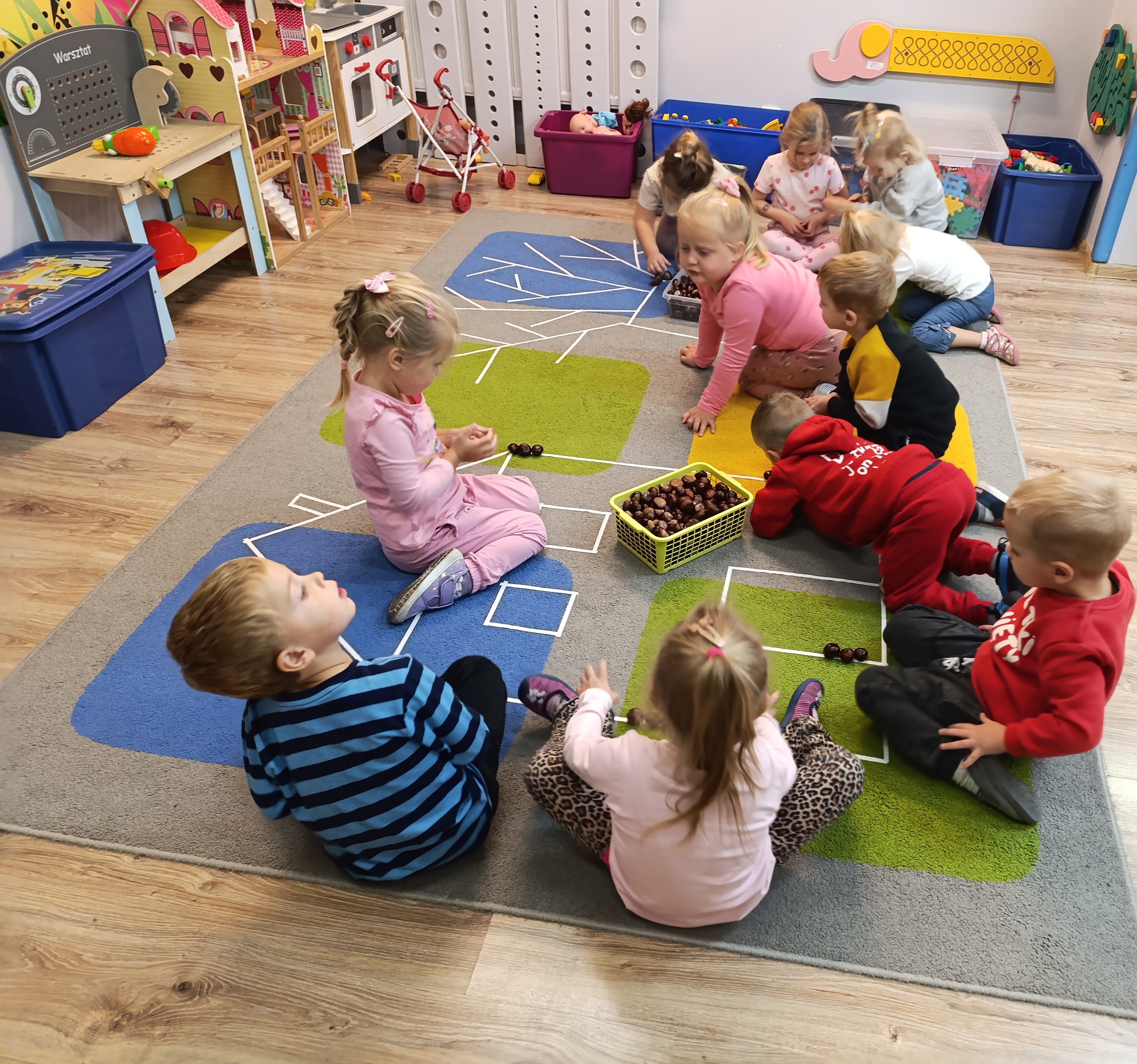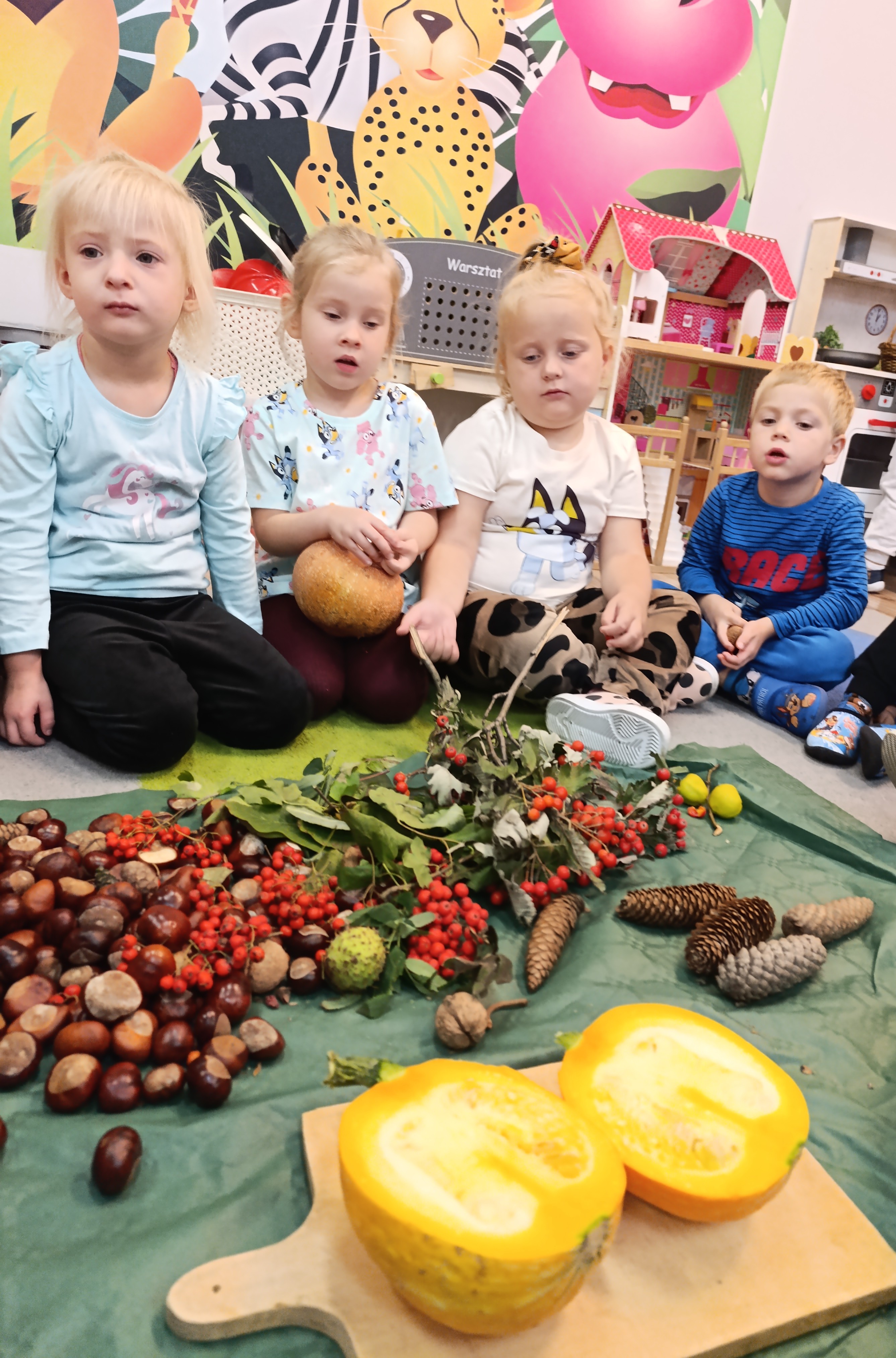 W tym tygodniu grupa „Motyli” realizowała temat „Jesień w parku”. Dzieci z dużym zaangażowaniem przyniosły do przedszkola różne dary jesieni – kasztany, żołędzie, liście, szyszki i orzechy. Podczas zajęć poznawały ich nazwy, uczyły się je rozpoznawać oraz badały je za pomocą zmysłów: dotyku, wzroku i węchu. Nie zabrakło również działań plastyczno-technicznych – przedszkolaki stworzyły własne kasztanowe ludziki, a także wspólnie ułożyły kompozycję z darów jesieni. Był to tydzień pełen kolorów, zapachów i radości z odkrywania uroków jesieni!