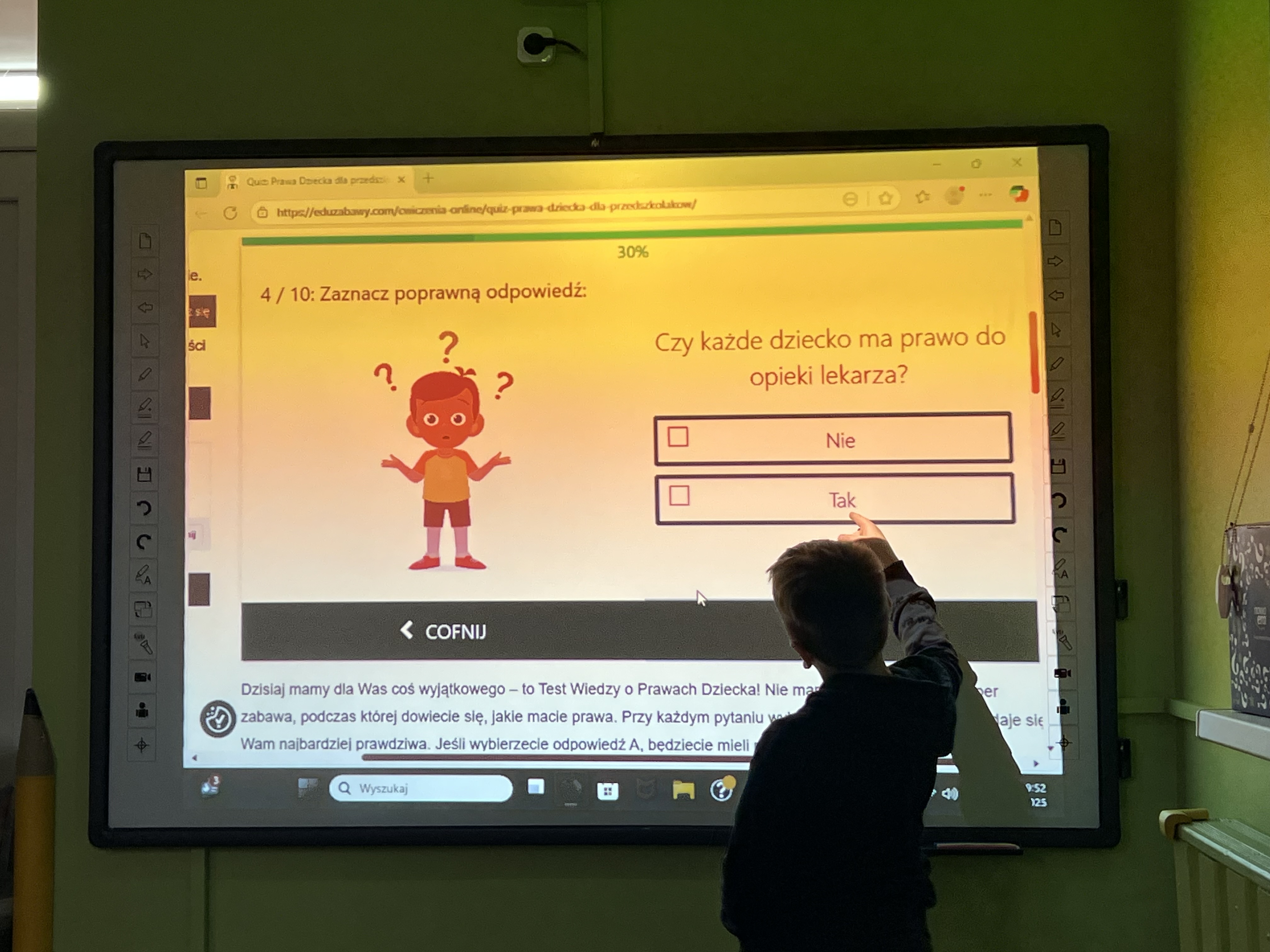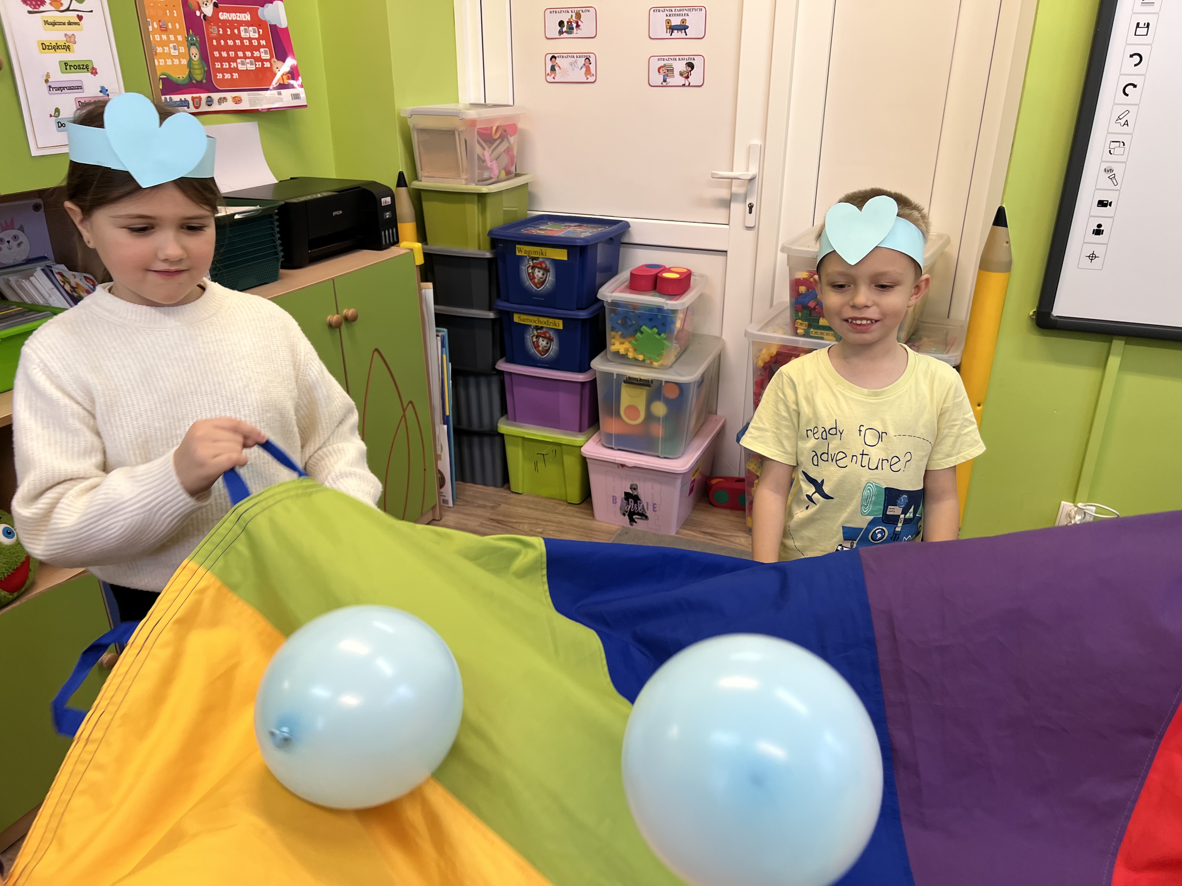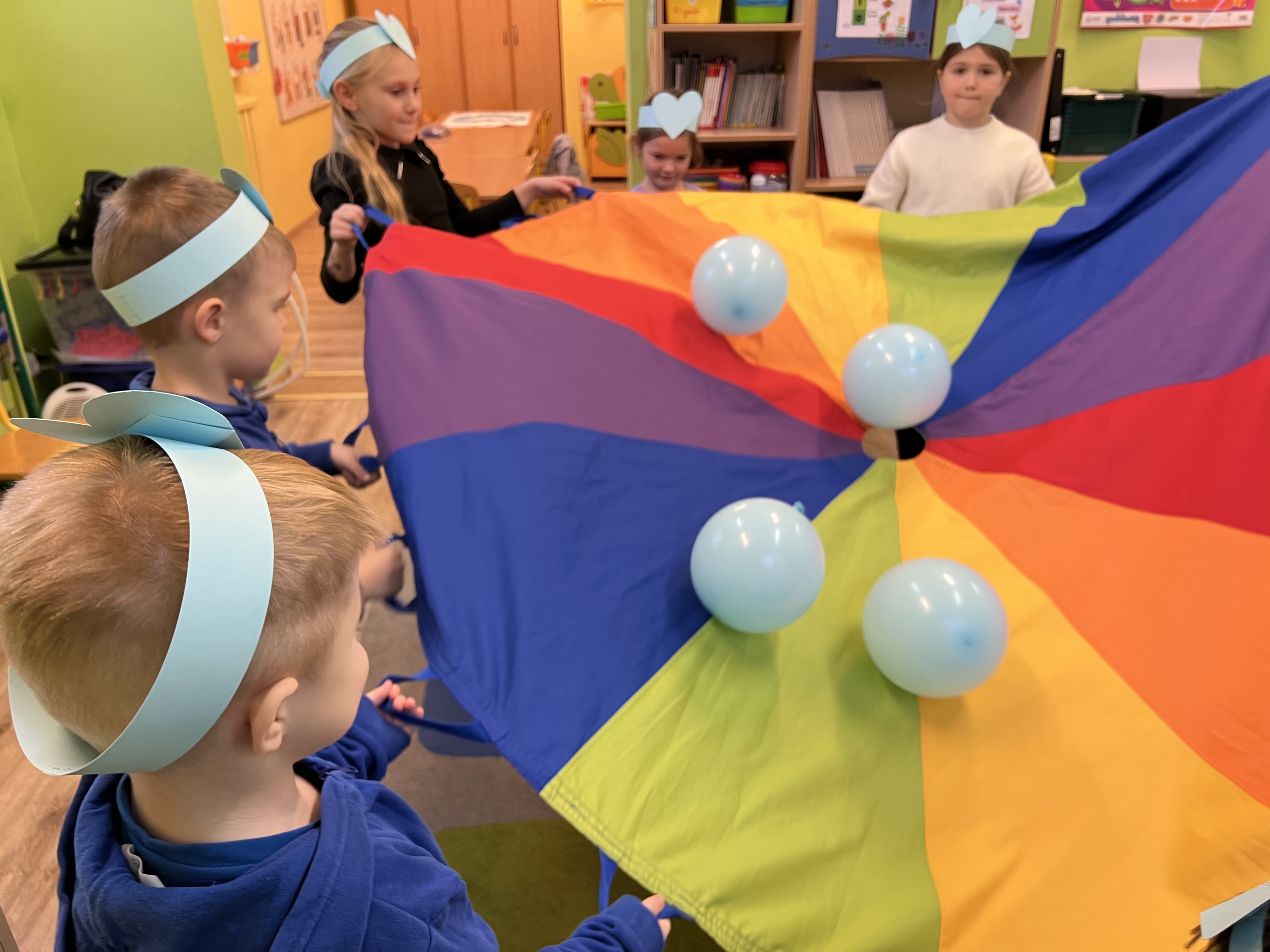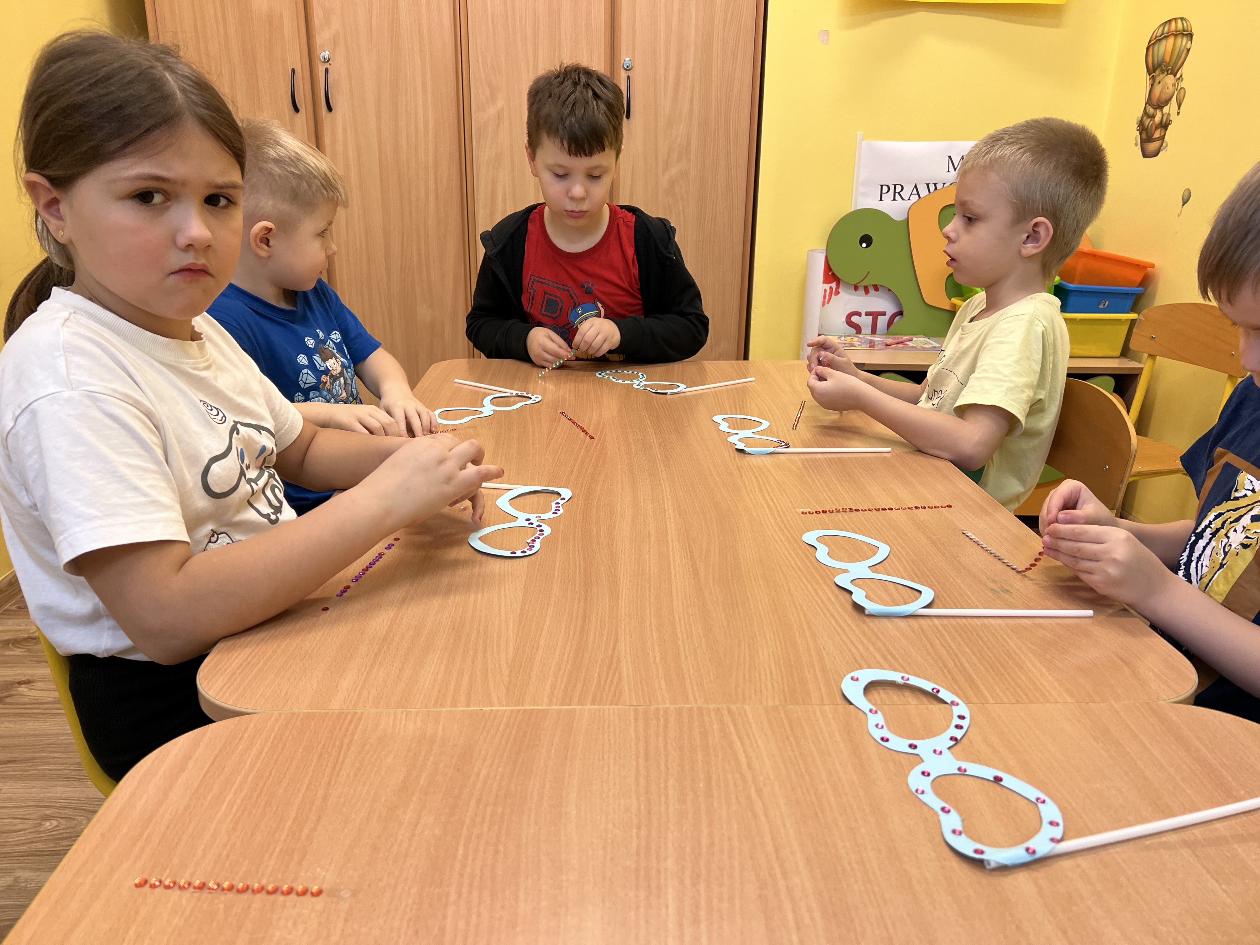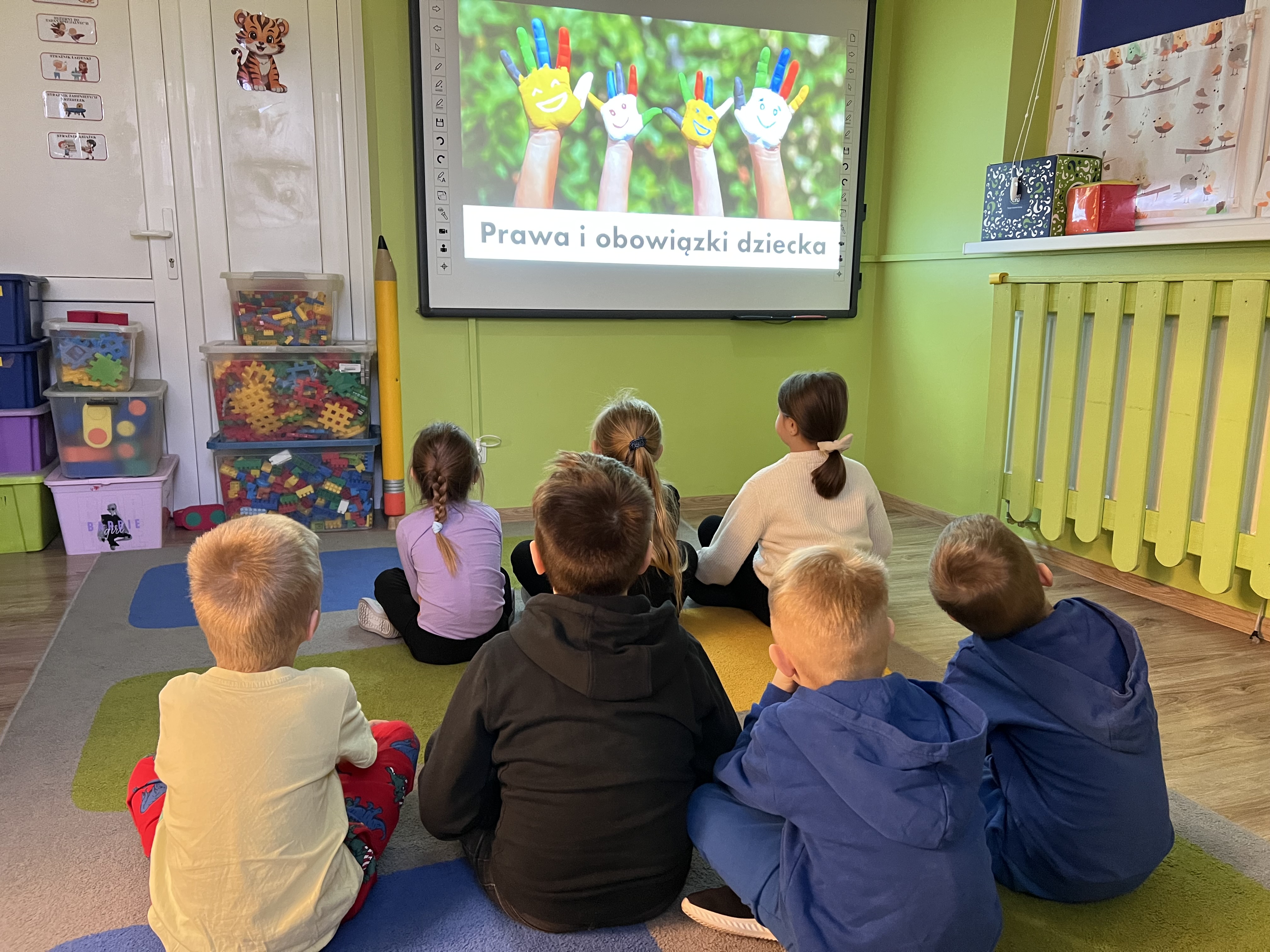 Dnia 20 listopada grupa przedszkolna "Tygryski" uroczyście obchodziła Międzynarodowy Dzień Praw Dziecka. Był to czas intensywnej edukacji, twórczej pracy i radosnej zabawy, poświęcony poznawaniu fundamentalnych praw przysługujących każdemu dziecku. Przedszkolaki rozpoczęły dzień od filmu edukacyjnego, który wprowadził je w świat praw i obowiązków. Następnie "Tygryski" wykazały się świetną wiedzą, bezbłędnie rozwiązując tematyczny quiz. W dalszej części dnia, dzieci aktywnie uczestniczyły w tworzeniu kolorowego plakatu "Mam prawo do...", wizualizując swoje najważniejsze przywileje. Oprócz pracy plastycznej, dużo integracji i radości dostarczyły im zabawy z chustą animacyjną i balonami. Zwieńczeniem obchodów było stworzenie "Okularów Wrażliwości". To symboliczne ćwiczenie uczyło "Tygryski" patrzeć na świat oczami innych dzieci, pokazując ich gotowość do szanowania praw swoich rówieśników i pielęgnowania wzajemnej empatii. To był niezwykle ważny i inspirujący dzień!