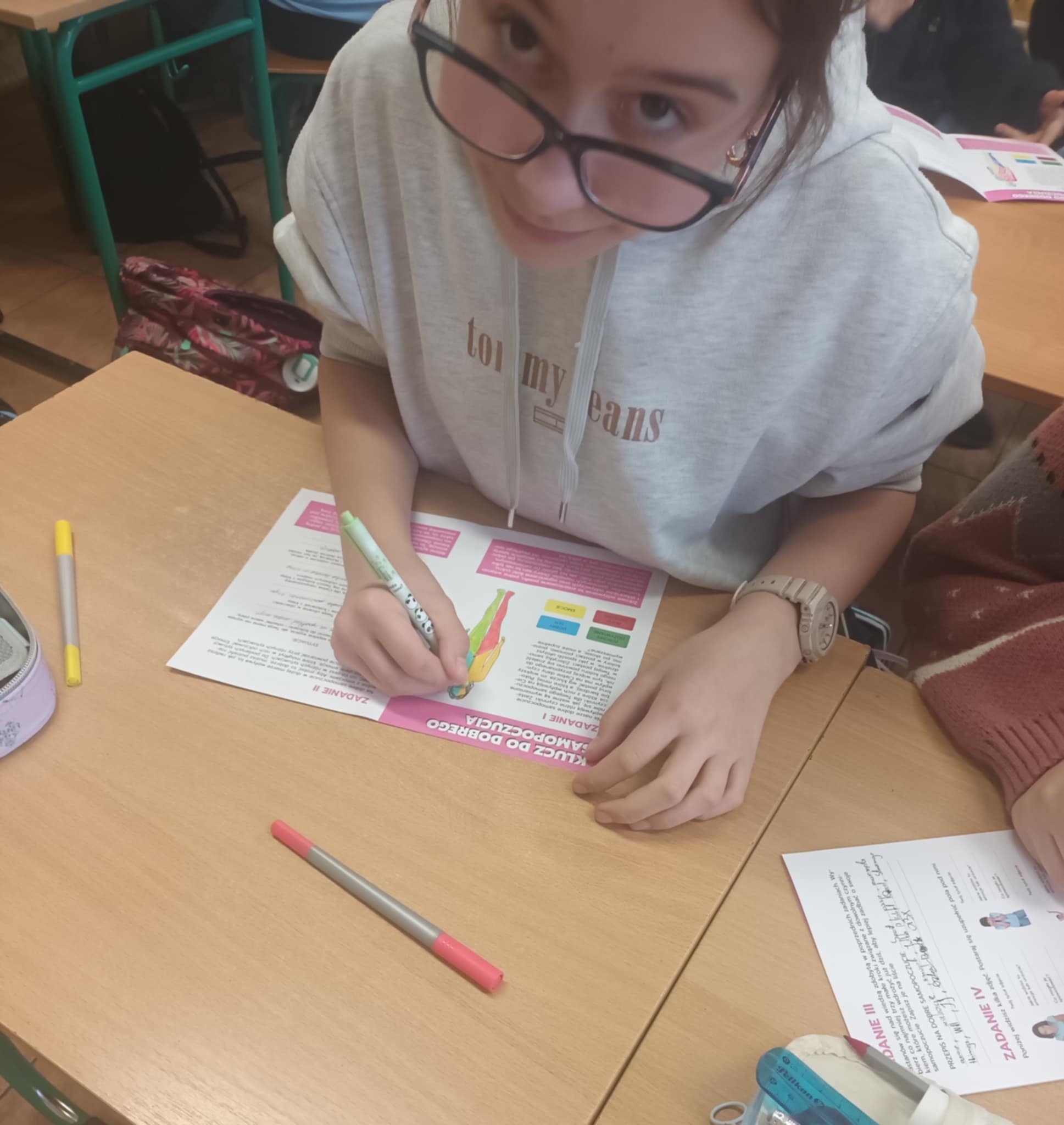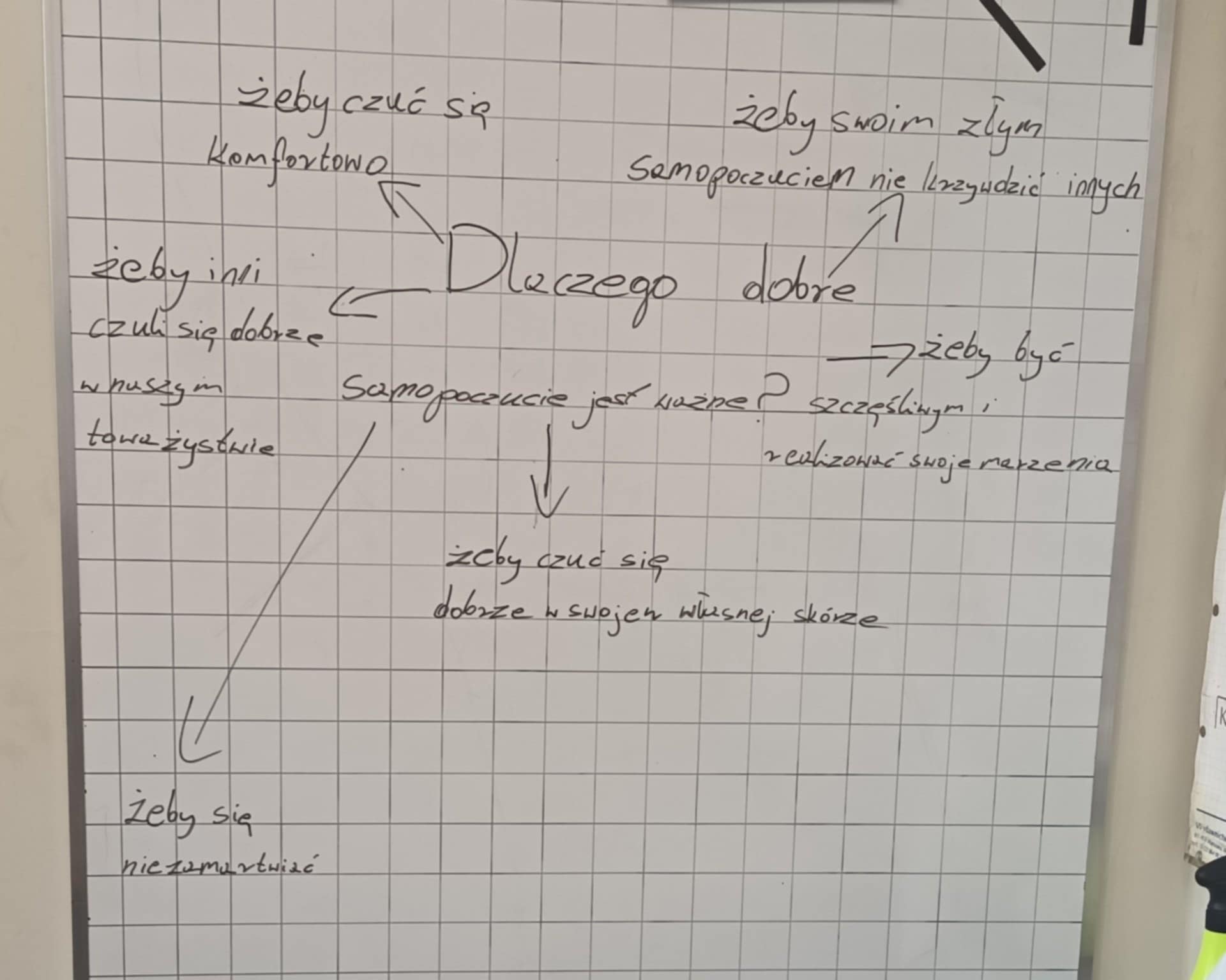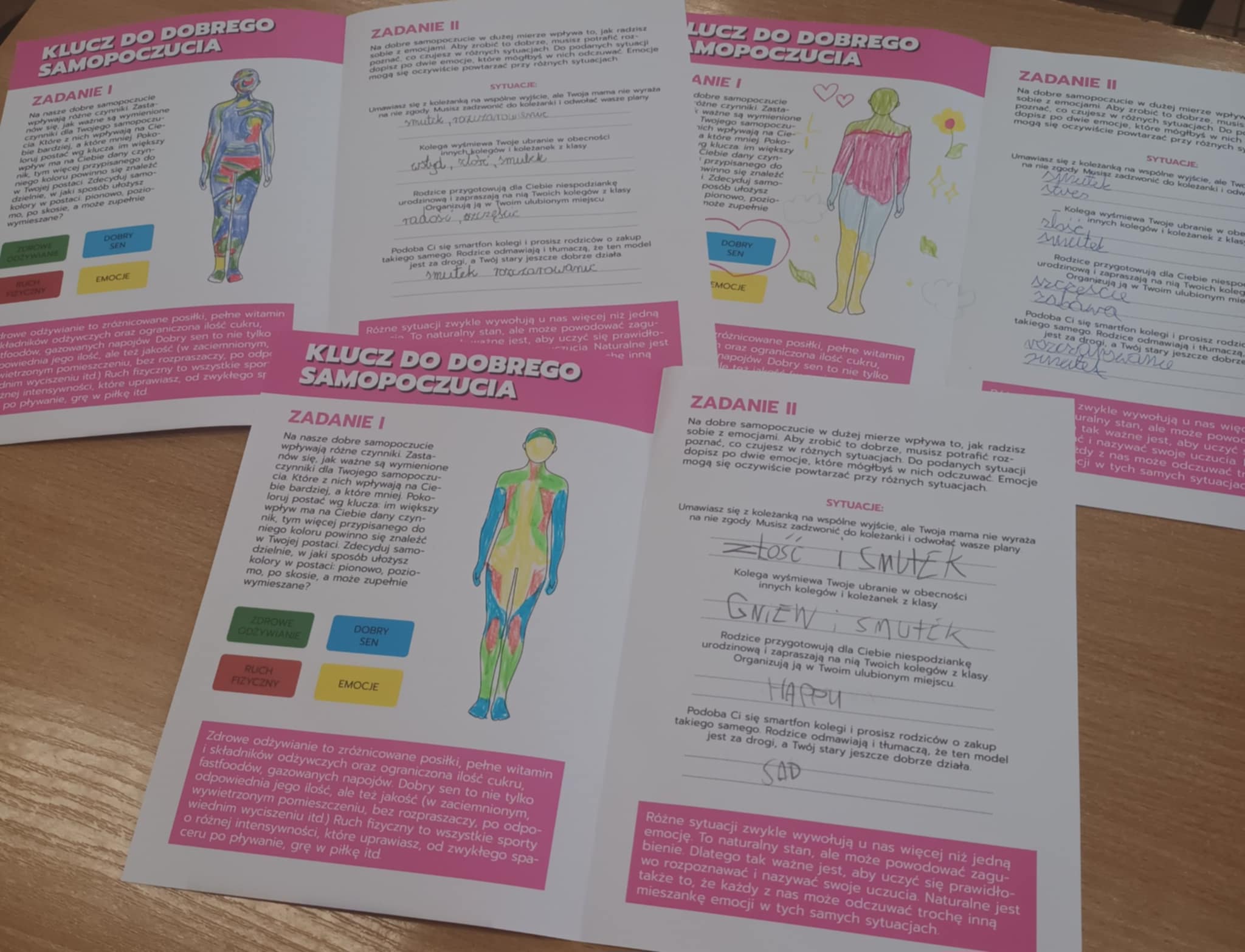 Podczas zajęć uczniowie dowiedzieli się, co wpływa na dobre samopoczucie i jak ważne jest ono w naszym życiu. Mówiono także o tym, że prośba o pomoc nie jest powodem do wstydu oraz podkreślono znaczenie emocji i ich roli w codziennym funkcjonowaniu.