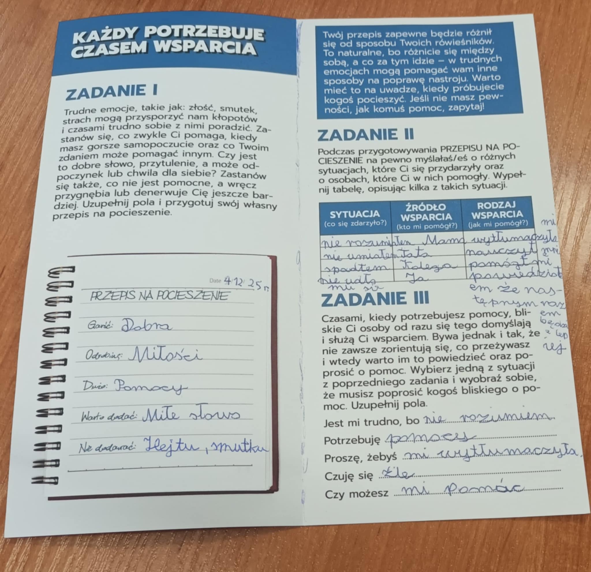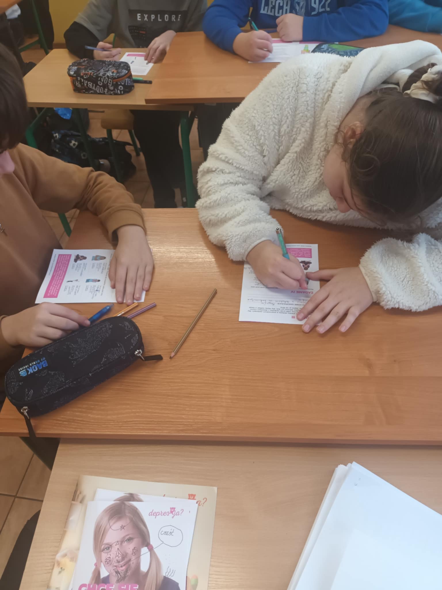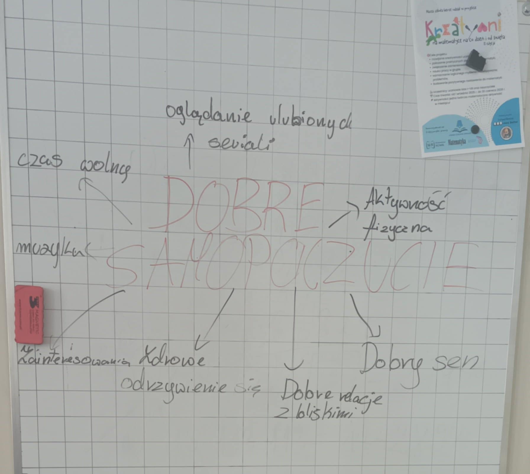 Podczas zajęć uczniowie dowiedzieli się, co wpływa na dobre samopoczucie i jak ważne jest ono w naszym życiu. Mówiono także o tym, że prośba o pomoc nie jest powodem do wstydu oraz podkreślono znaczenie emocji i ich roli w codziennym funkcjonowaniu.