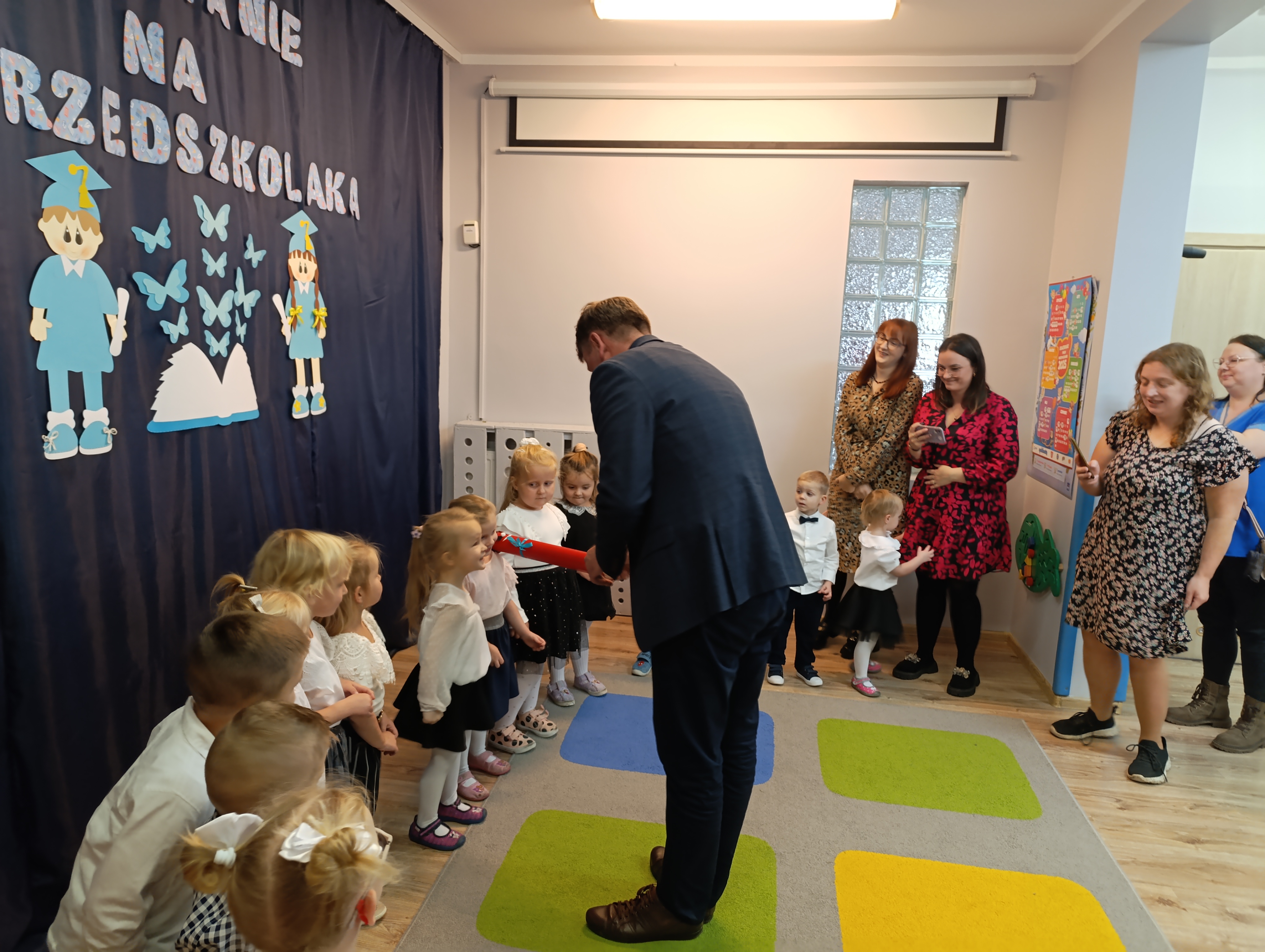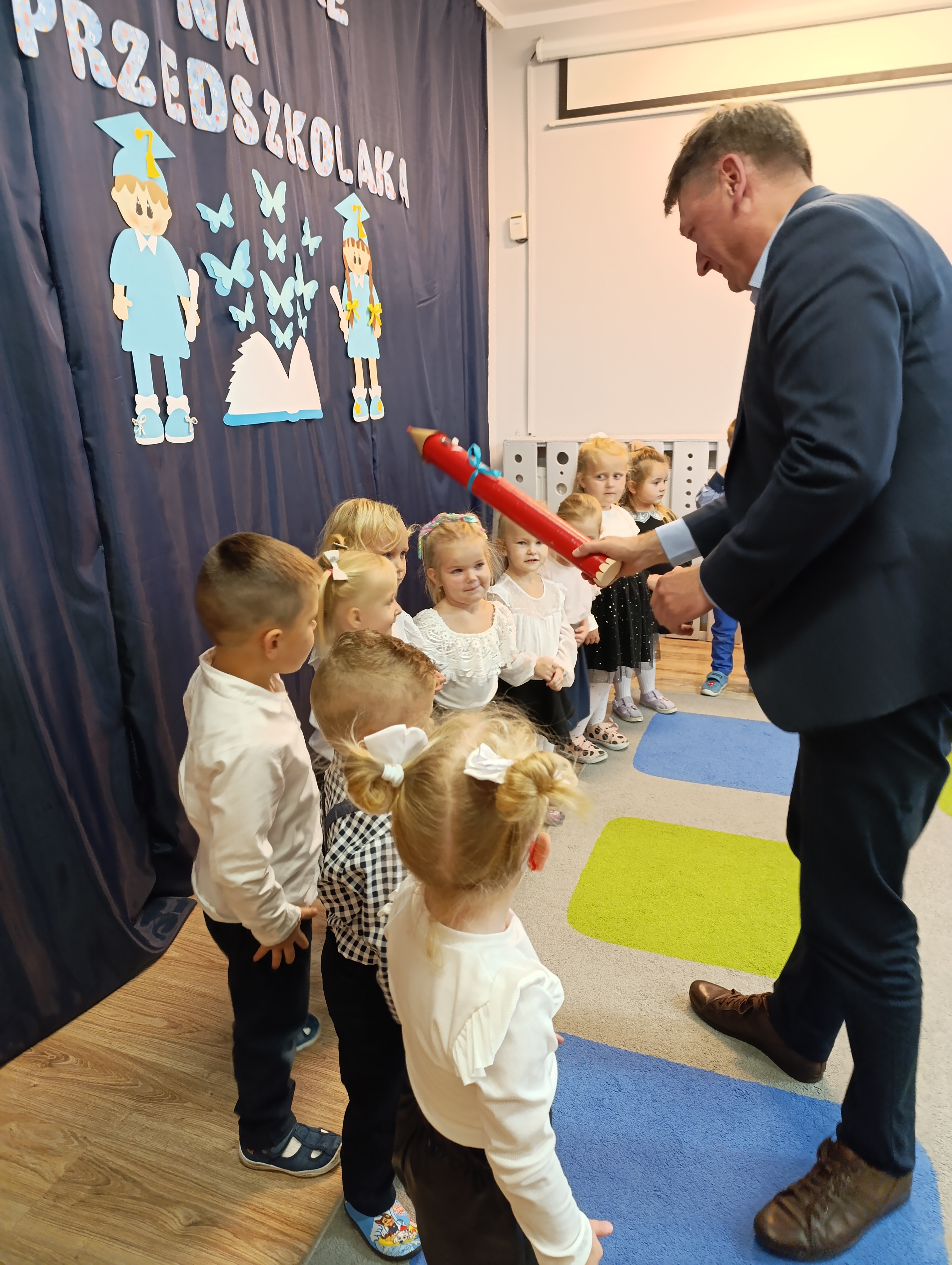 W naszym przedszkolu odbyła się wyjątkowa uroczystość – Pasowanie na Przedszkolaka! To ważny dzień dla wszystkich dzieci. Podczas uroczystości maluchy zaprezentowały przygotowany program artystyczny – śpiewały piosenki, recytowały wierszyki i dzielnie występowały przed publicznością. Na zakończenie Pan Dyrektor dokonała uroczystego pasowania na przedszkolaka, dotykając ramienia każdego dziecka „czarodziejskim ołówkiem”. Dzieci otrzymały pamiątkowe dyplomy i drobne upominki, a na ich buziach nie znikał uśmiech i duma z bycia prawdziwym przedszkolakiem!