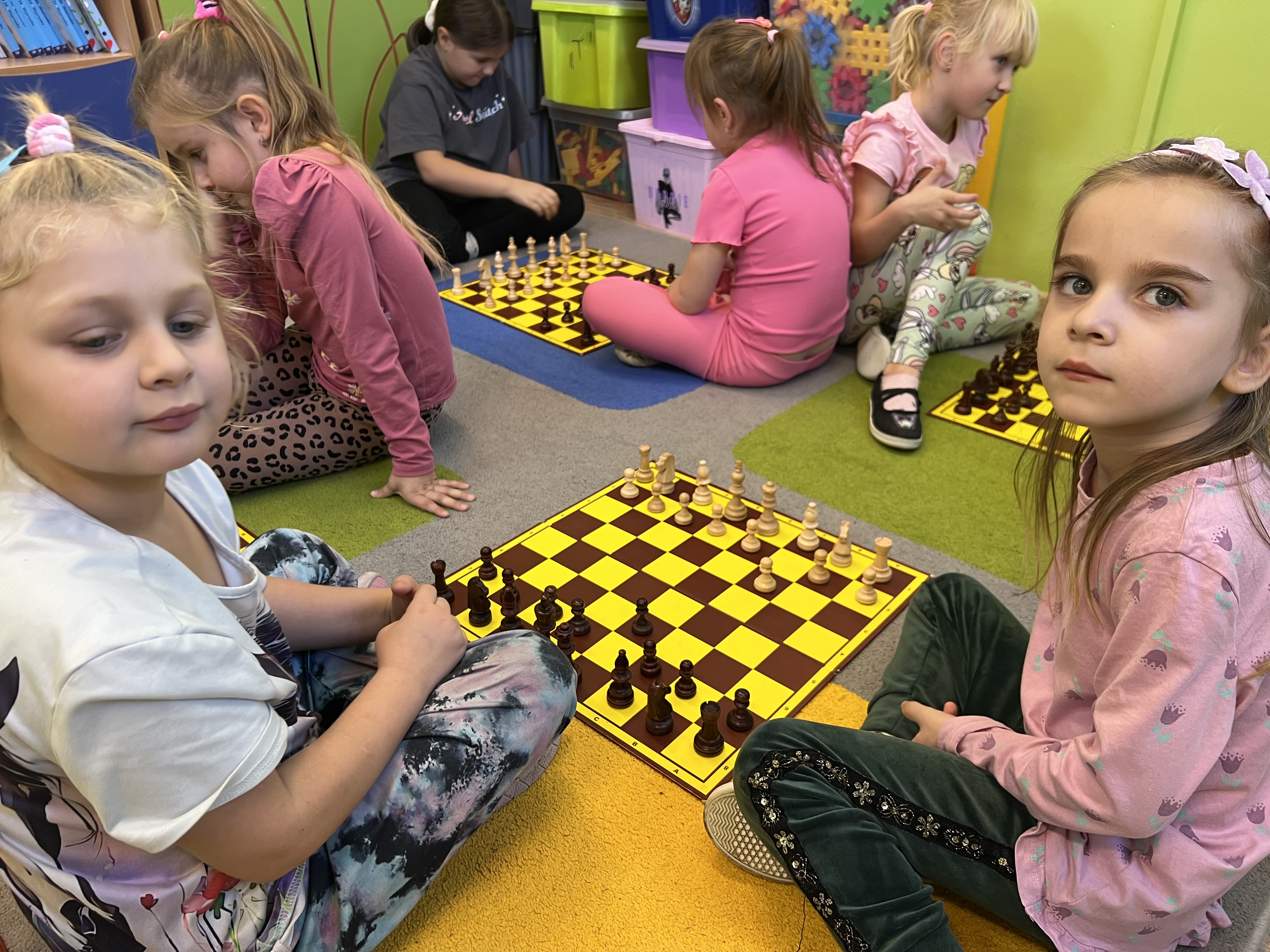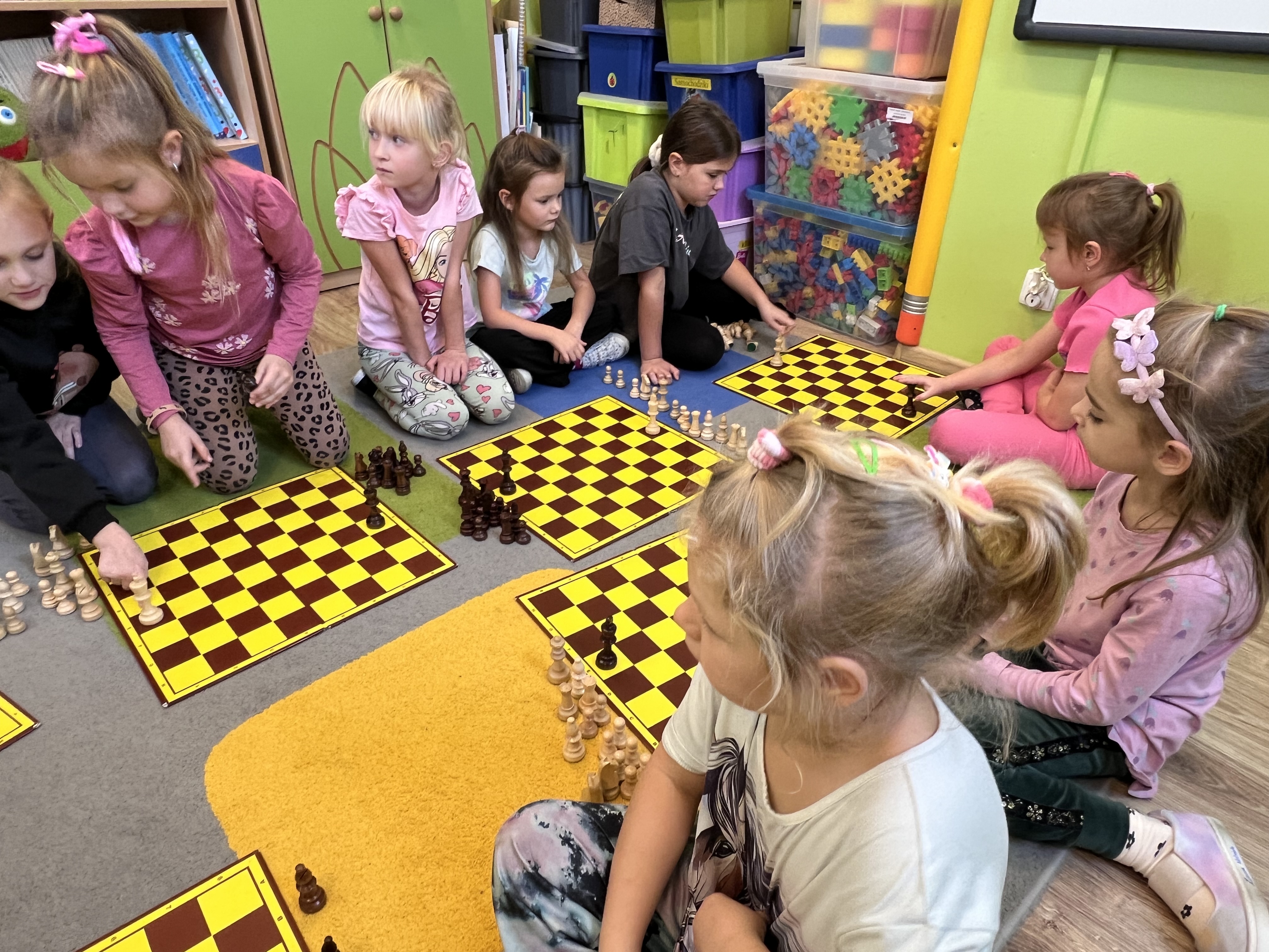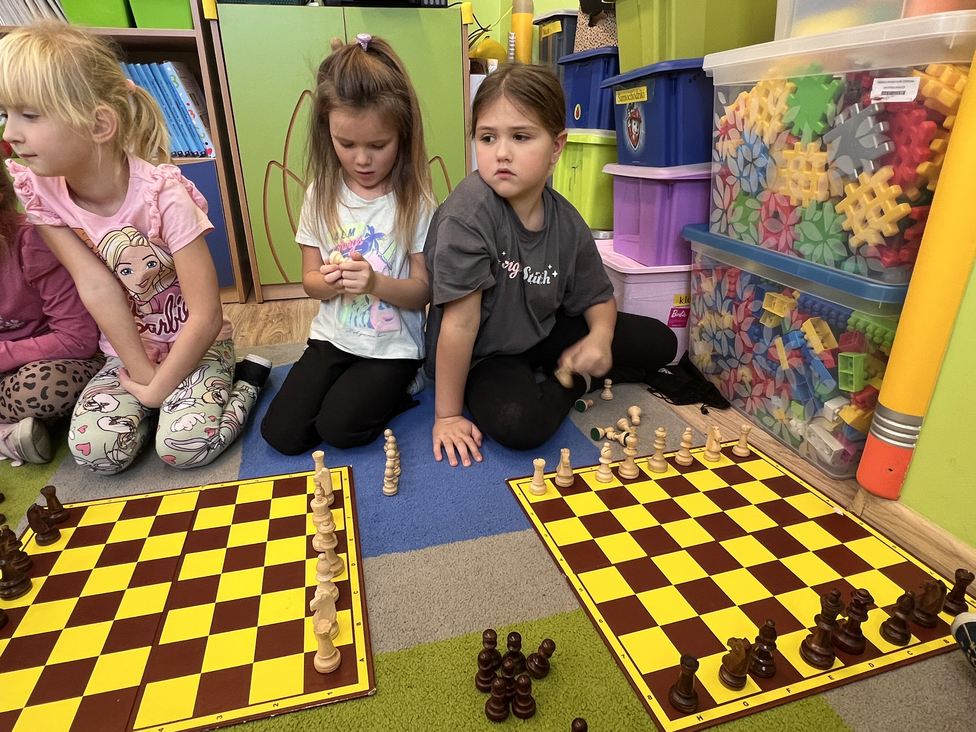 Dziś po raz kolejny dzieci z grupy „Tygryski” miały okazję uczyć się gry w szachy. Podczas zajęć poznawały figury szachowe, uczyły się zasad poruszania pionkami i próbowały swoich sił w pierwszych partiach. Nauka została poprowadzona w ciekawy i przystępny sposób, który wprowadził dzieci w fascynujący świat tej królewskiej gry.Było dużo radości, skupienia i zabawy!
