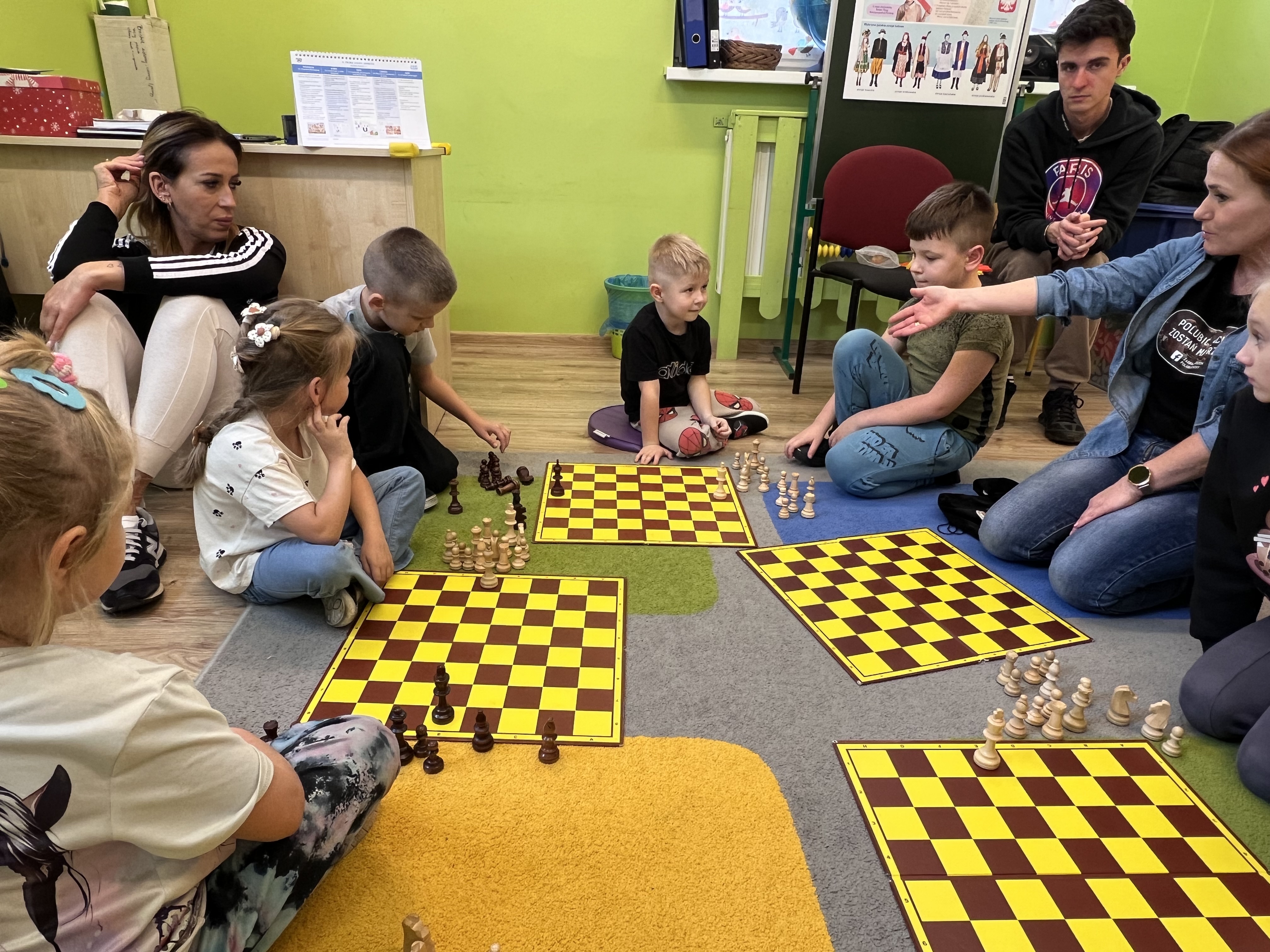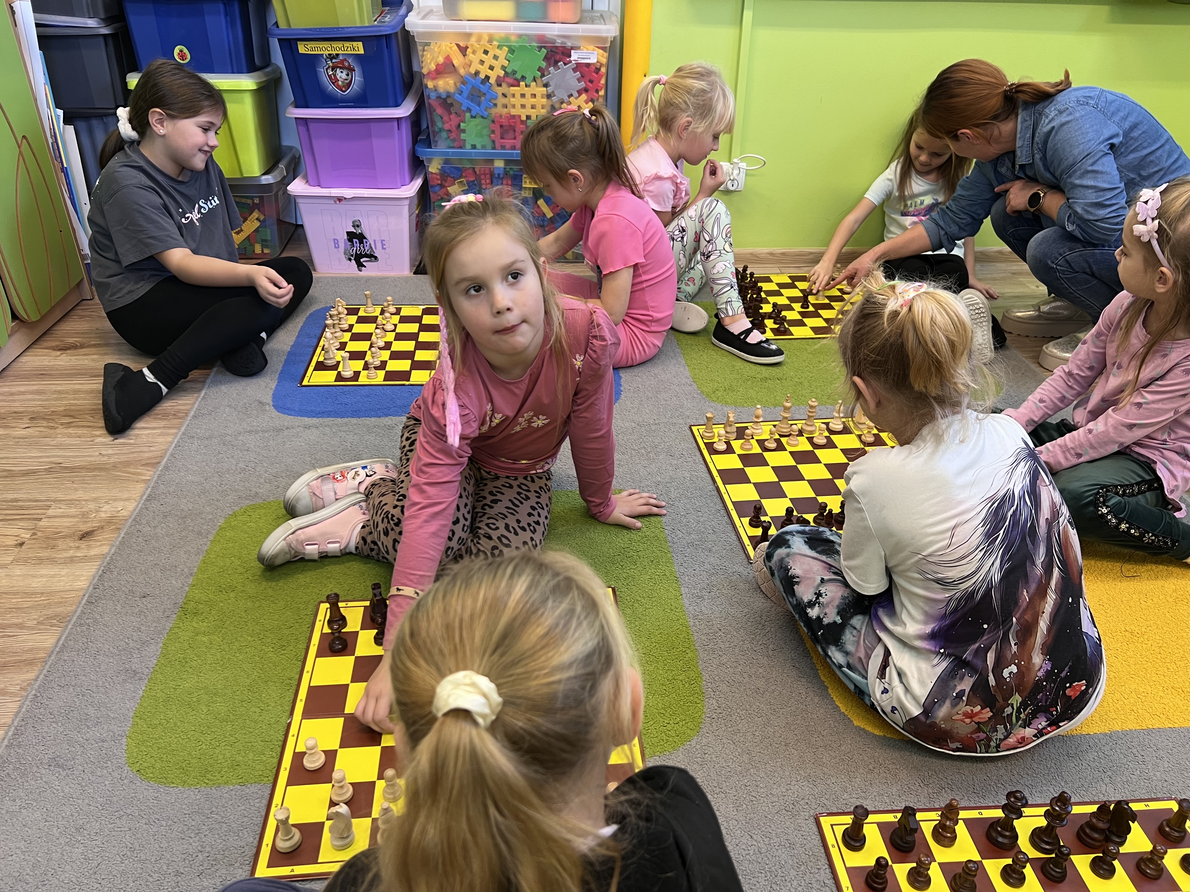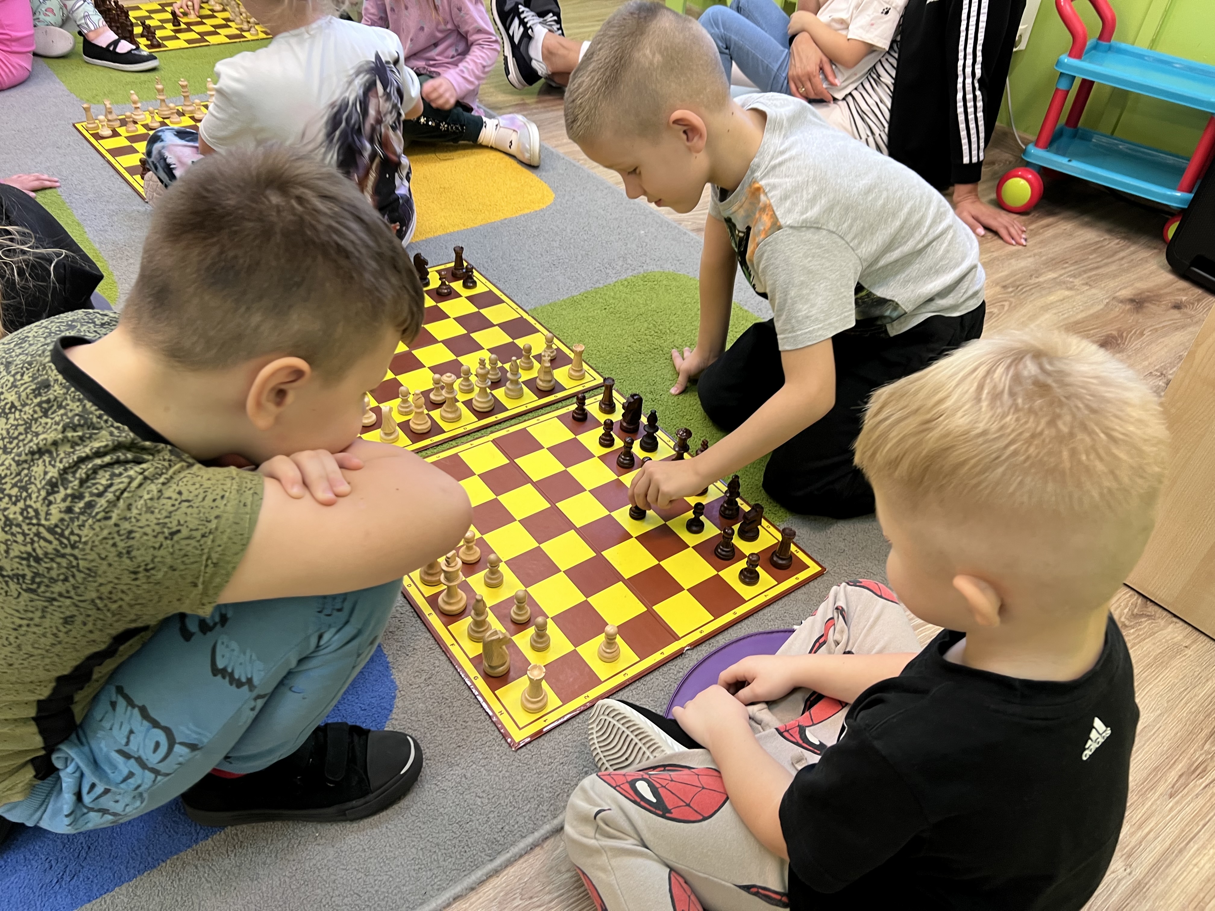 Dziś po raz kolejny dzieci z grupy „Tygryski” miały okazję uczyć się gry w szachy. Podczas zajęć poznawały figury szachowe, uczyły się zasad poruszania pionkami i próbowały swoich sił w pierwszych partiach. Nauka została poprowadzona w ciekawy i przystępny sposób, który wprowadził dzieci w fascynujący świat tej królewskiej gry.Było dużo radości, skupienia i zabawy!