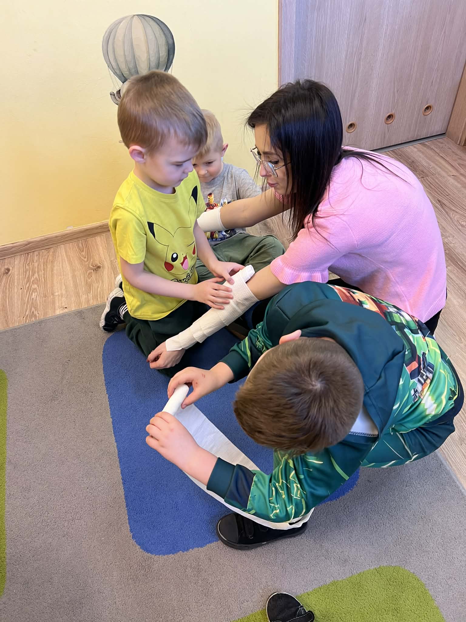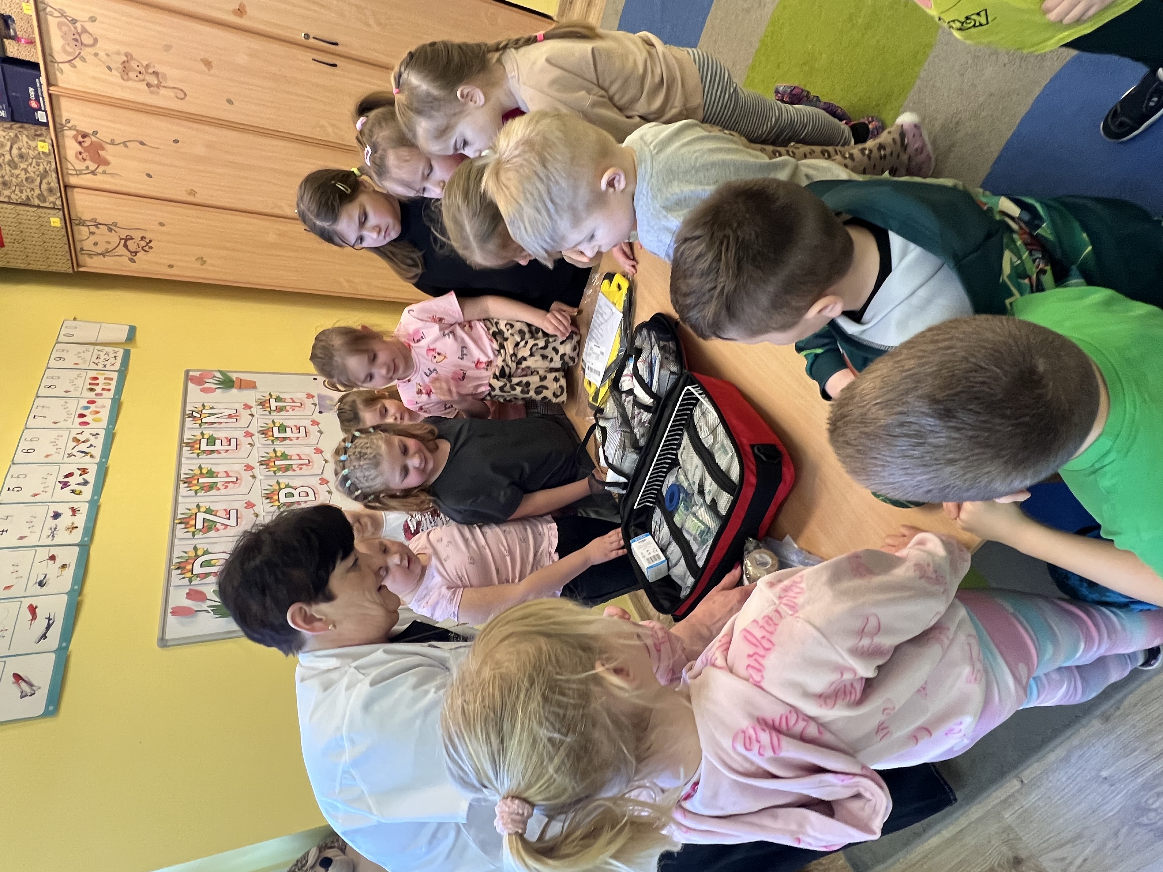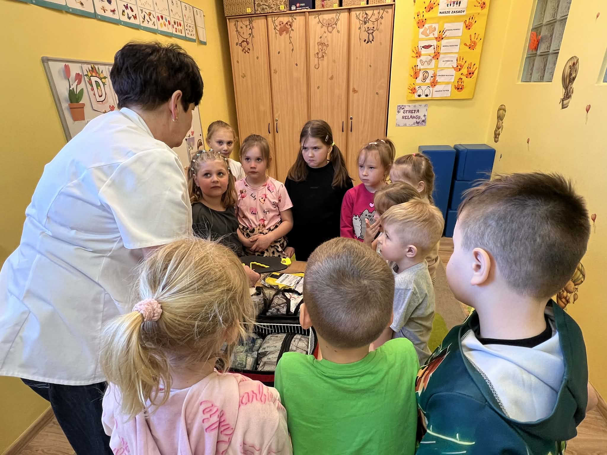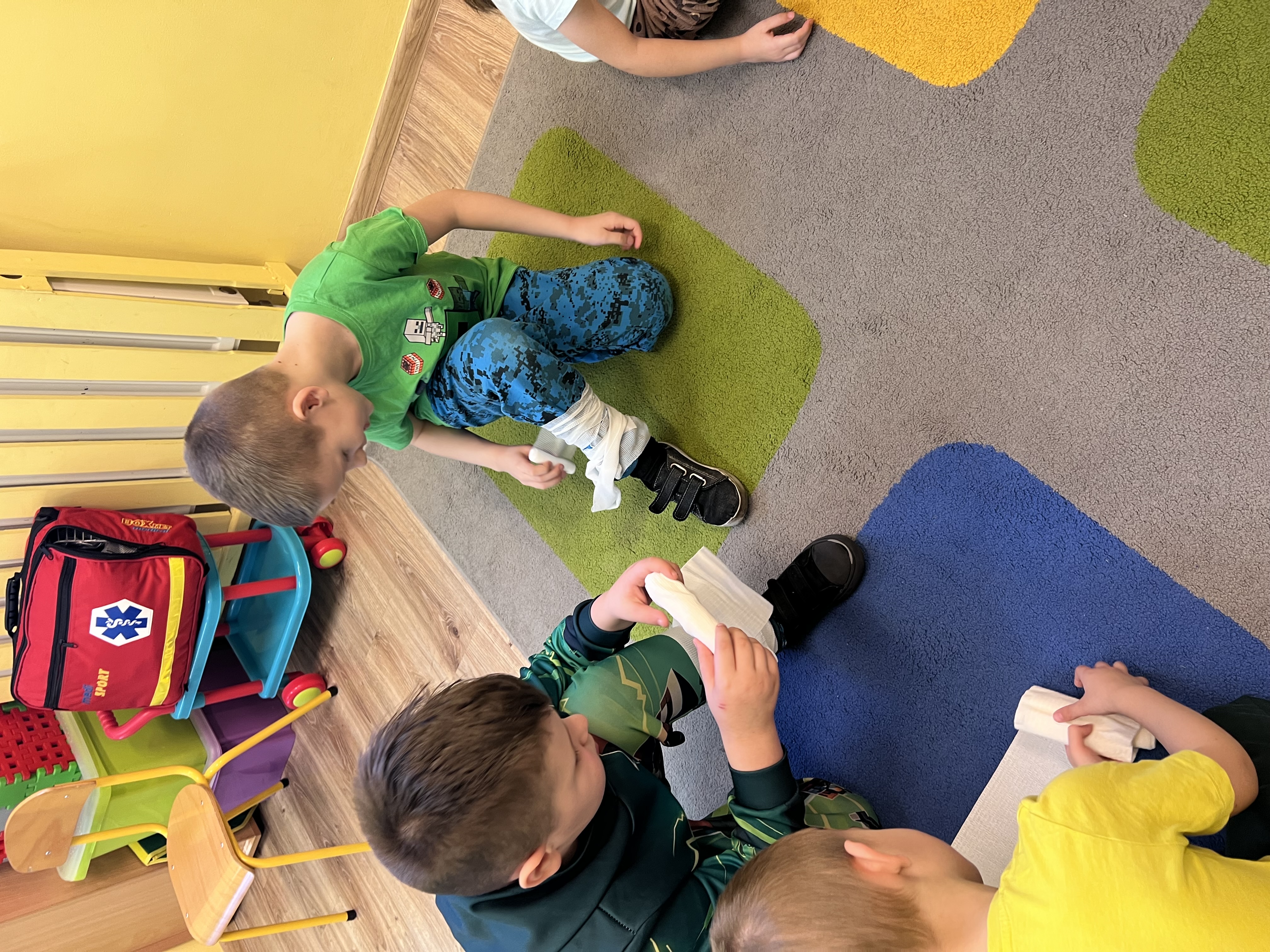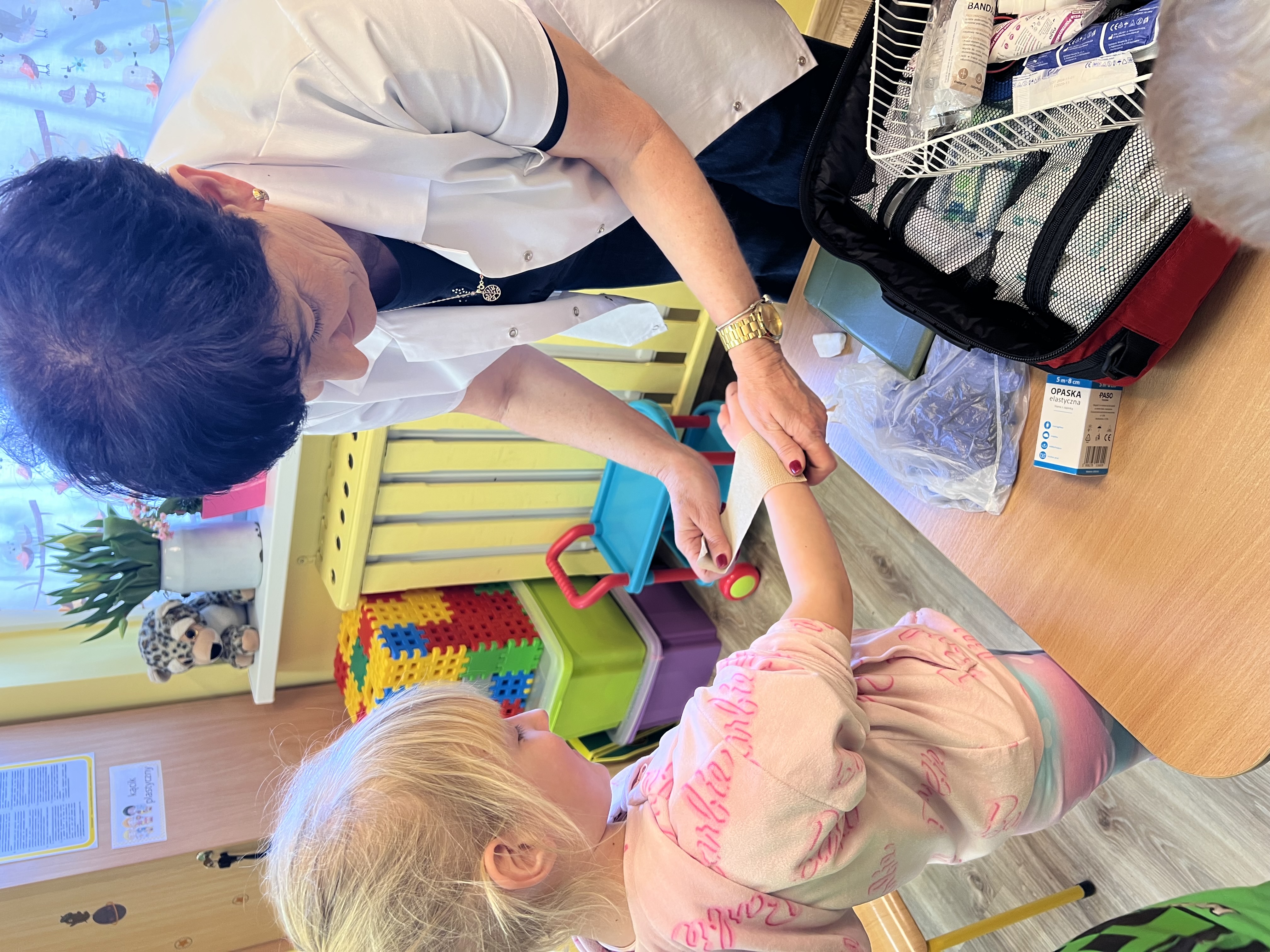 9 marca w przedszkolu w grupie „Tygryski” odbyło się spotkanie z pielęgniarką – panią Magdaleną Owedyk. Podczas wizyty dzieci miały okazję poznać zawartość apteczki oraz dowiedzieć się, do czego służą znajdujące się w niej materiały opatrunkowe. Przedszkolaki przypomniały sobie również numer alarmowy, z którego można skorzystać w sytuacji zagrożenia. Następnie dzieci wzięły udział w części praktycznej – uczyły się podstaw pierwszej pomocy, ćwicząc bandażowanie. Z dużym zaangażowaniem owijały bandażami ręce i nogi kolegów oraz koleżanek. Spotkanie było bardzo ciekawe i pouczające, a dzieci w praktyczny sposób poznały zasady udzielania pierwszej pomocy.