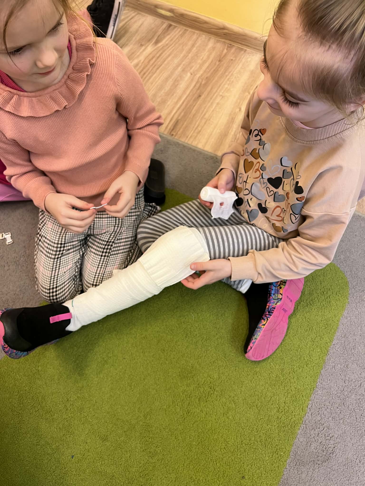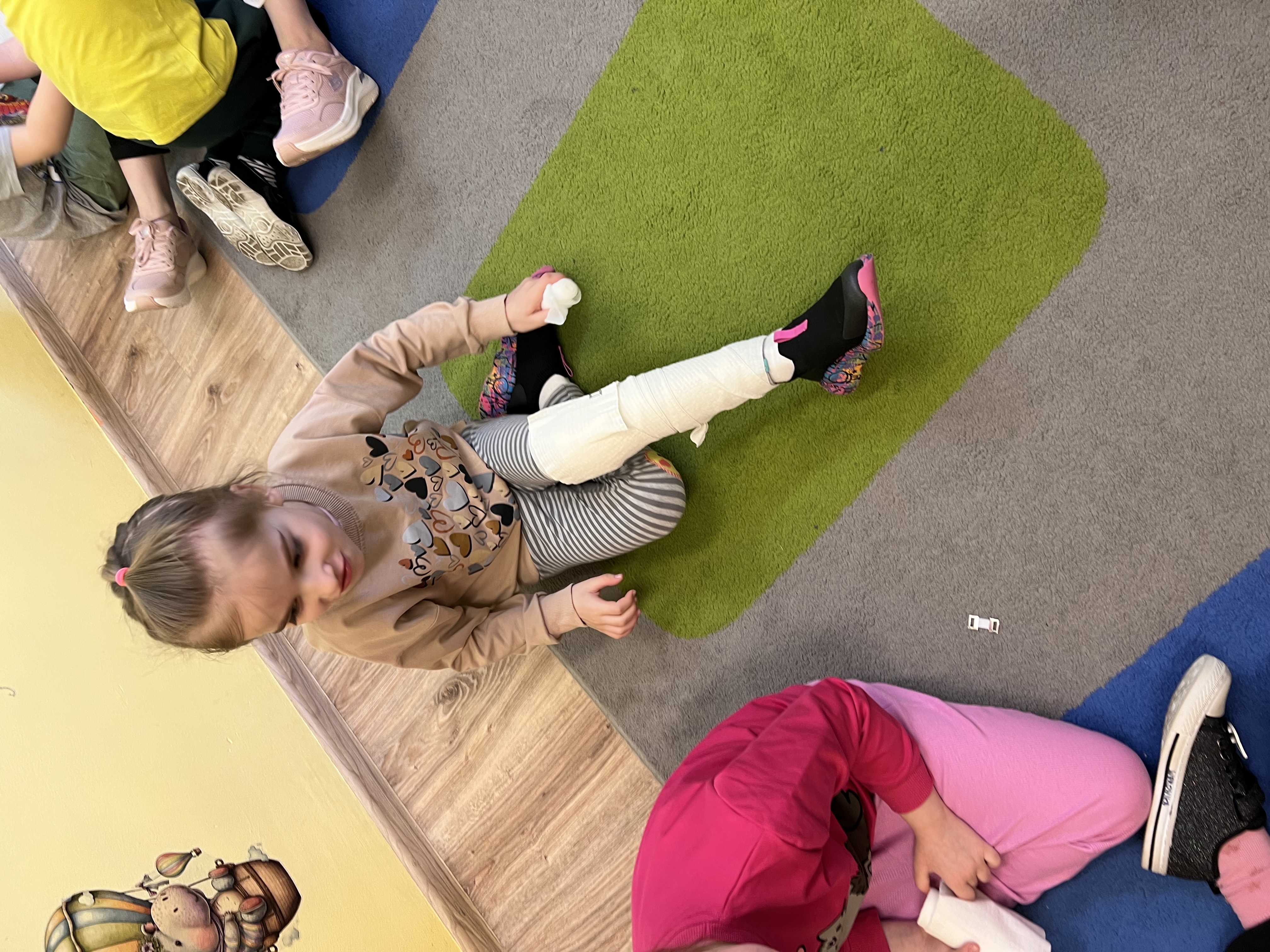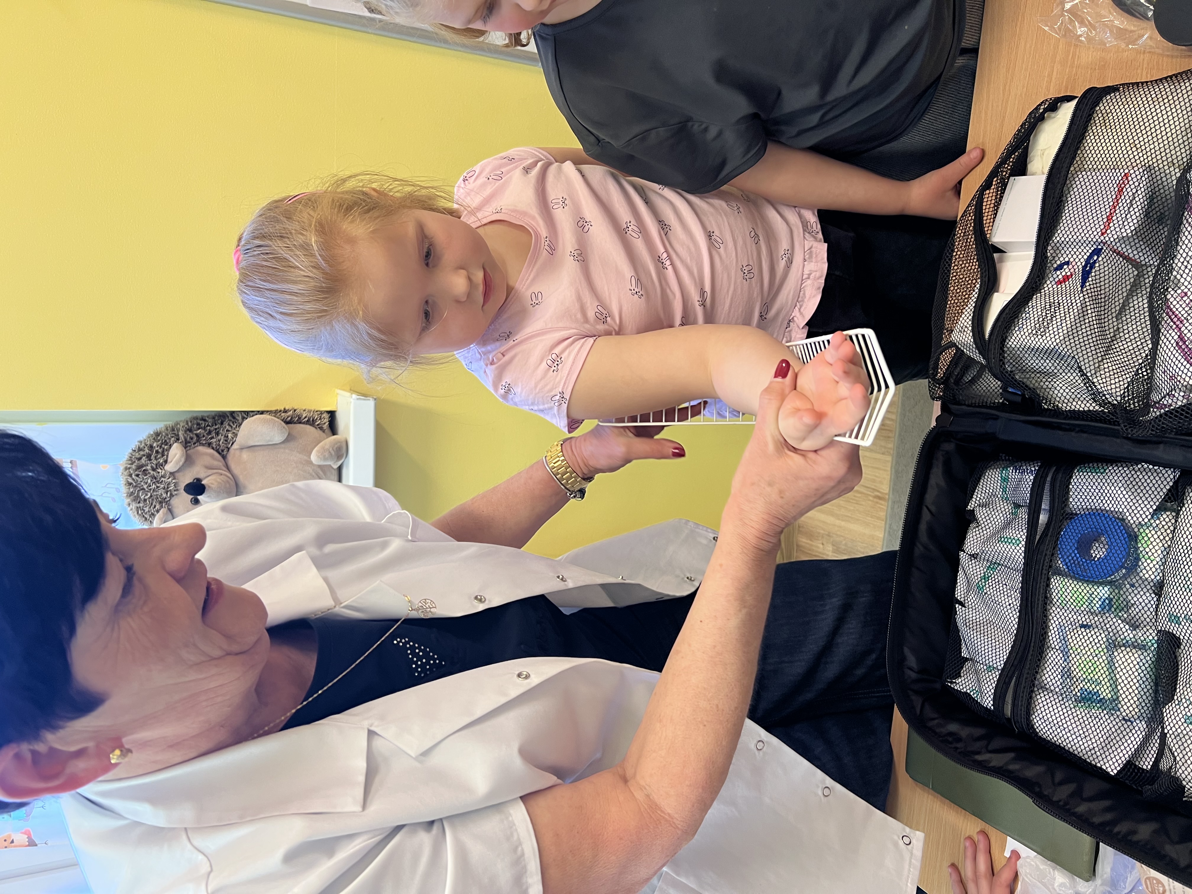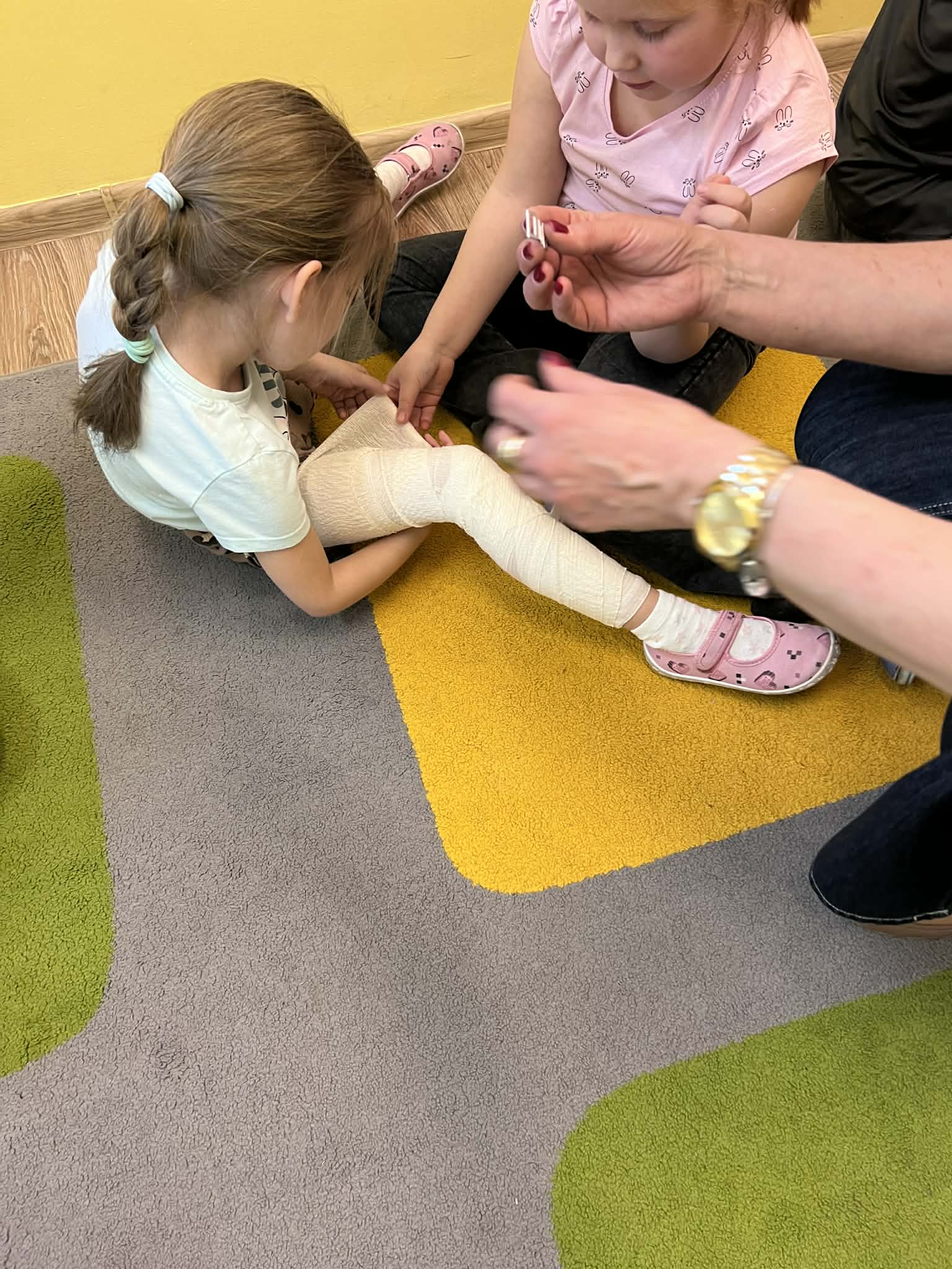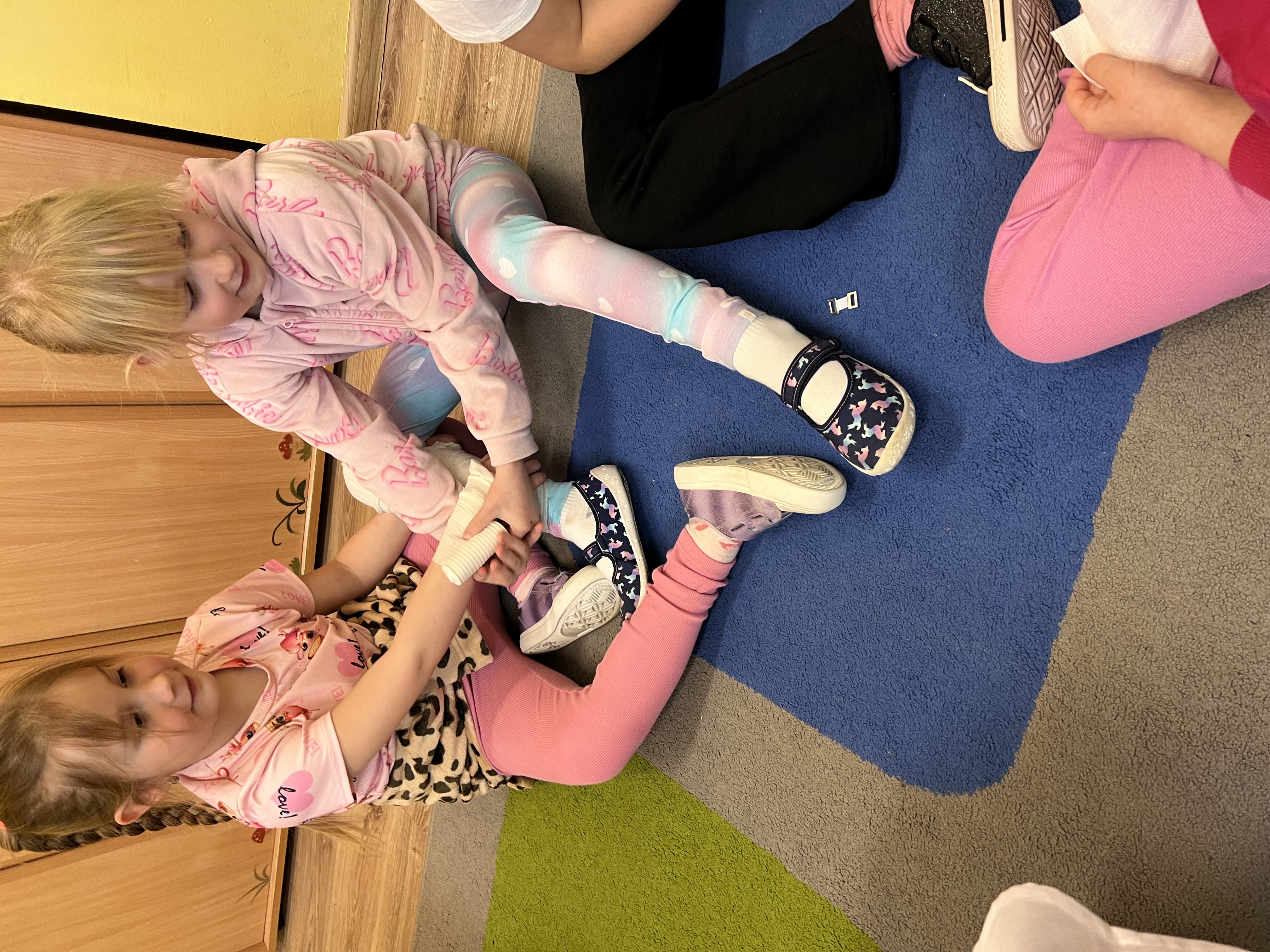 9 marca w przedszkolu w grupie „Tygryski” odbyło się spotkanie z pielęgniarką – panią Magdaleną Owedyk. Podczas wizyty dzieci miały okazję poznać zawartość apteczki oraz dowiedzieć się, do czego służą znajdujące się w niej materiały opatrunkowe. Przedszkolaki przypomniały sobie również numer alarmowy, z którego można skorzystać w sytuacji zagrożenia. Następnie dzieci wzięły udział w części praktycznej – uczyły się podstaw pierwszej pomocy, ćwicząc bandażowanie. Z dużym zaangażowaniem owijały bandażami ręce i nogi kolegów oraz koleżanek. Spotkanie było bardzo ciekawe i pouczające, a dzieci w praktyczny sposób poznały zasady udzielania pierwszej pomocy.