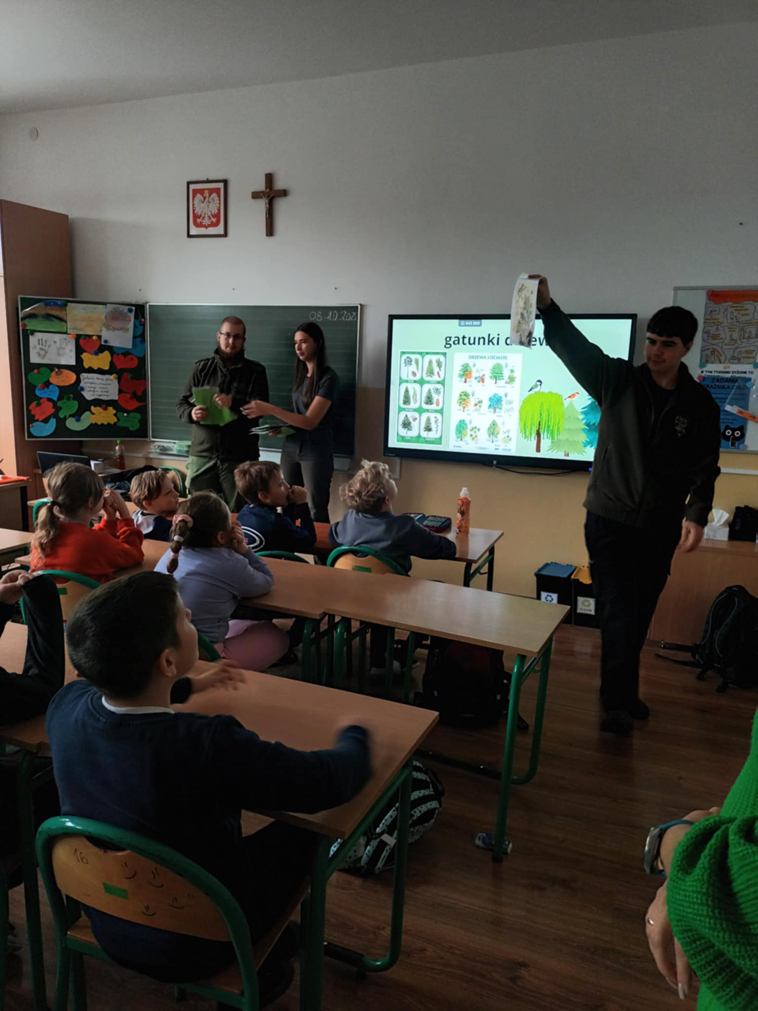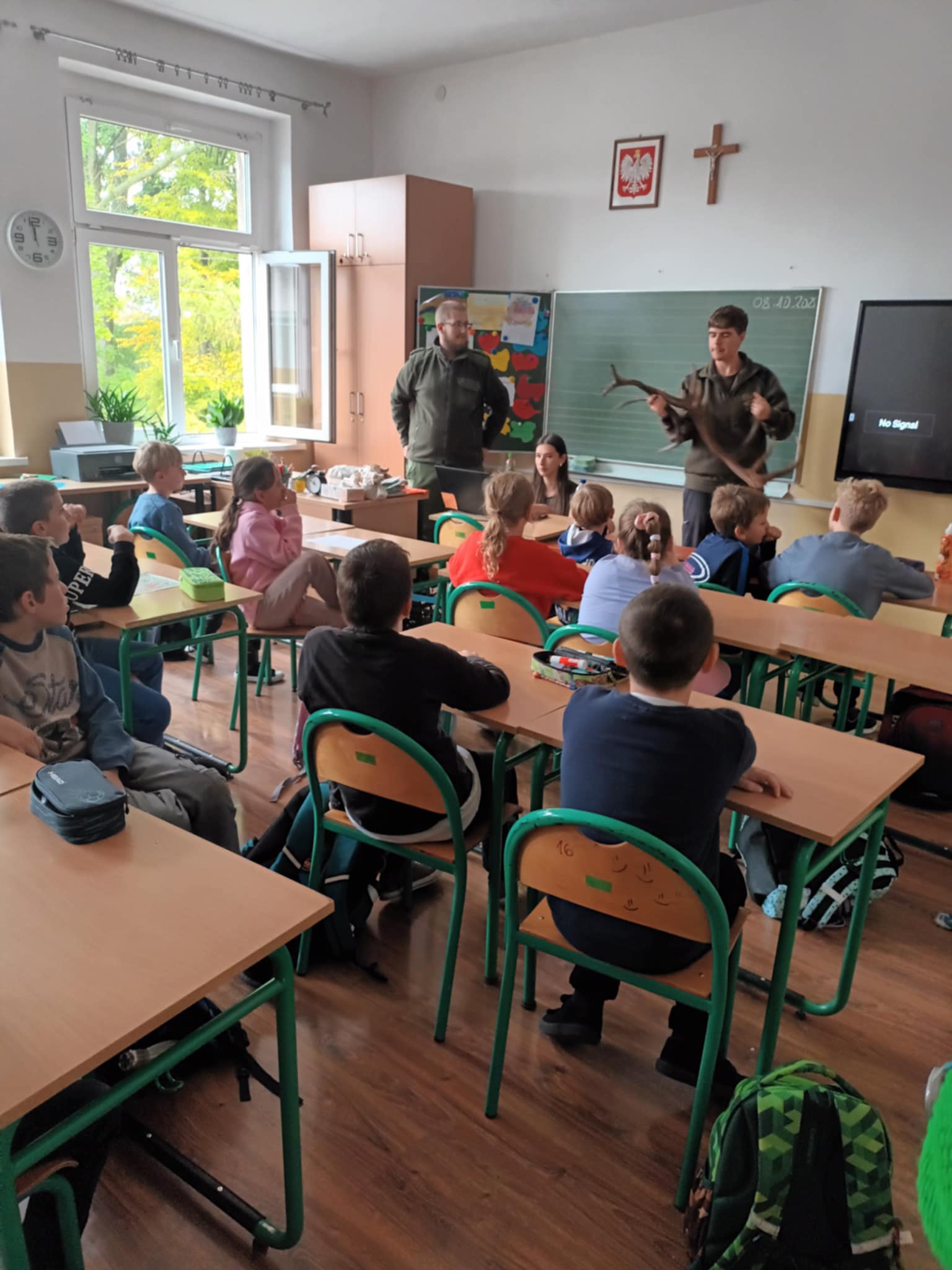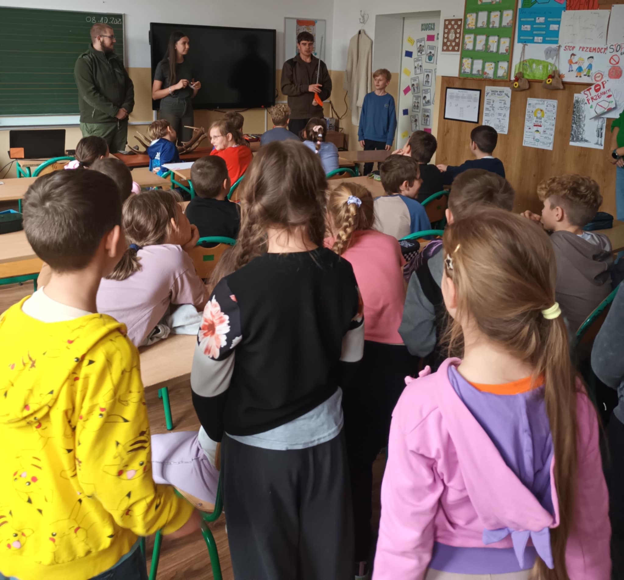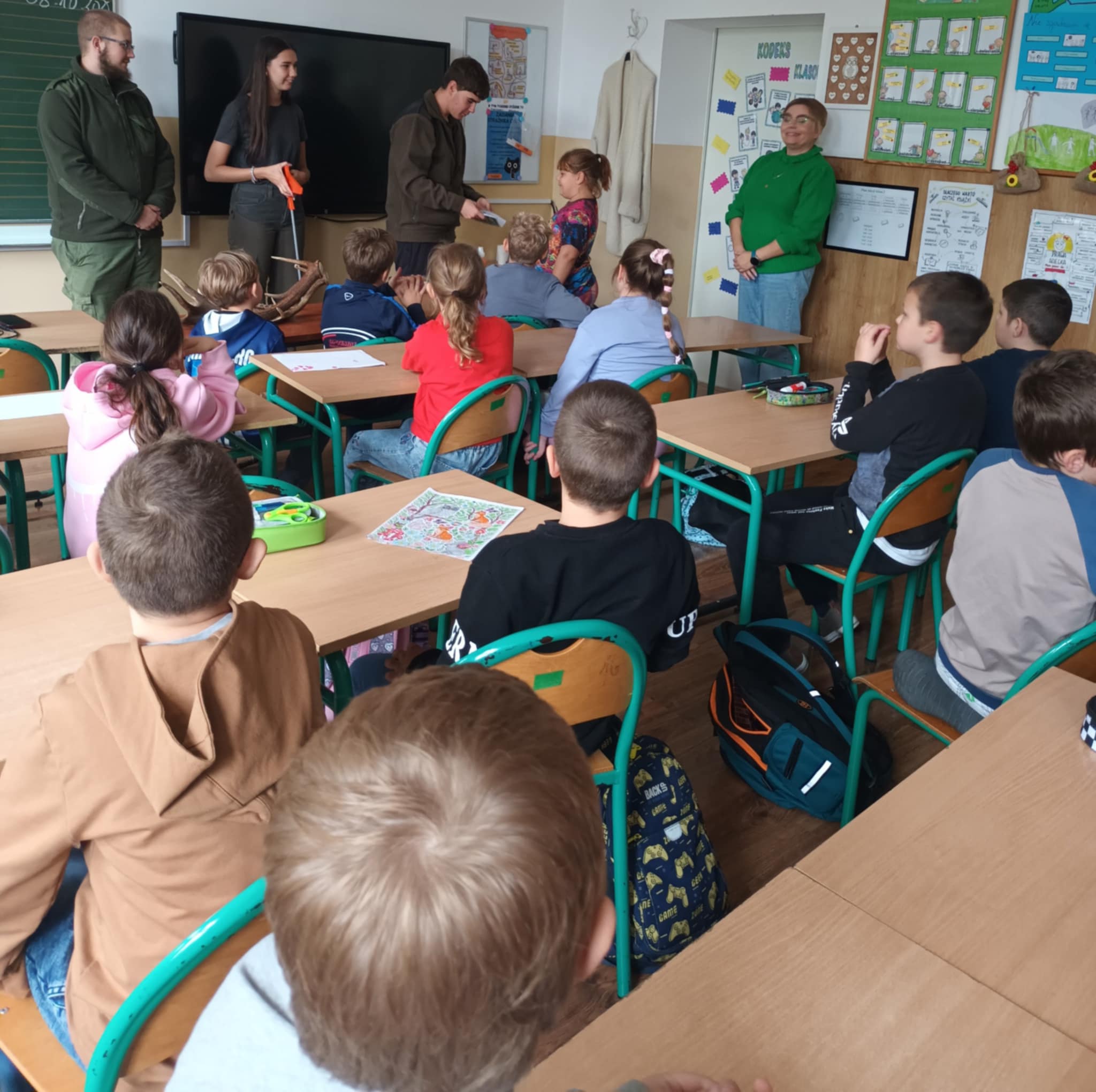 Dziś naszą szkołę odwiedzili uczniowie Zespołu Szkół Weterynaryjno-Przyrodniczych w Kobylnikach o kierunku leśnik. Młodzi leśnicy poprowadzili dla naszych uczniów kl. I-III interesujące zajęcia na temat zasad panujących w lesie. Dzieci miały okazję rozpoznawać różne rodzaje liści i poroża, a także dowiedzieć się czegoś więcej o grzybach. Na zakończenie spotkania został rozstrzygnięty konkurs plastyczny, którego celem było najpiękniejsze pokolorowanie rysunku przedstawiającego las.