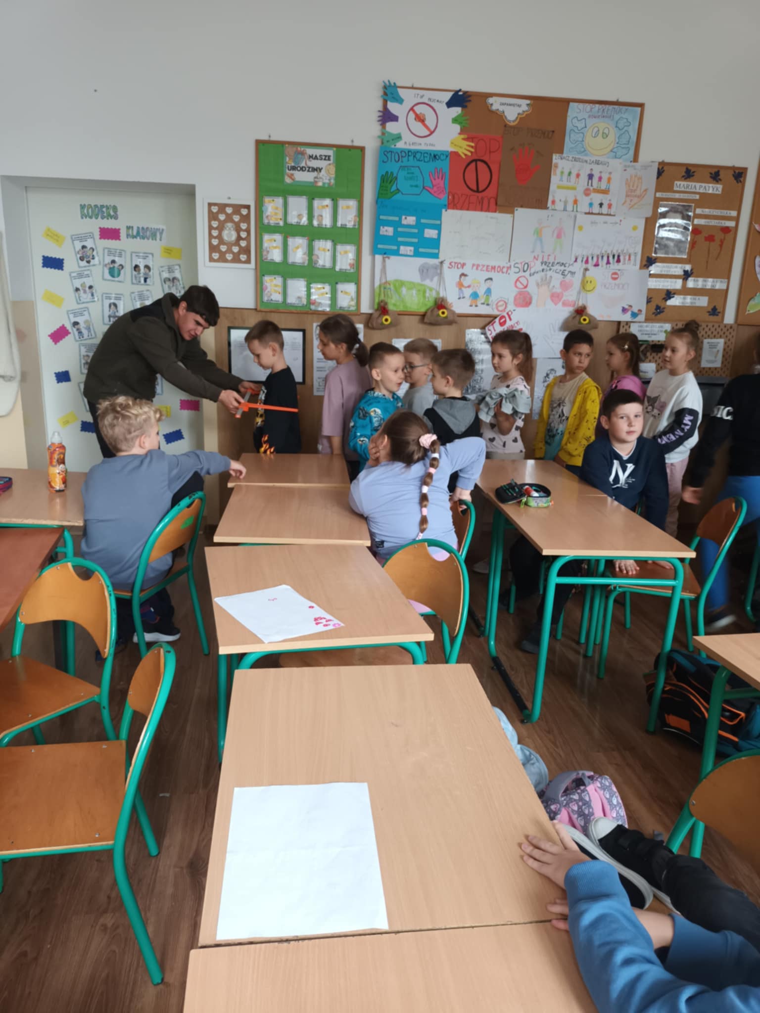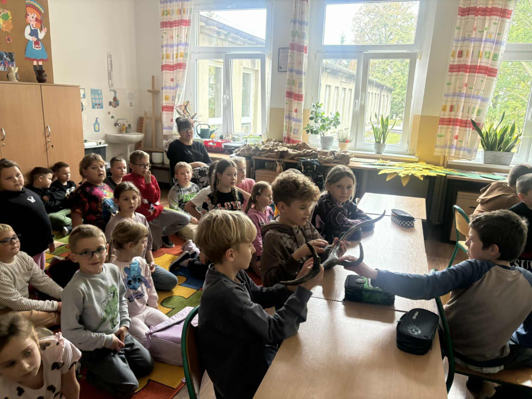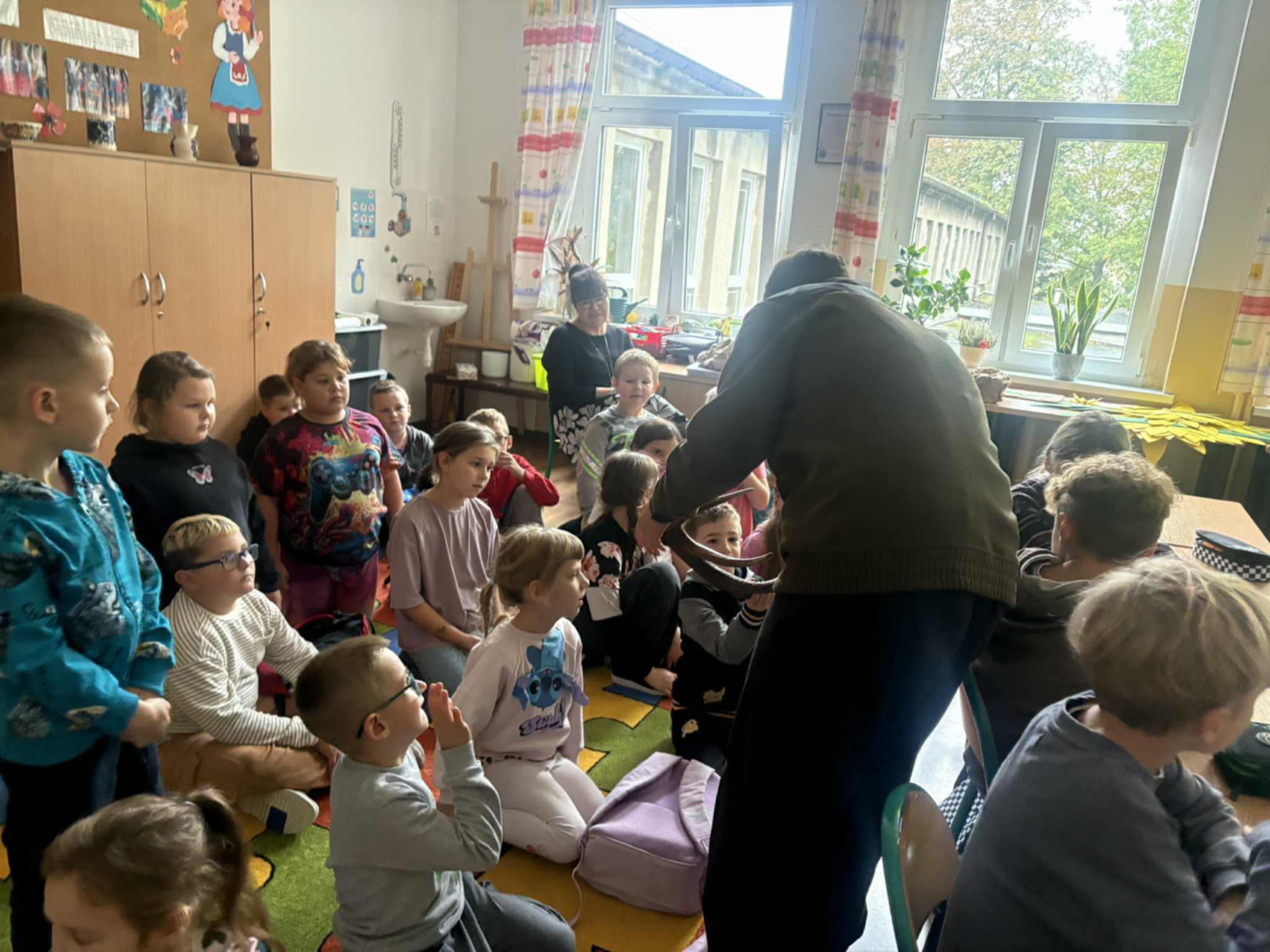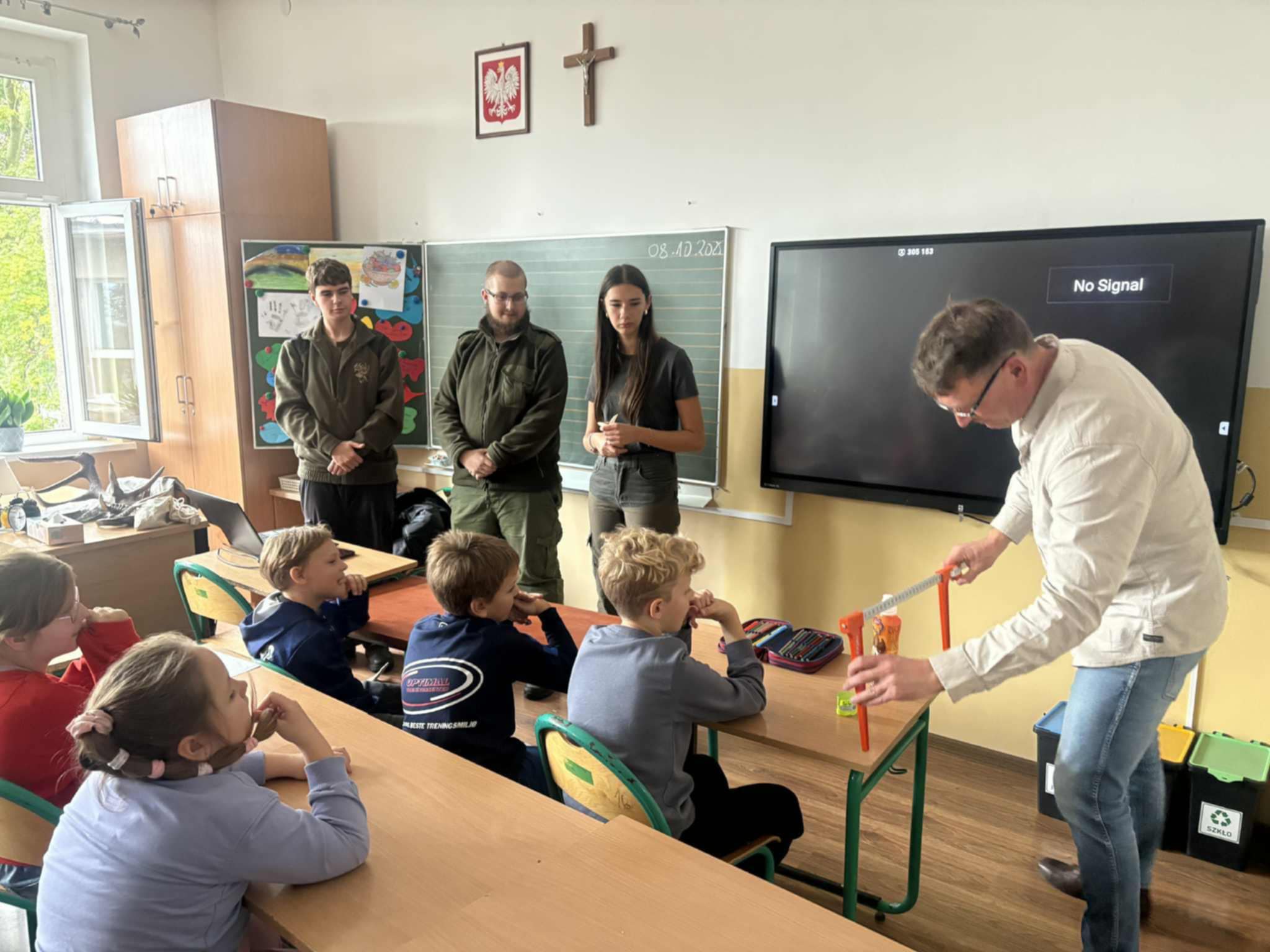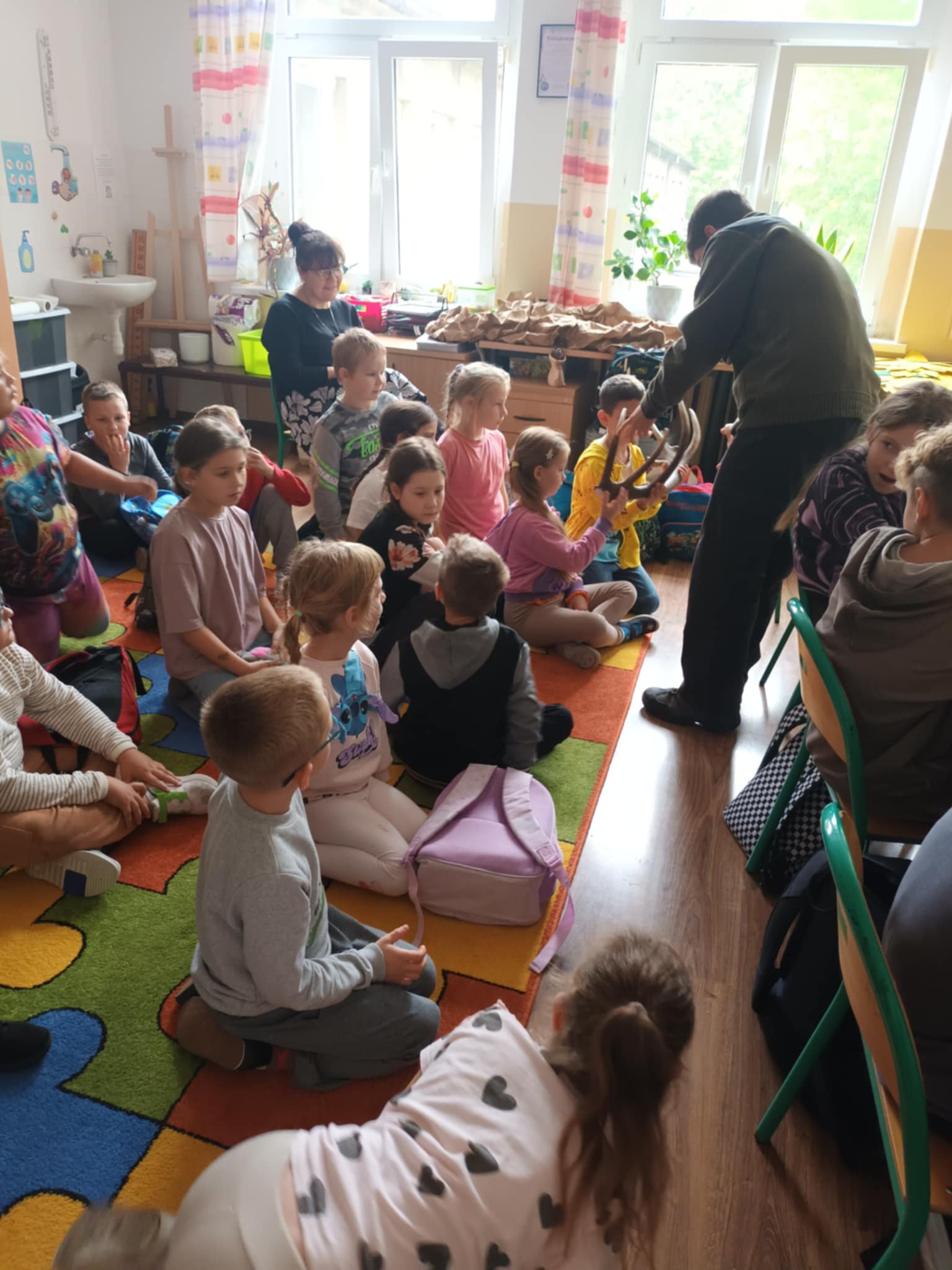 Dziś naszą szkołę odwiedzili uczniowie Zespołu Szkół Weterynaryjno-Przyrodniczych w Kobylnikach o kierunku leśnik. Młodzi leśnicy poprowadzili dla naszych uczniów kl. I-III interesujące zajęcia na temat zasad panujących w lesie. Dzieci miały okazję rozpoznawać różne rodzaje liści i poroża, a także dowiedzieć się czegoś więcej o grzybach. Na zakończenie spotkania został rozstrzygnięty konkurs plastyczny, którego celem było najpiękniejsze pokolorowanie rysunku przedstawiającego las.