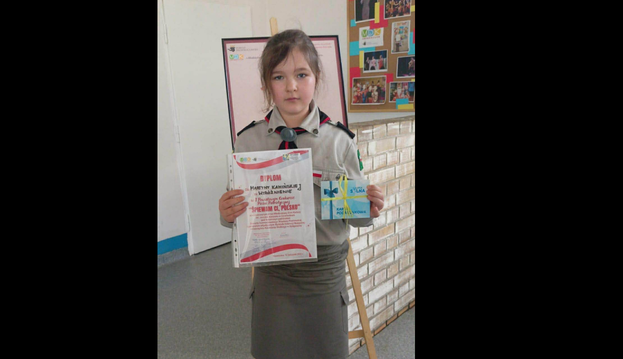 Z ogromną radością informujemy, że Martyna Kamińska, uczennica klasy 5 naszej szkoły, zdobyła wyróżnienie w I Powiatowym Konkursie Pieśni Patriotycznej „Śpiewam Ci, Polsko”. Wydarzenie zostało zorganizowane przez Młodzieżowy Dom Kultury im. Janusza Korczaka w Inowrocławiu, pod honorowym patronatem Starosty Inowrocławskiego Wiesławy Pawłowskiej oraz patronatem artystycznym Wydziału Edukacji Muzycznej Uniwersytetu Kazimierza Wielkiego w Bydgoszczy.