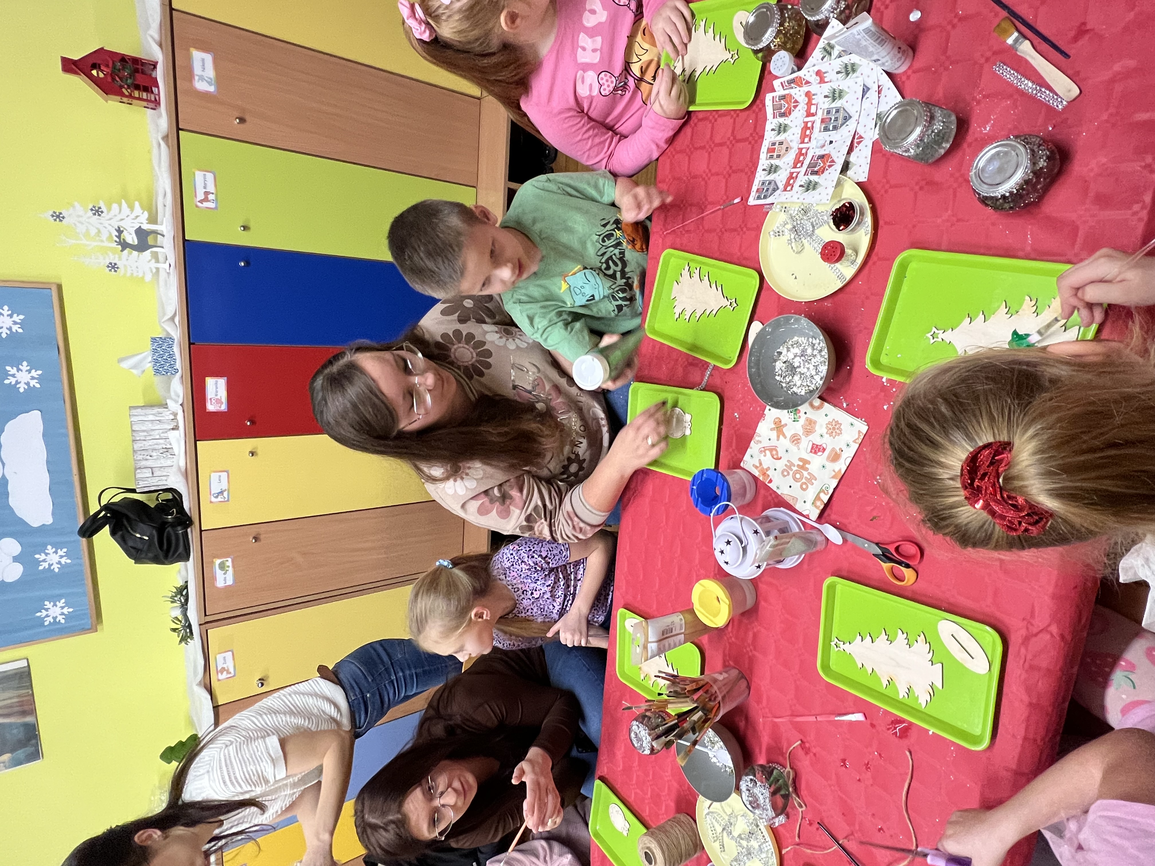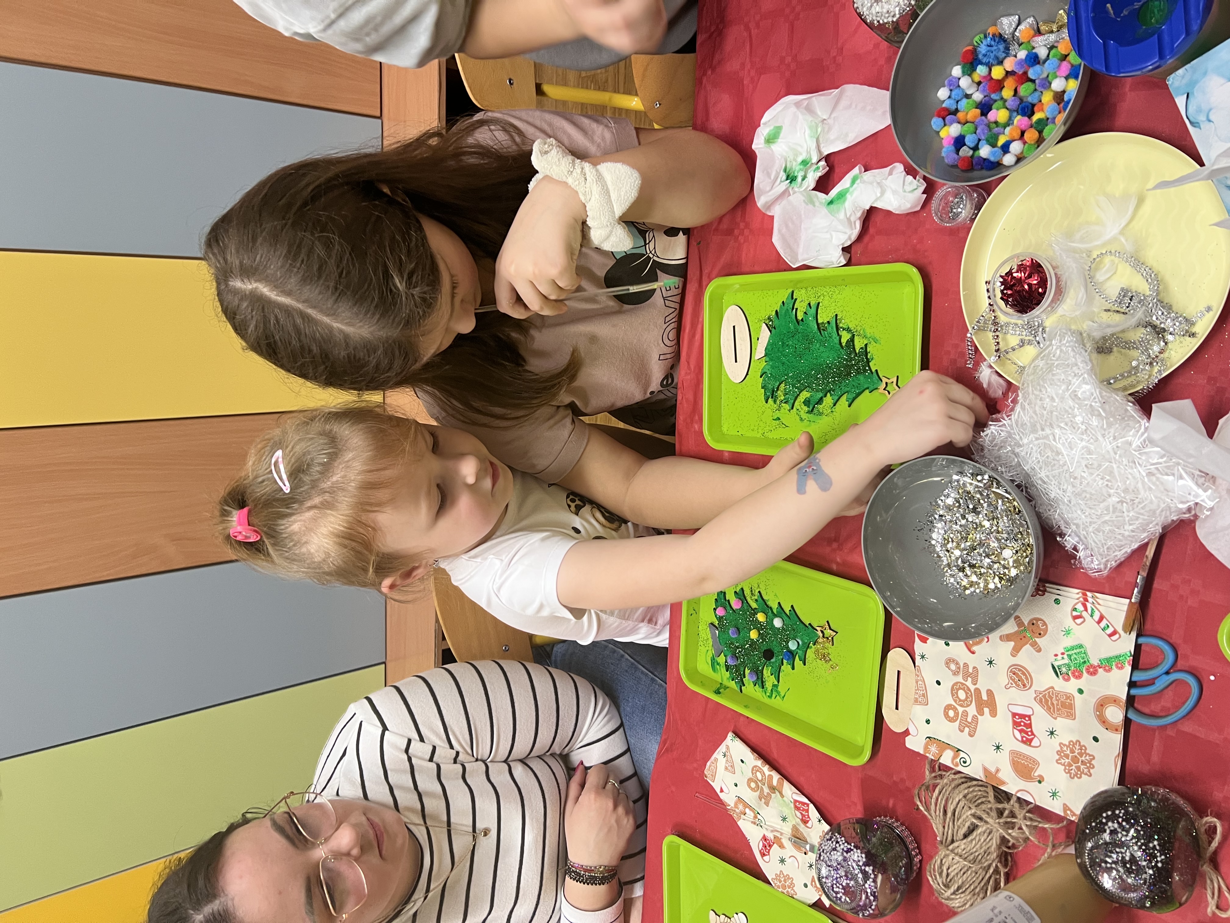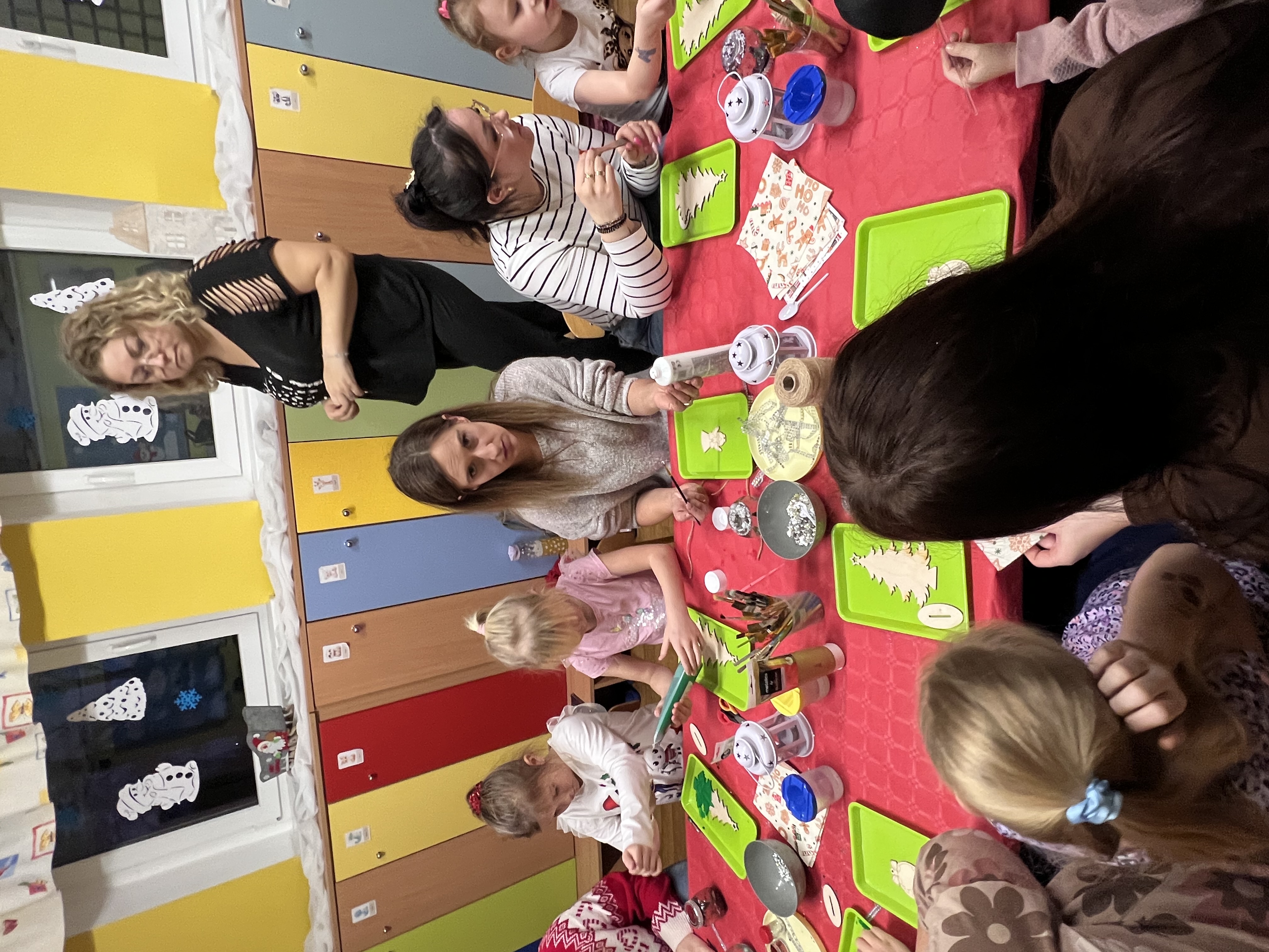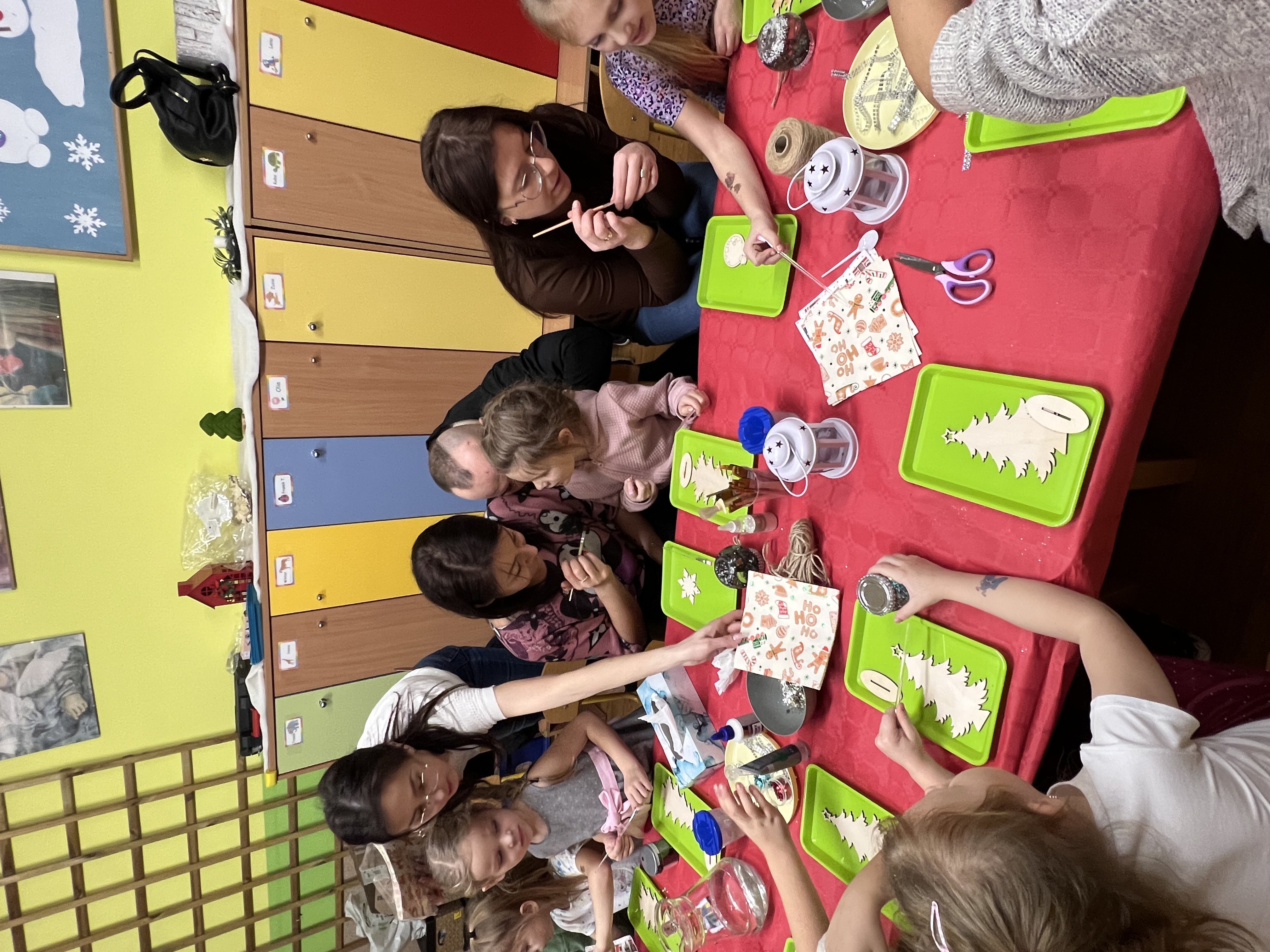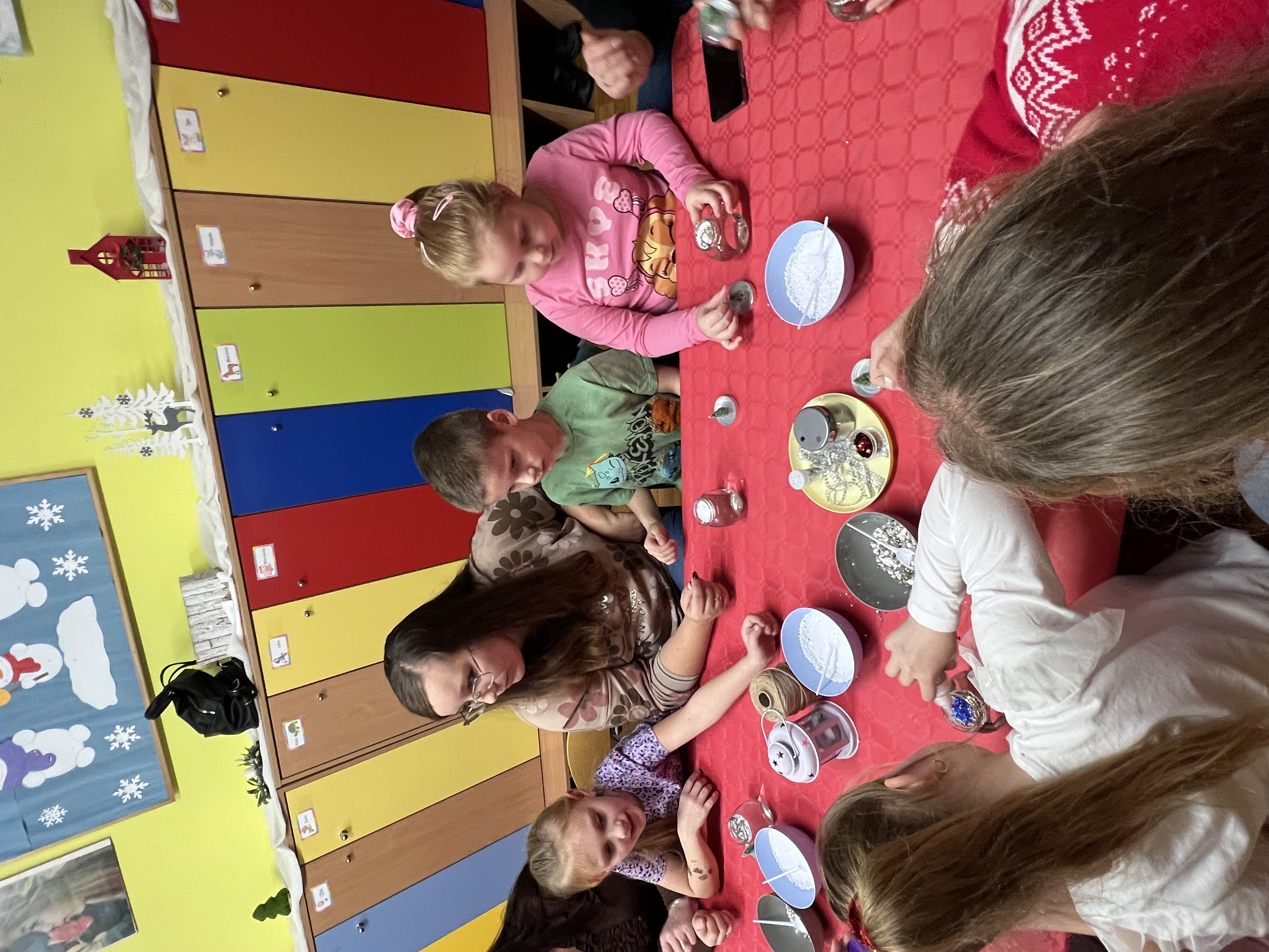 Podczas wspólnie spędzonego czasu dzieci wraz z rodzicami z zaangażowaniem tworzyły zimowe kule śnieżne oraz świąteczne choinki ze sklejki. Kolorowe materiały, brokat oraz inne ozdoby pobudzały wyobraźnię najmłodszych, a efekty pracy zachwycały swoją pomysłowością i starannością wykonania. Każda praca była wyjątkowa i odzwierciedlała kreatywność małych artystów.