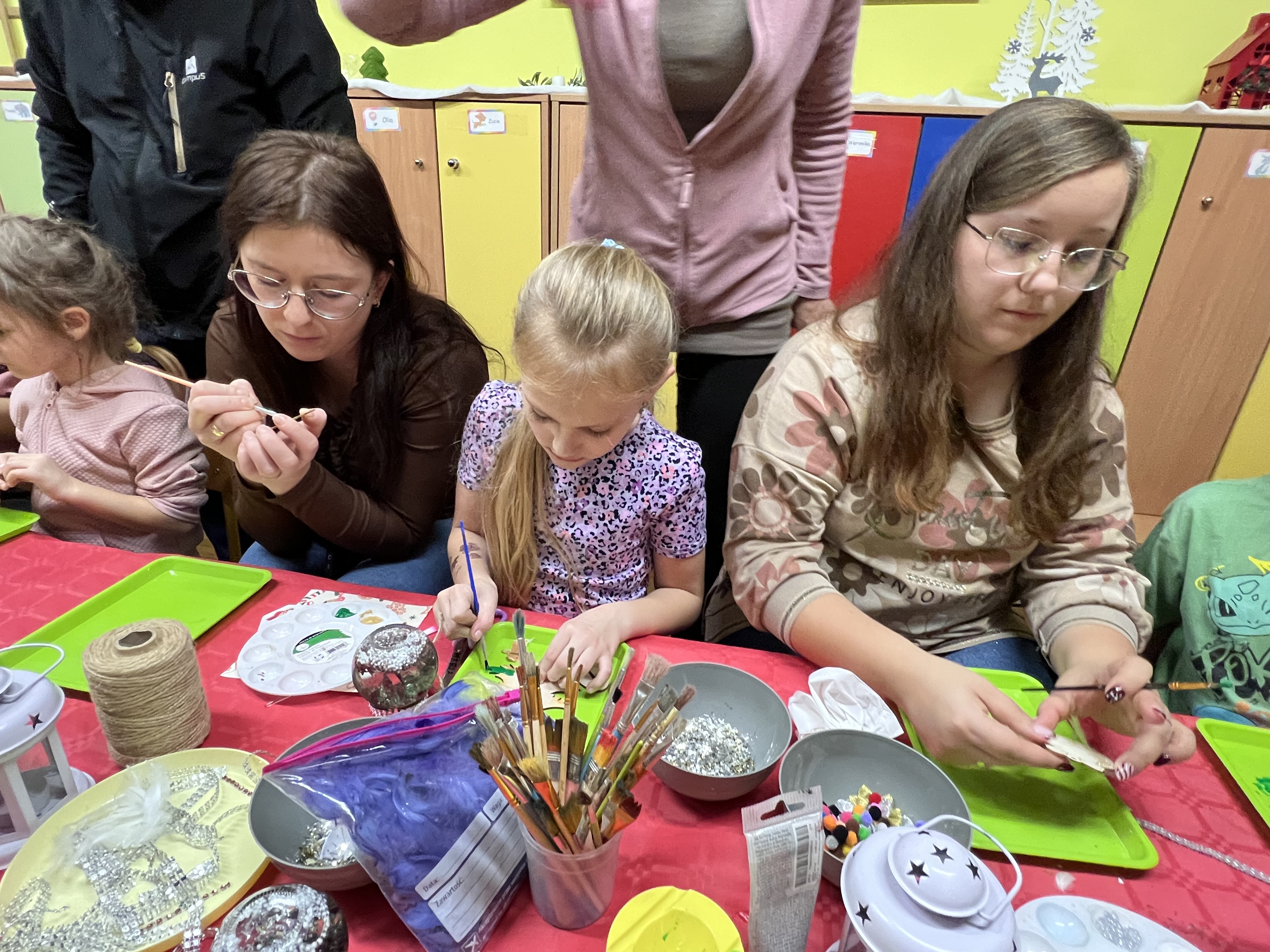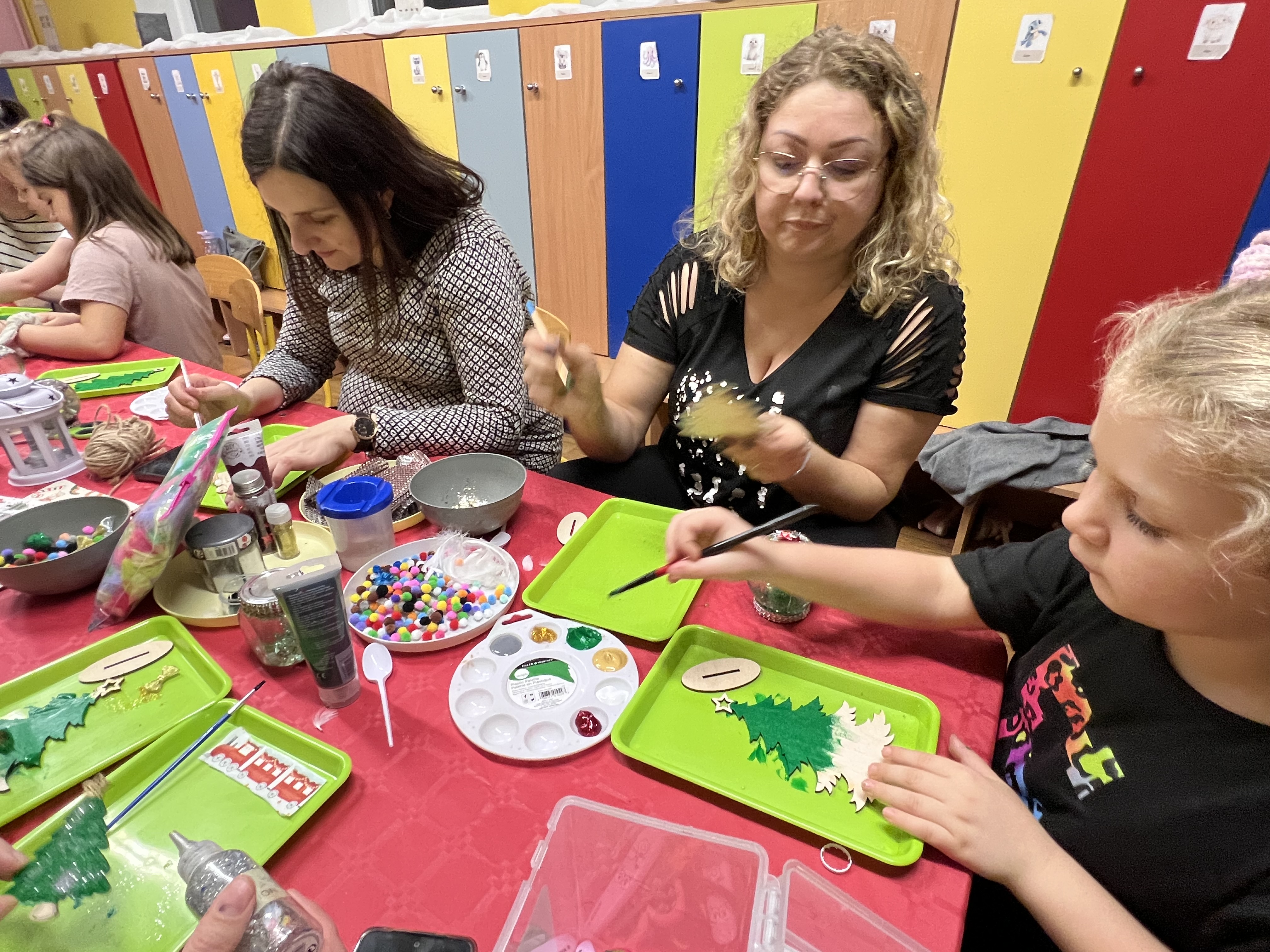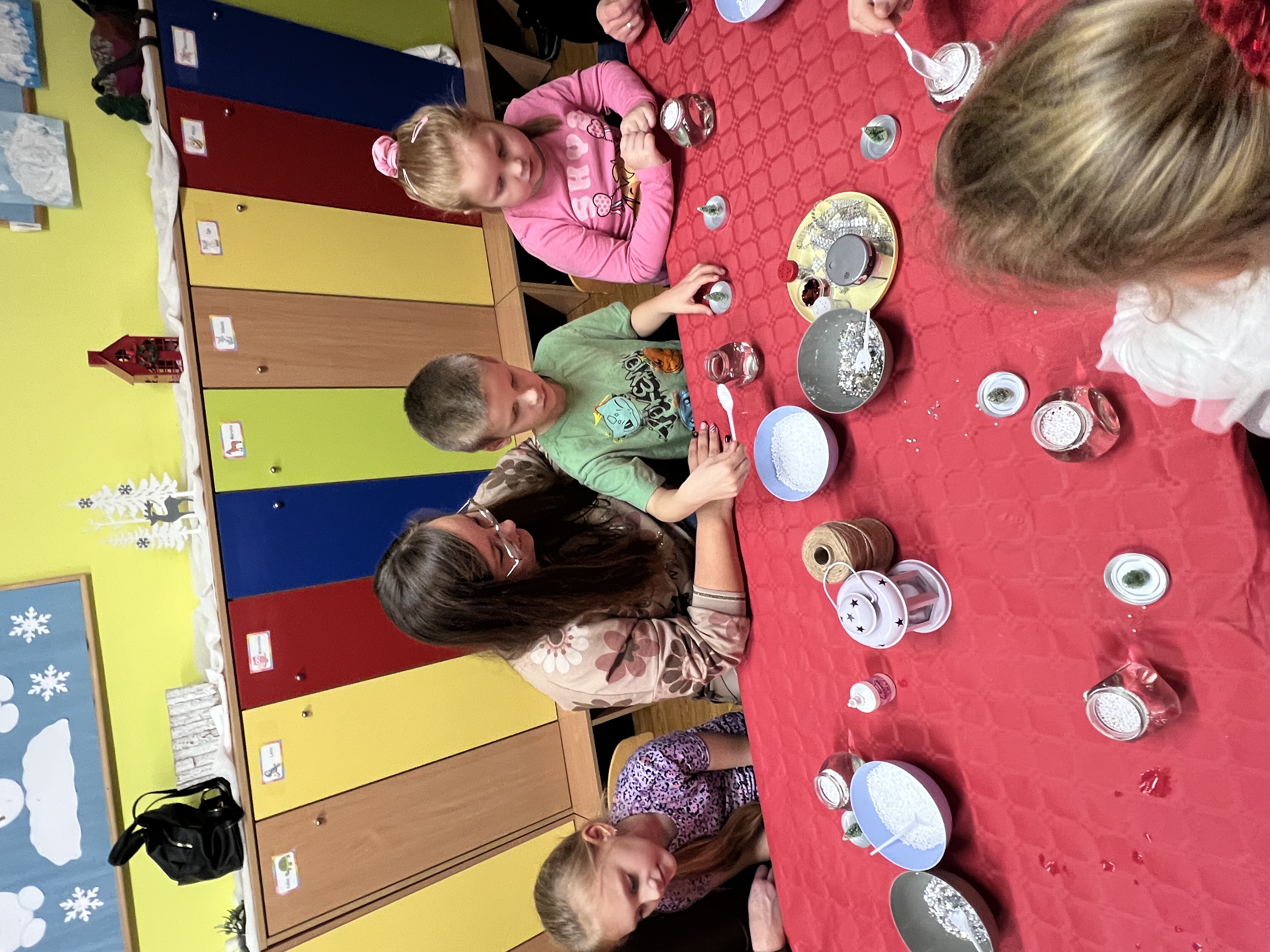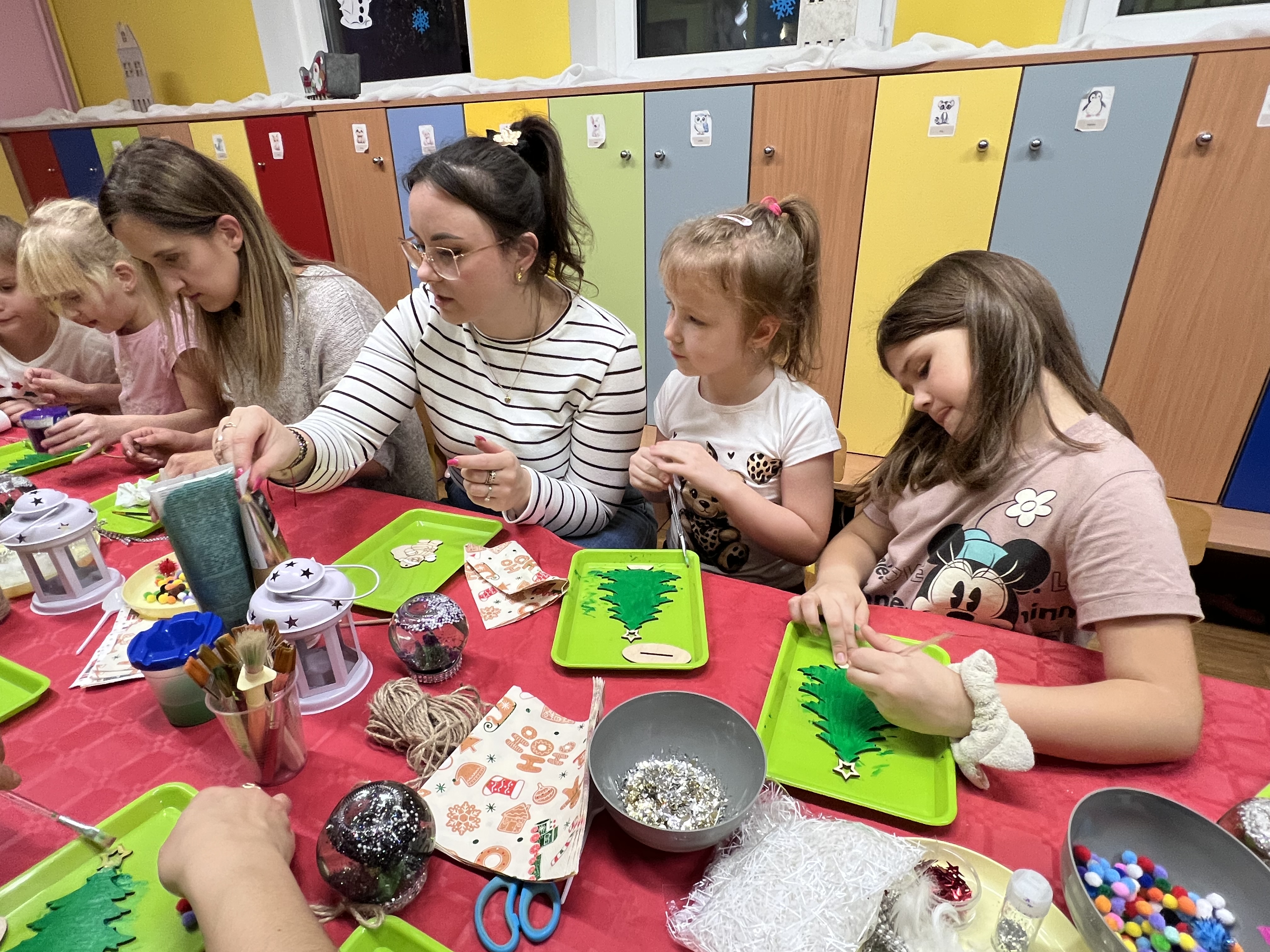 Podczas wspólnie spędzonego czasu dzieci wraz z rodzicami z zaangażowaniem tworzyły zimowe kule śnieżne oraz świąteczne choinki ze sklejki. Kolorowe materiały, brokat oraz inne ozdoby pobudzały wyobraźnię najmłodszych, a efekty pracy zachwycały swoją pomysłowością i starannością wykonania. Każda praca była wyjątkowa i odzwierciedlała kreatywność małych artystów.
