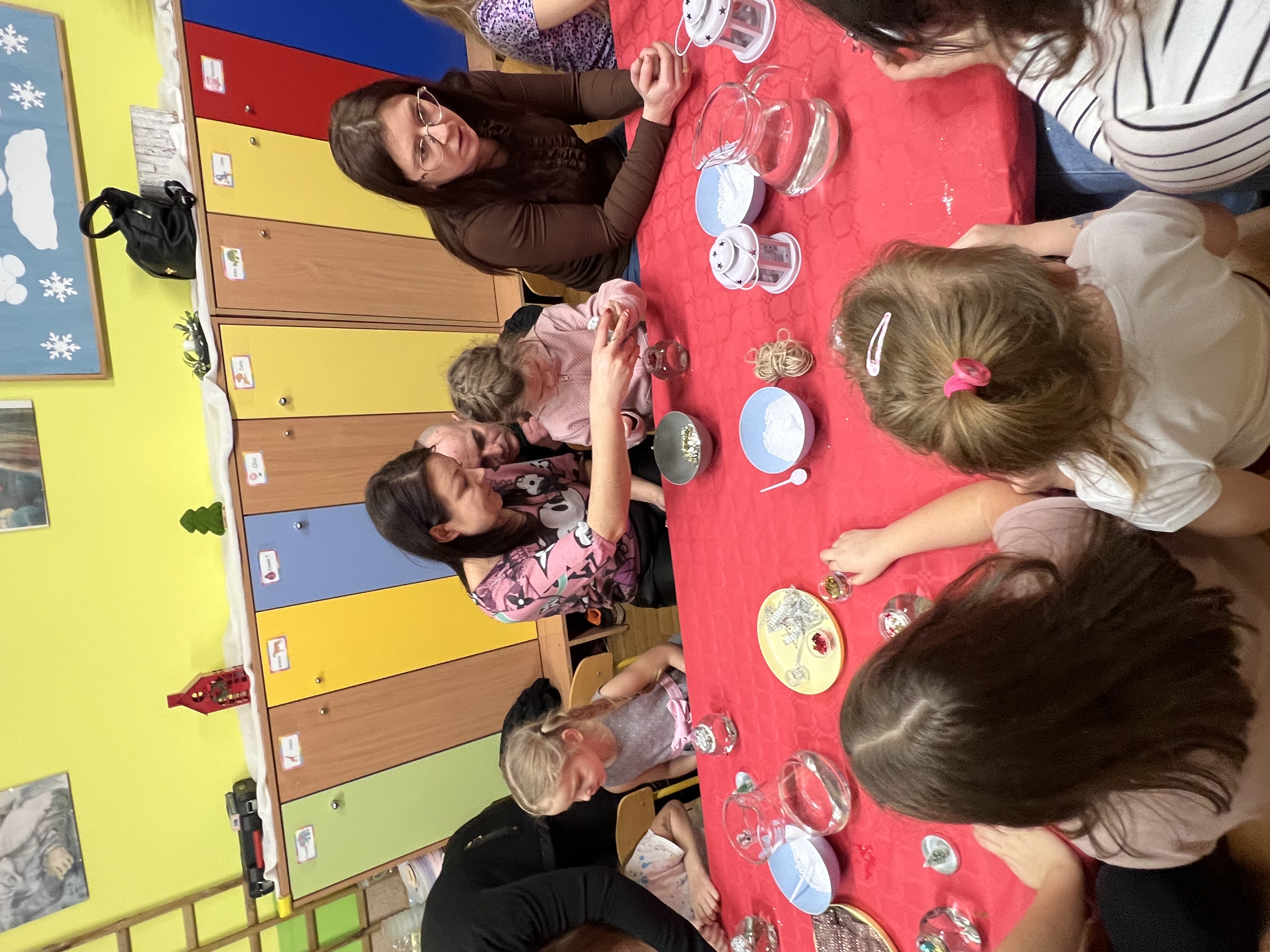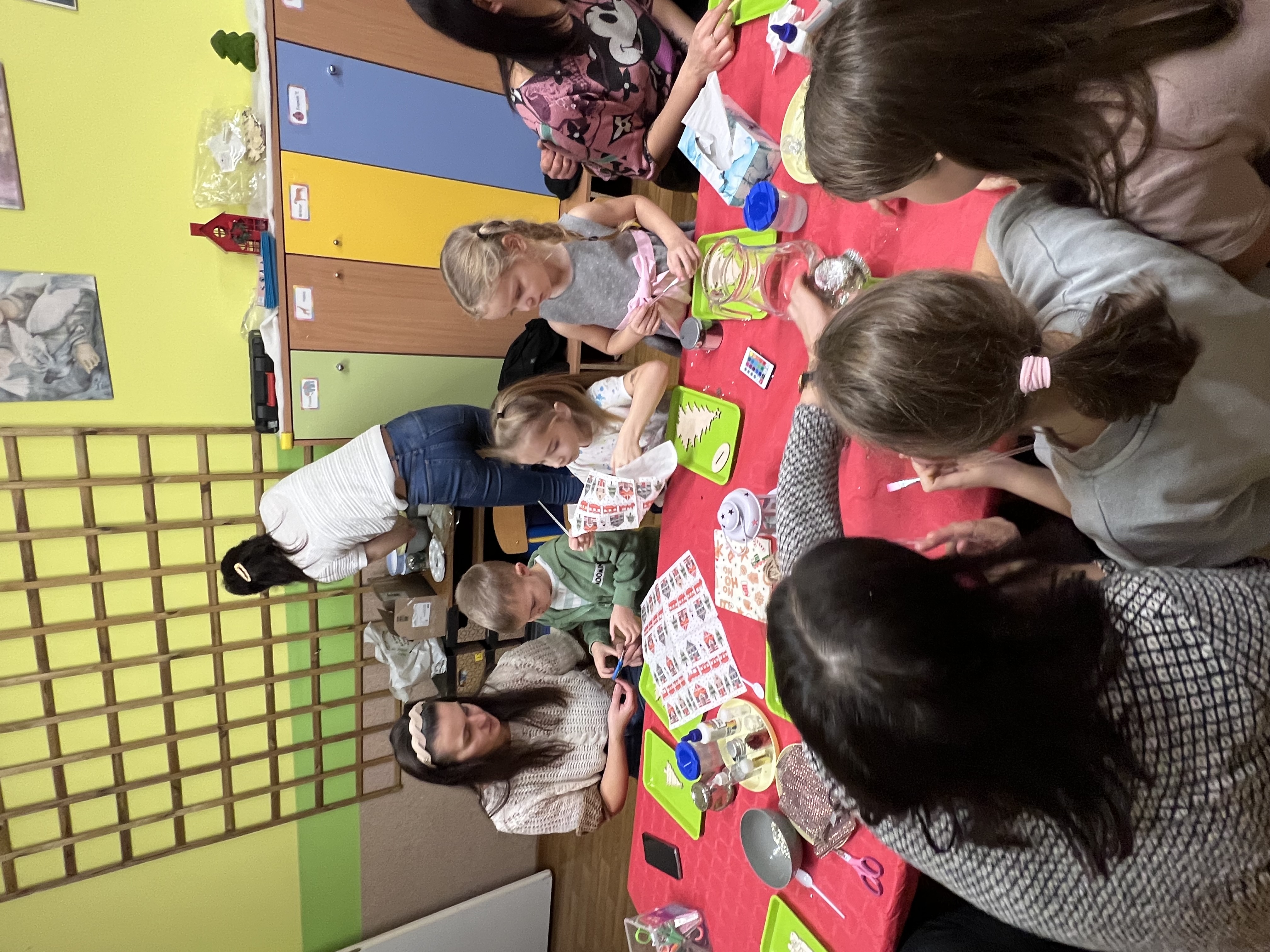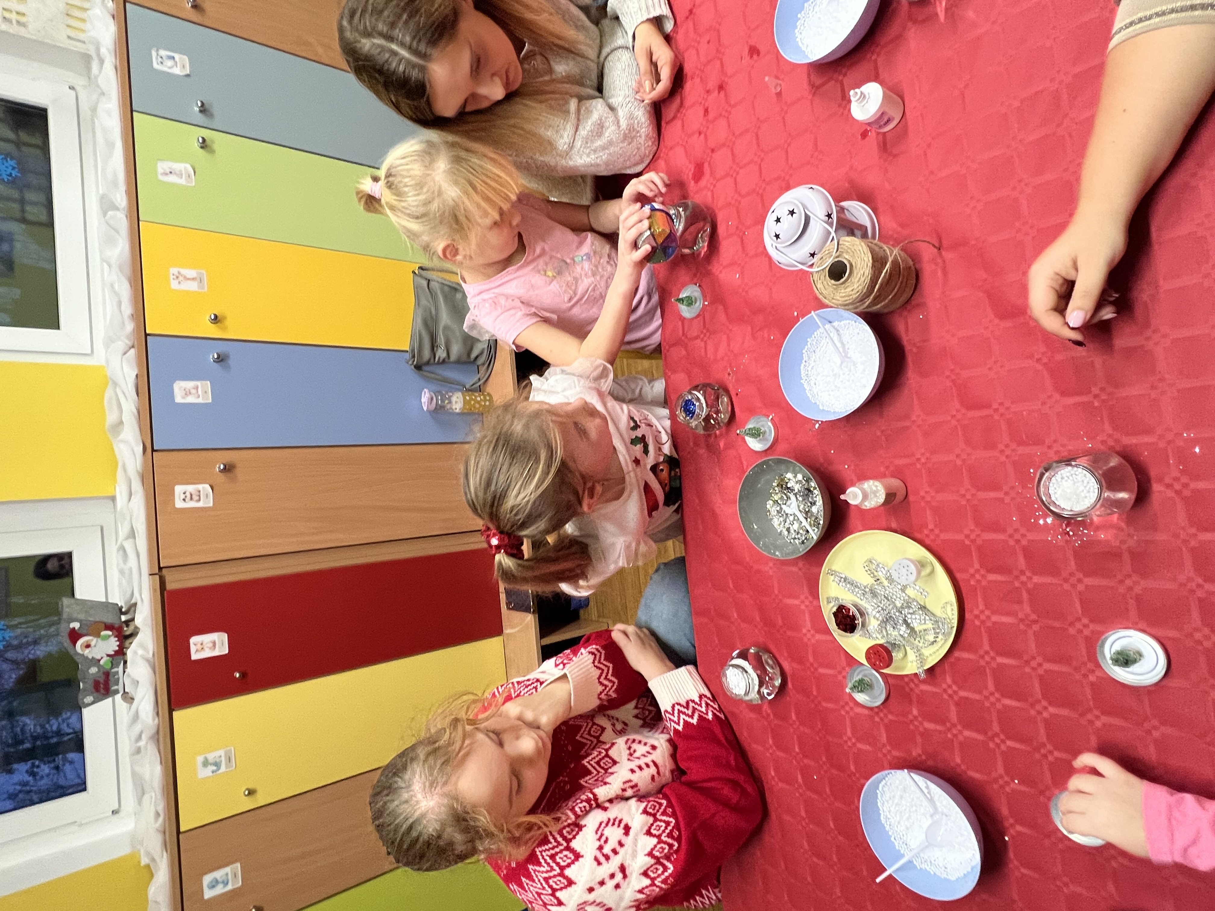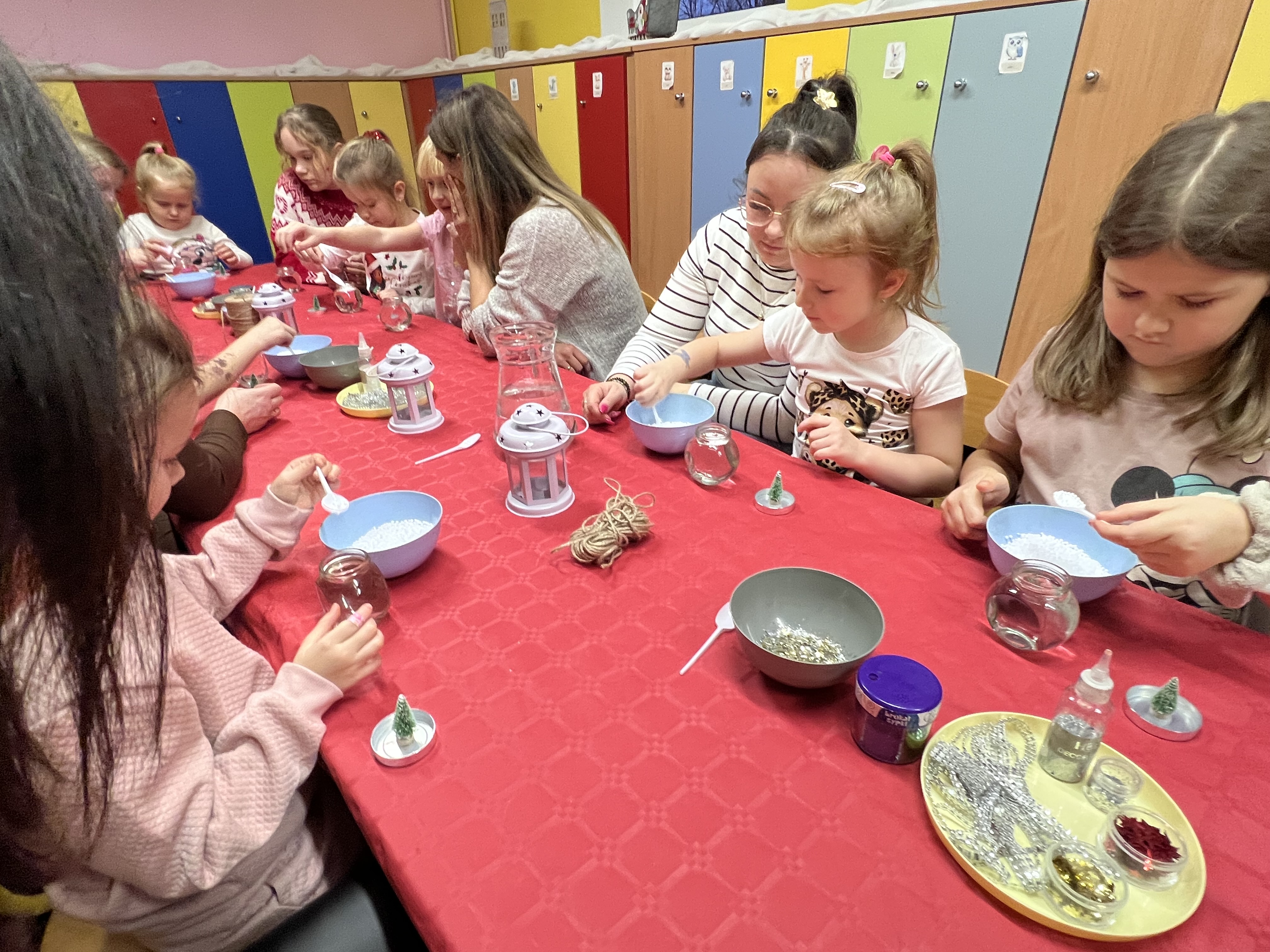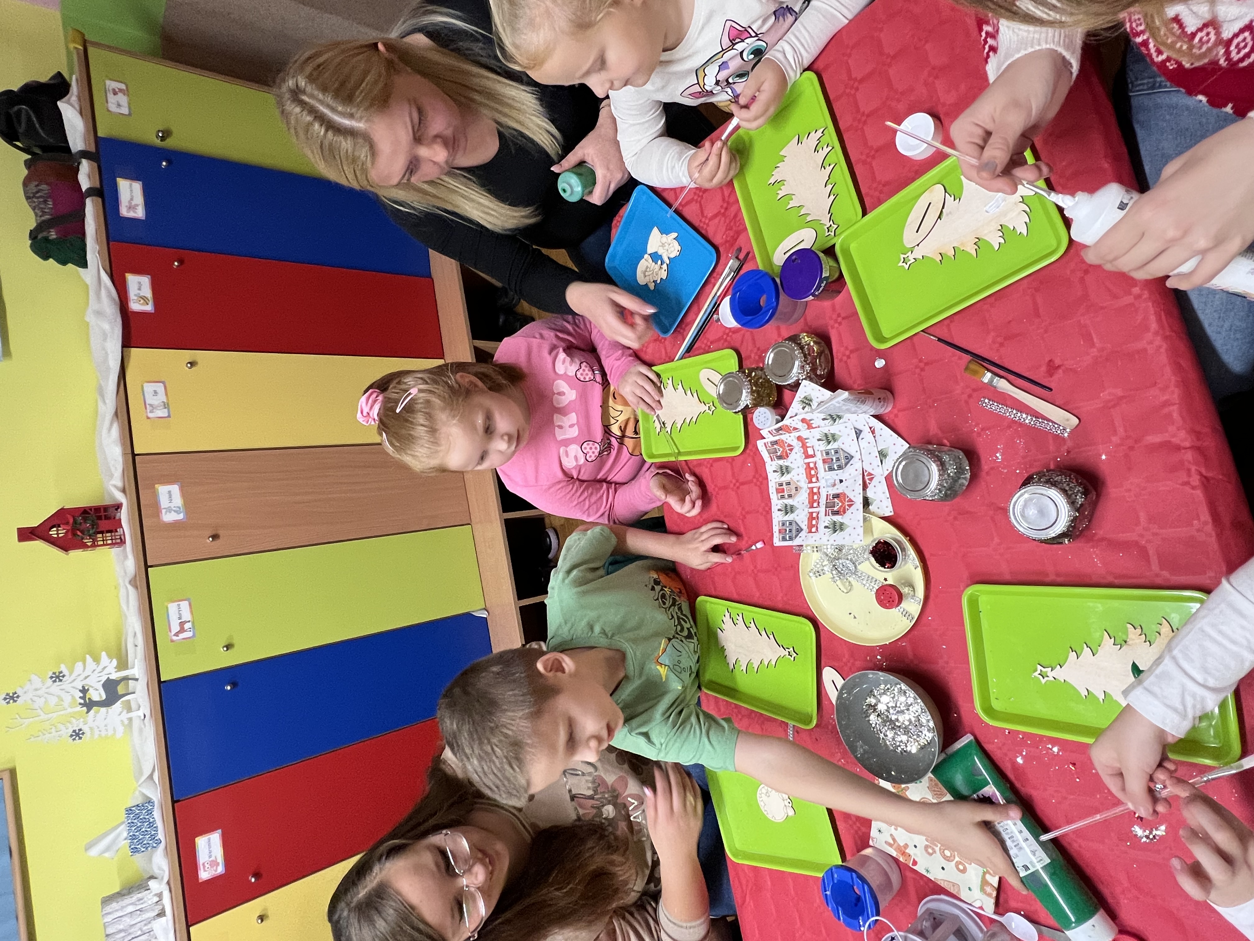Podczas wspólnie spędzonego czasu dzieci wraz z rodzicami z zaangażowaniem tworzyły zimowe kule śnieżne oraz świąteczne choinki ze sklejki. Kolorowe materiały, brokat oraz inne ozdoby pobudzały wyobraźnię najmłodszych, a efekty pracy zachwycały swoją pomysłowością i starannością wykonania. Każda praca była wyjątkowa i odzwierciedlała kreatywność małych artystów.