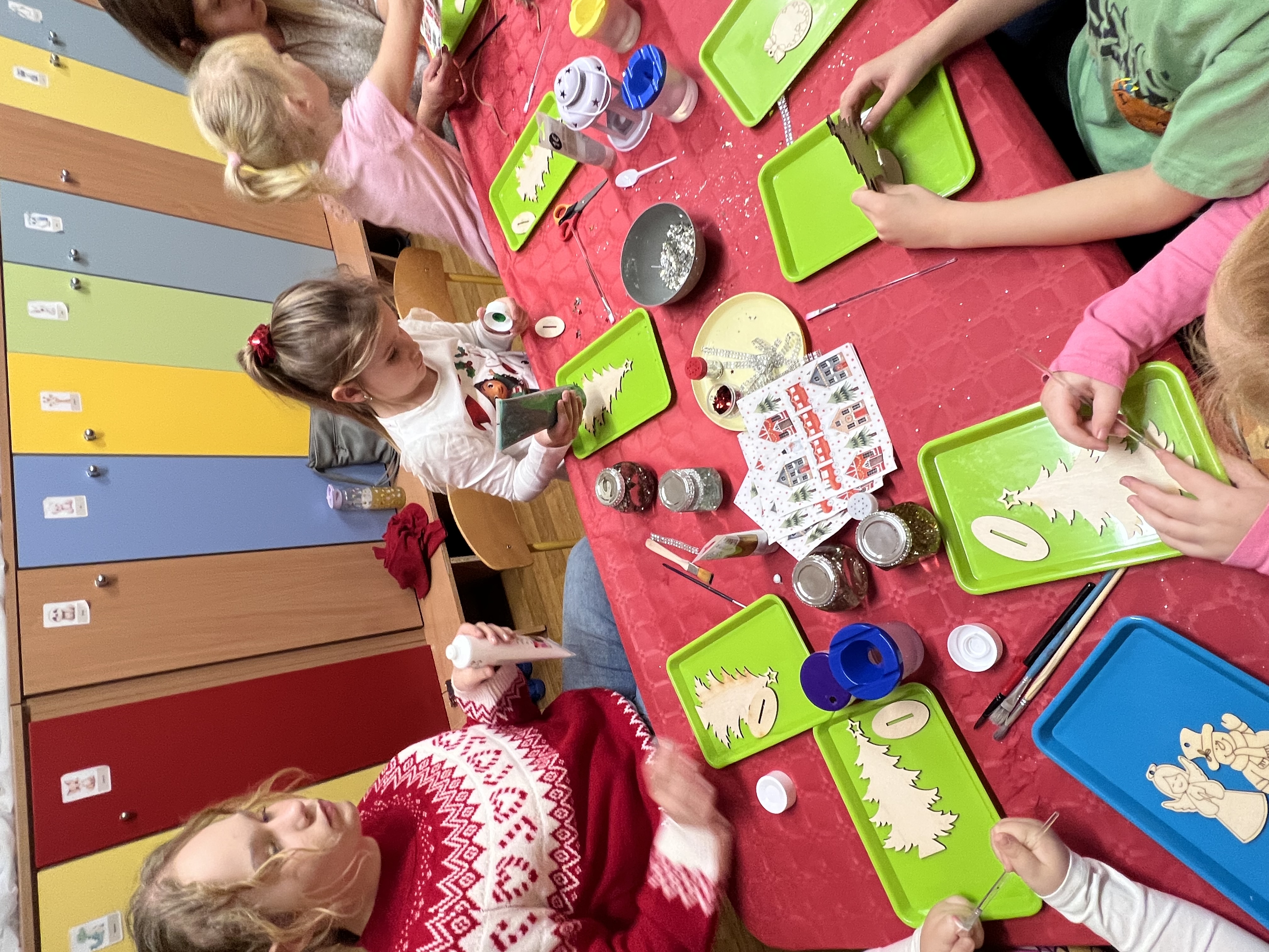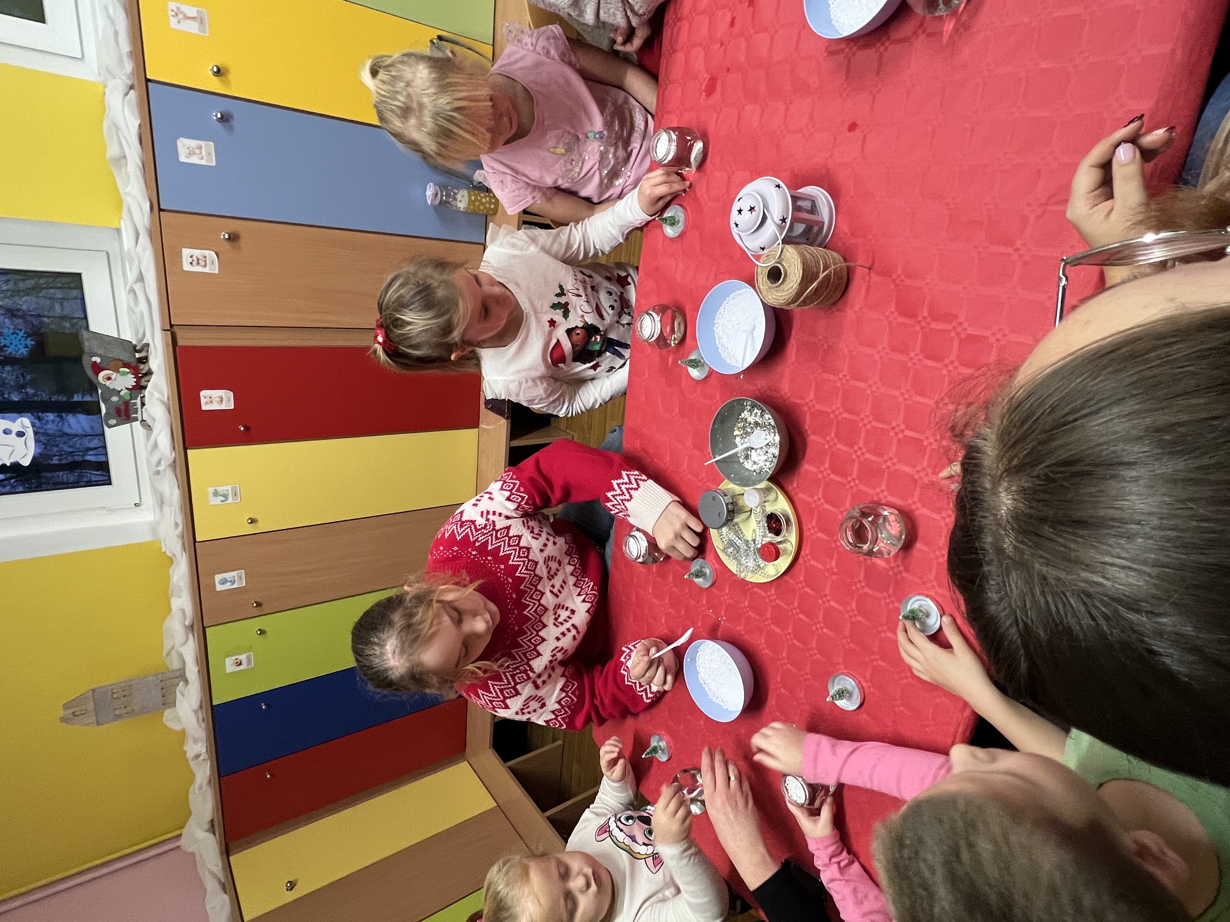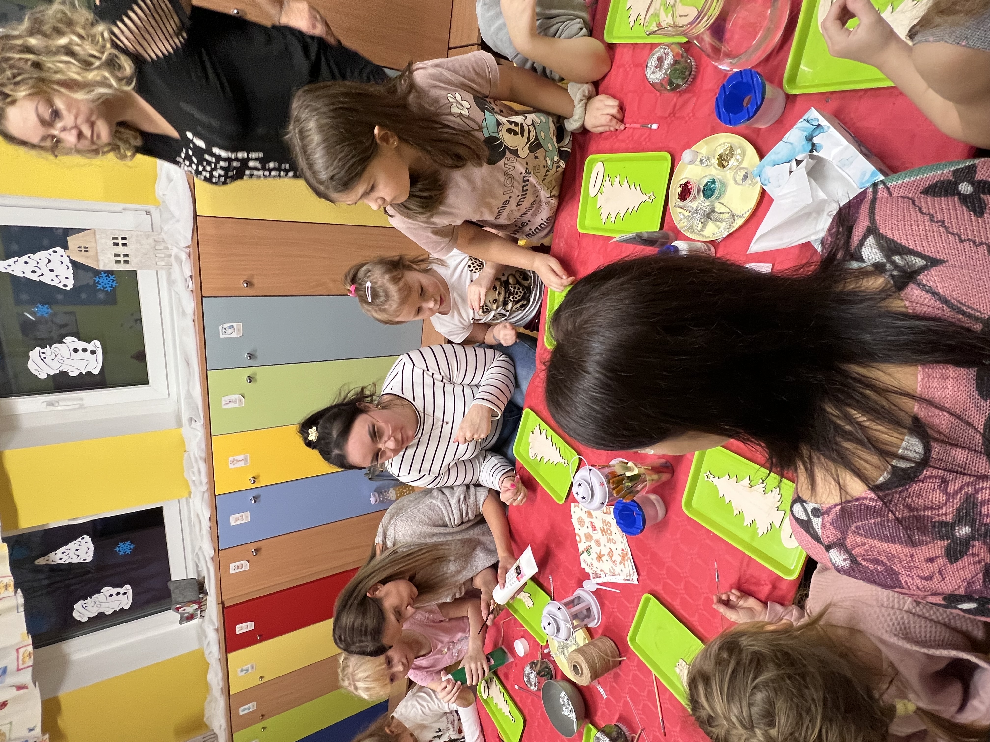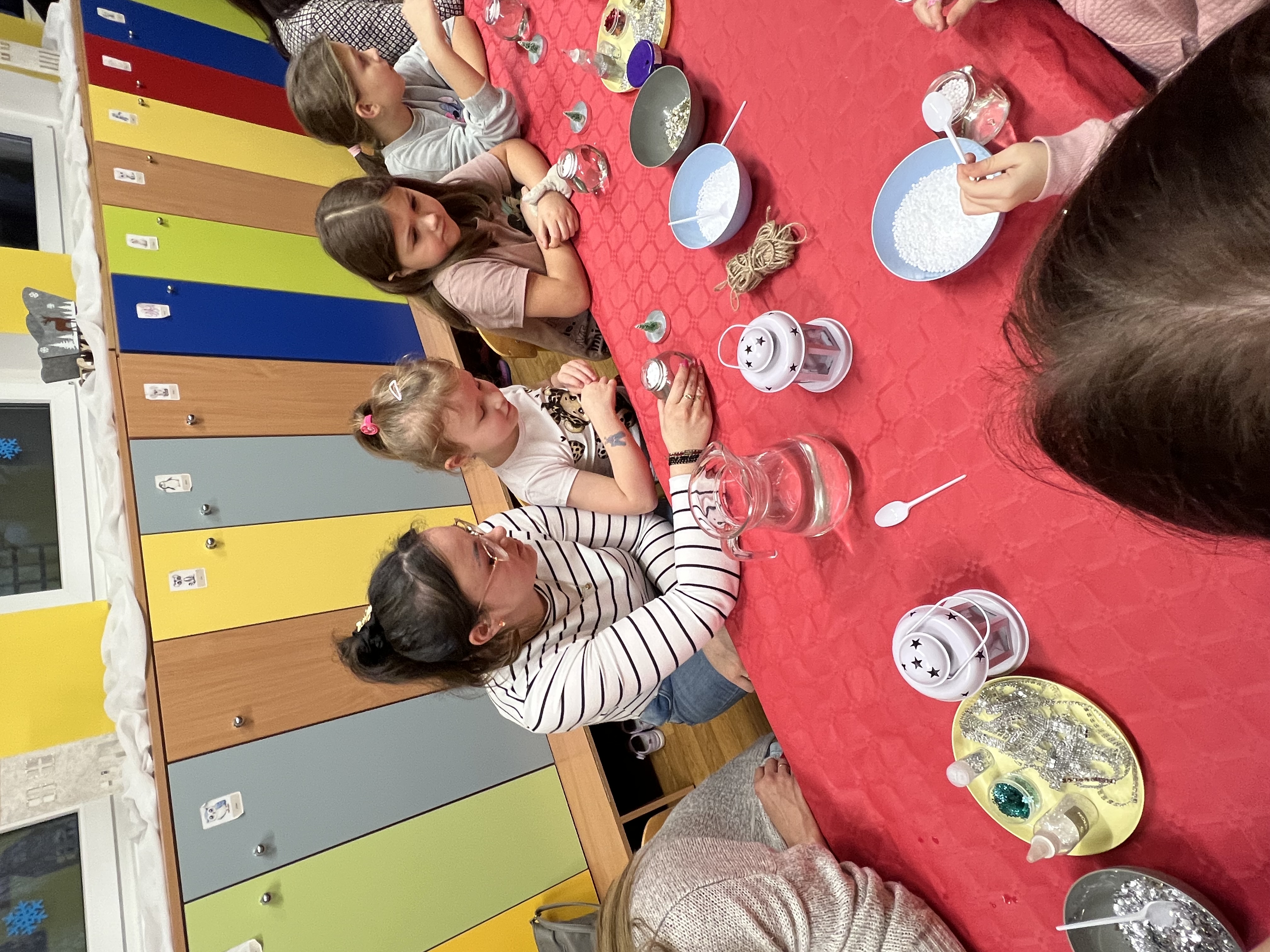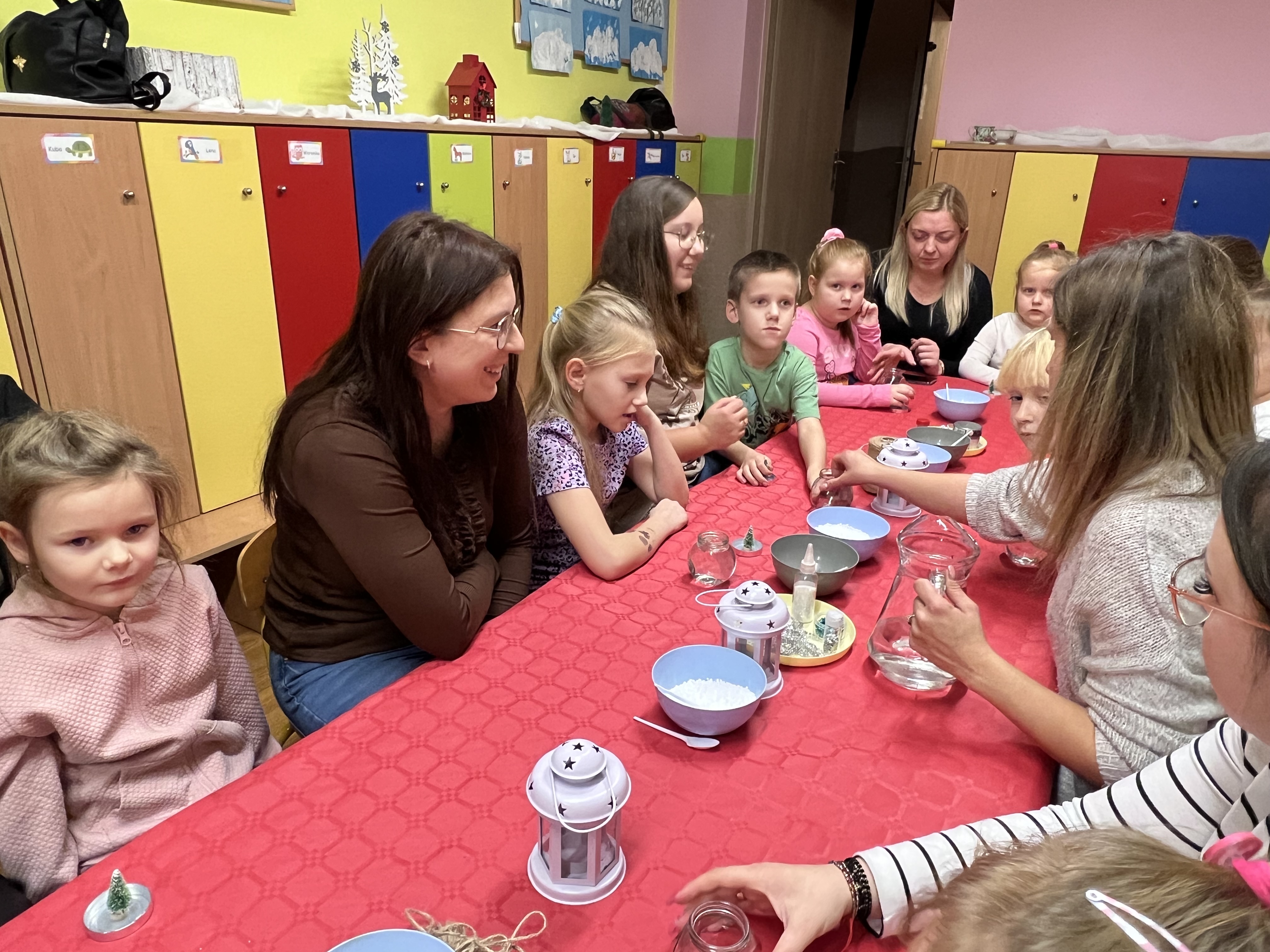 Podczas wspólnie spędzonego czasu dzieci wraz z rodzicami z zaangażowaniem tworzyły zimowe kule śnieżne oraz świąteczne choinki ze sklejki. Kolorowe materiały, brokat oraz inne ozdoby pobudzały wyobraźnię najmłodszych, a efekty pracy zachwycały swoją pomysłowością i starannością wykonania. Każda praca była wyjątkowa i odzwierciedlała kreatywność małych artystów.