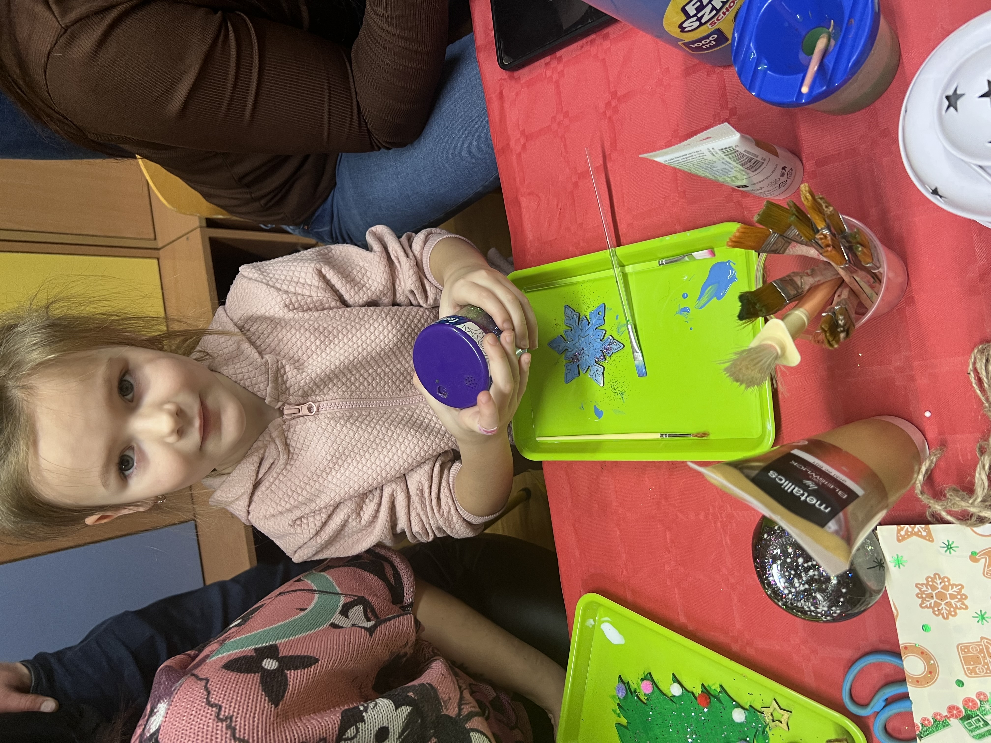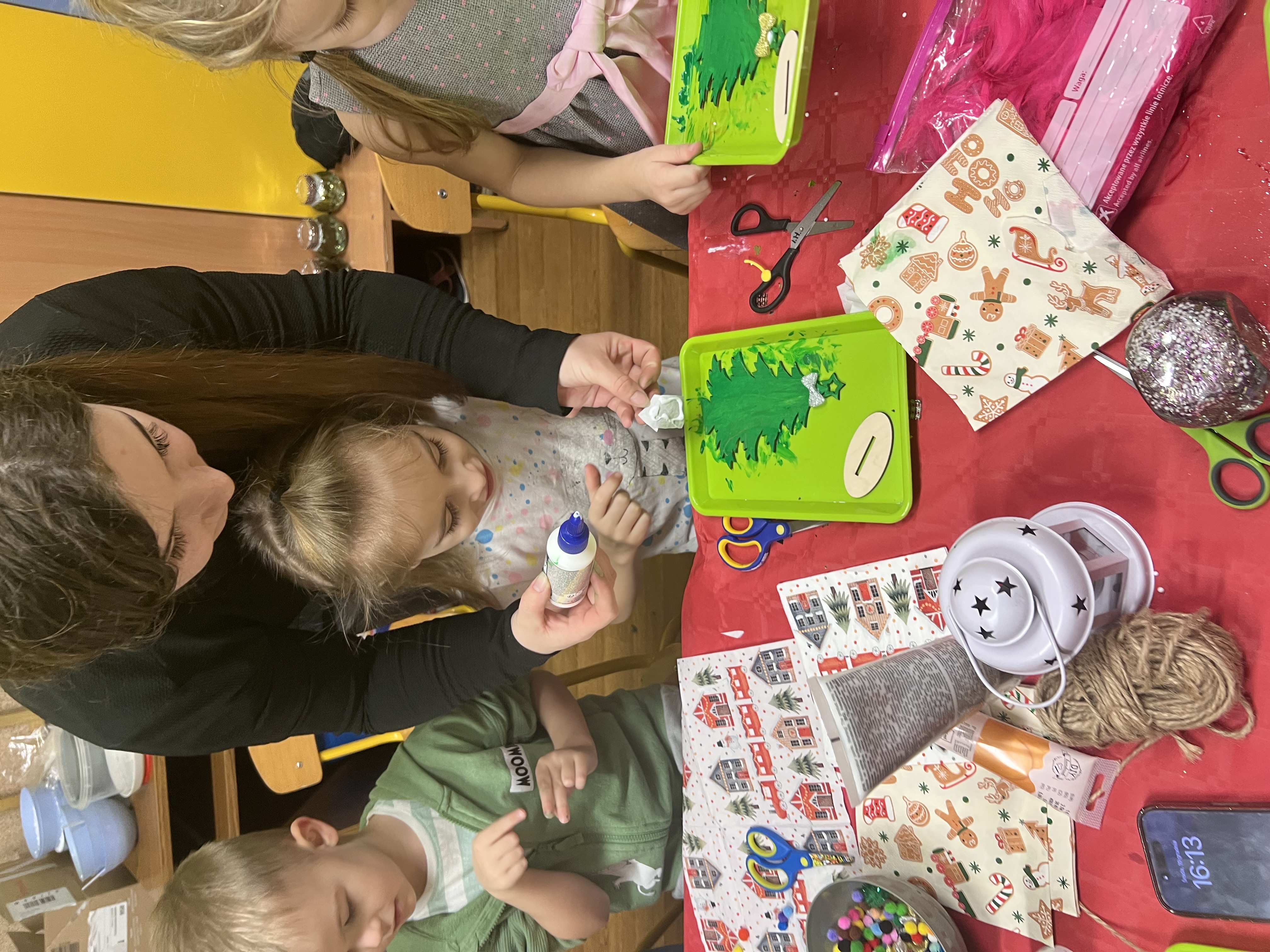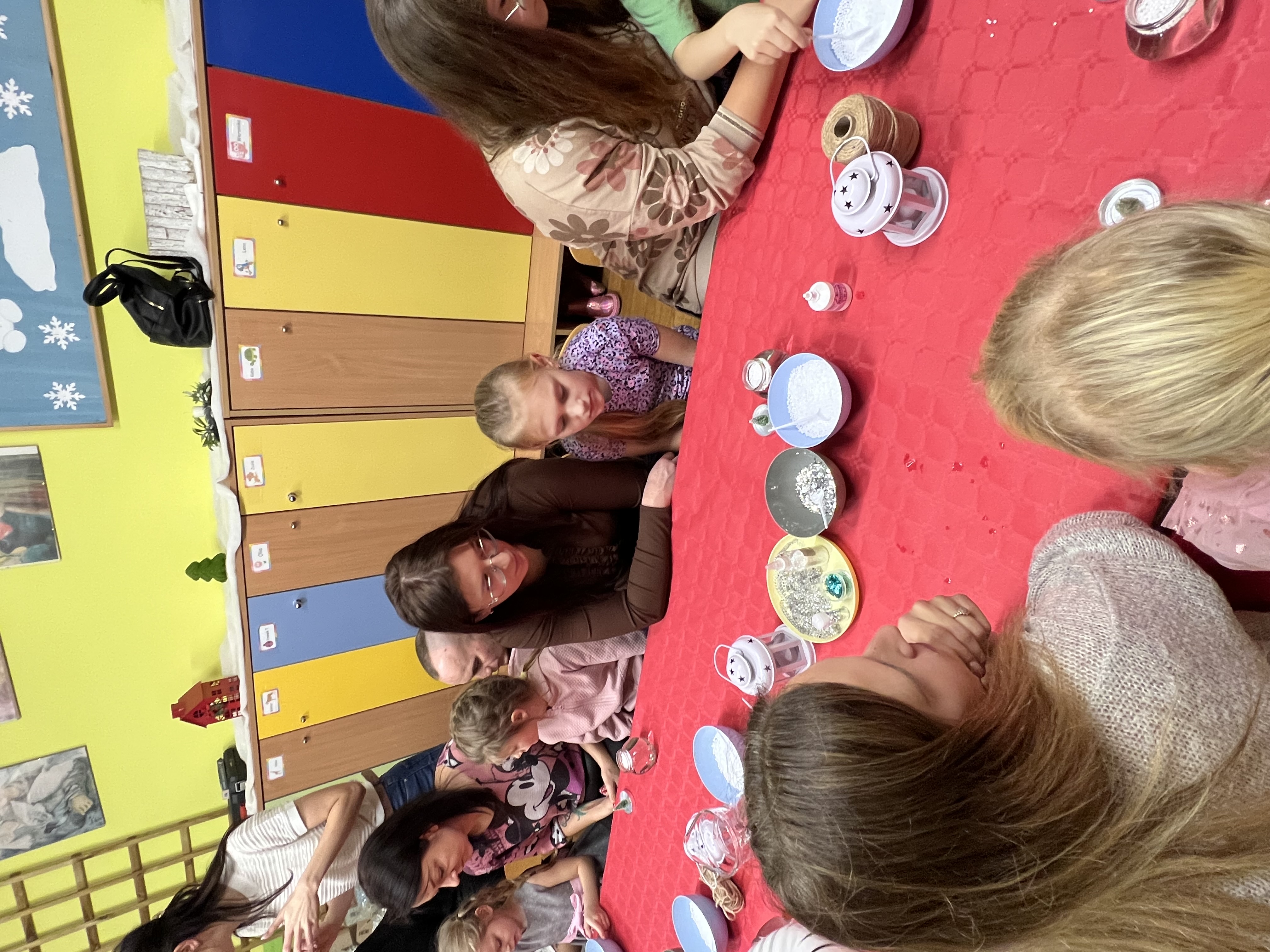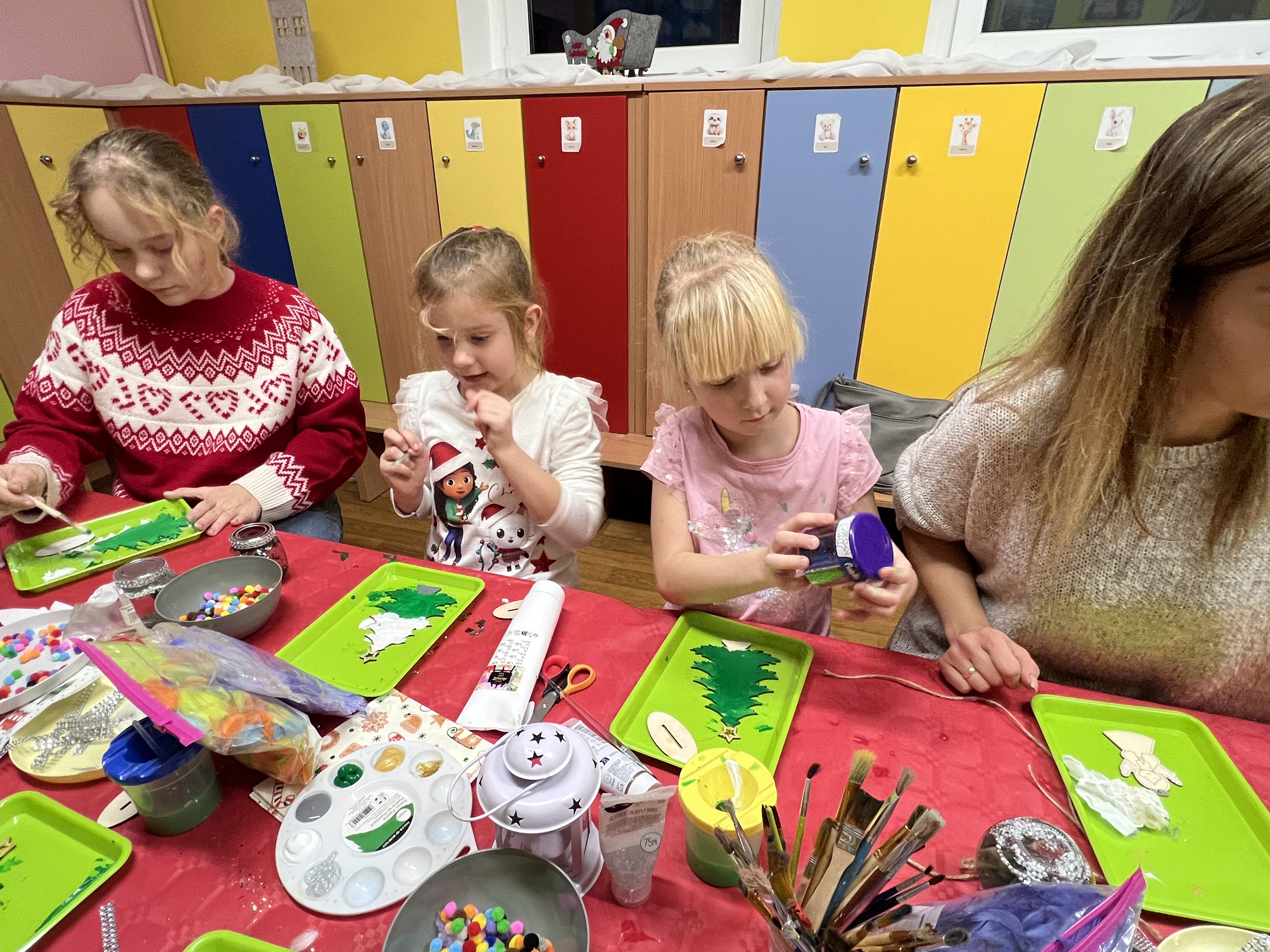 Podczas wspólnie spędzonego czasu dzieci wraz z rodzicami z zaangażowaniem tworzyły zimowe kule śnieżne oraz świąteczne choinki ze sklejki. Kolorowe materiały, brokat oraz inne ozdoby pobudzały wyobraźnię najmłodszych, a efekty pracy zachwycały swoją pomysłowością i starannością wykonania. Każda praca była wyjątkowa i odzwierciedlała kreatywność małych artystów.