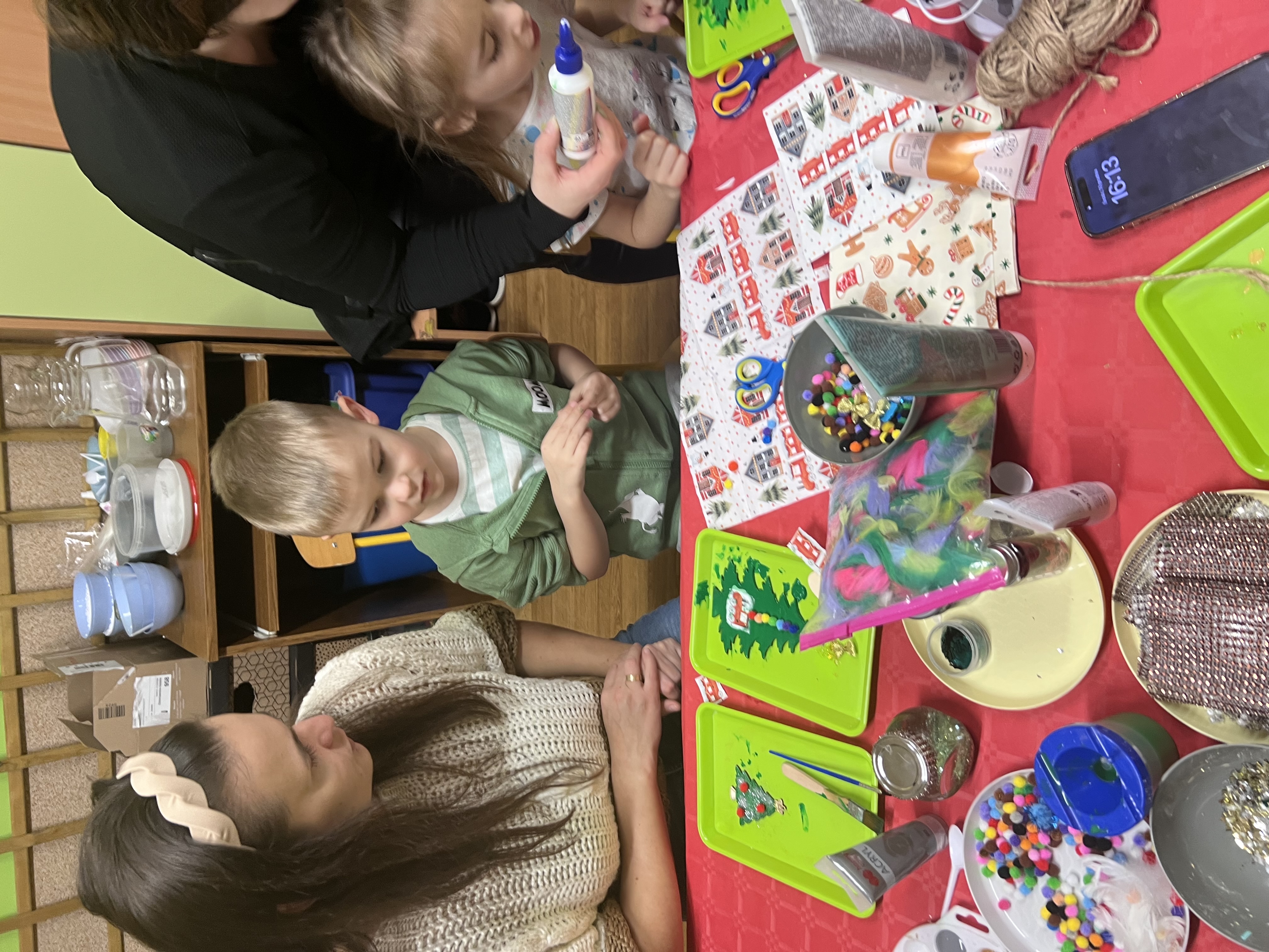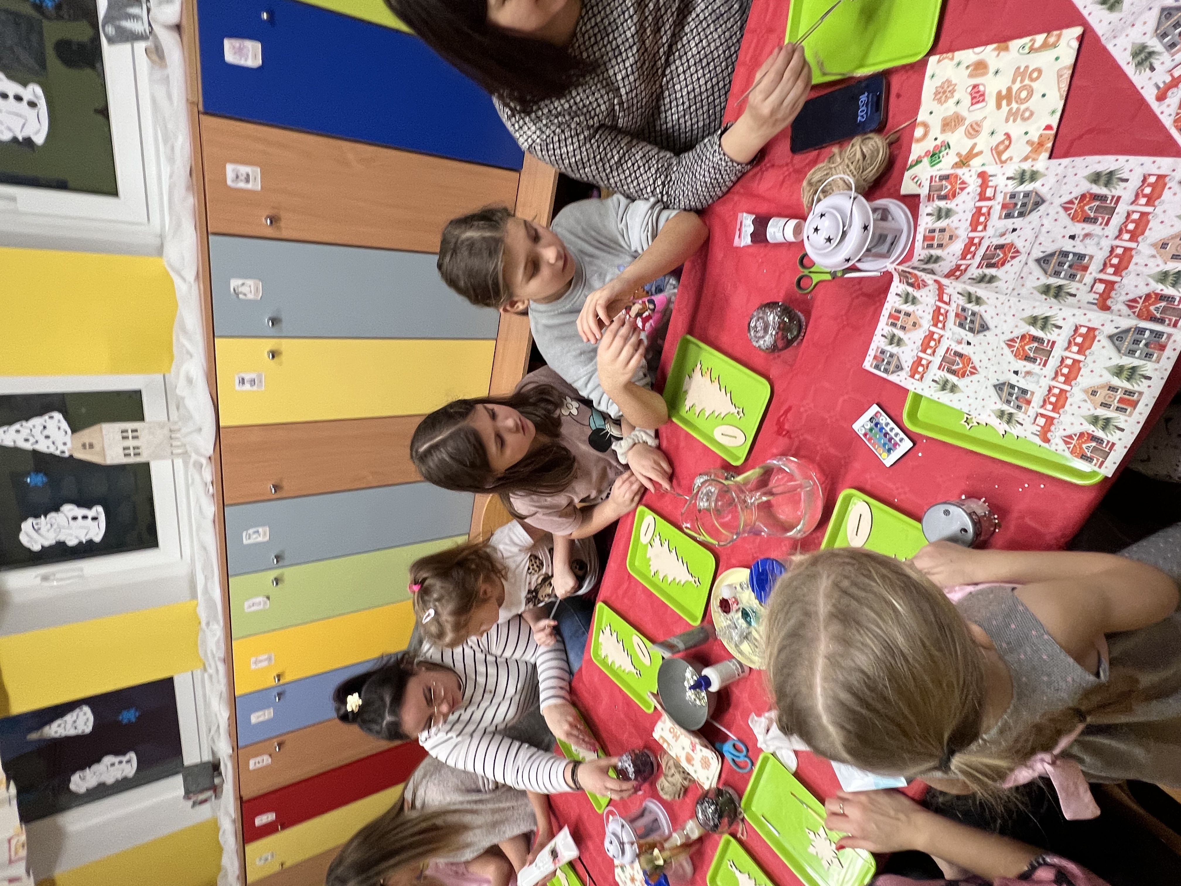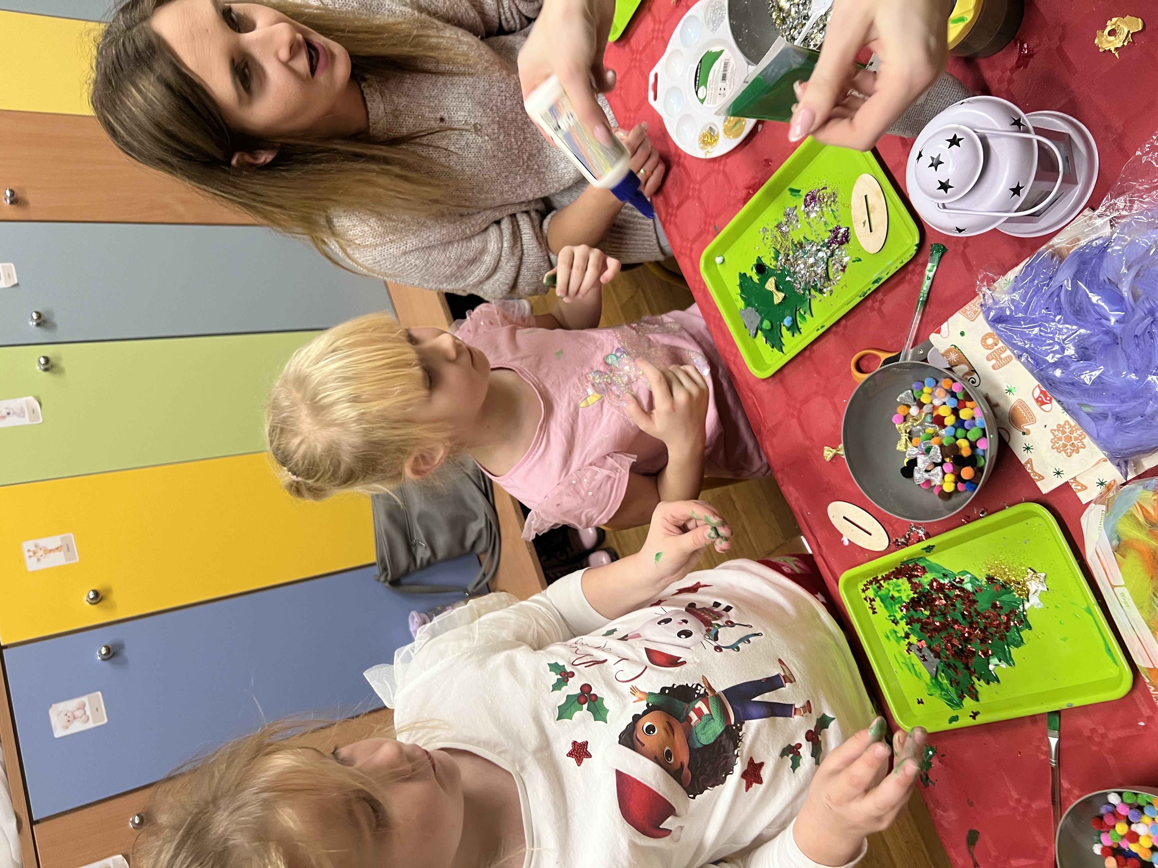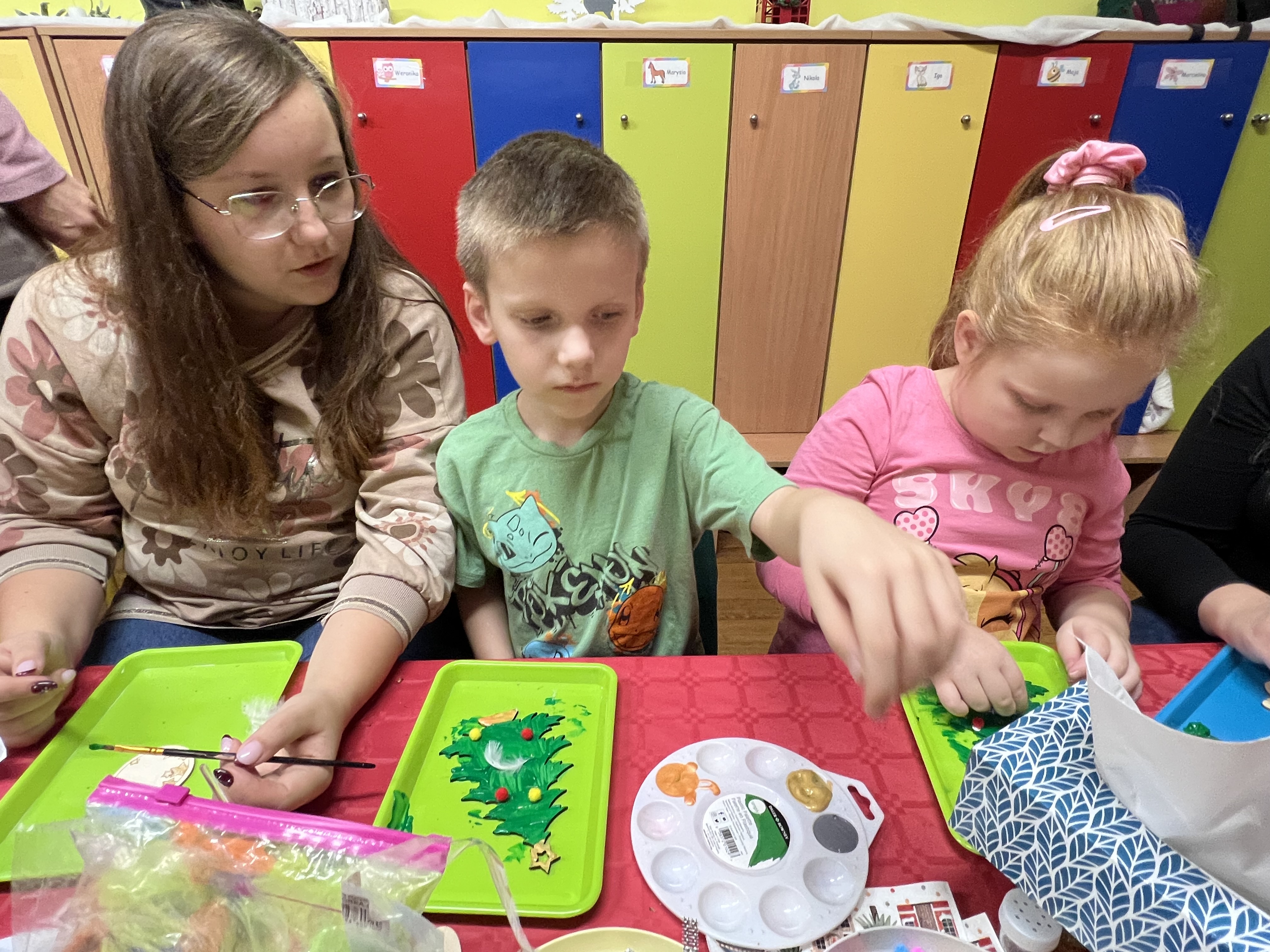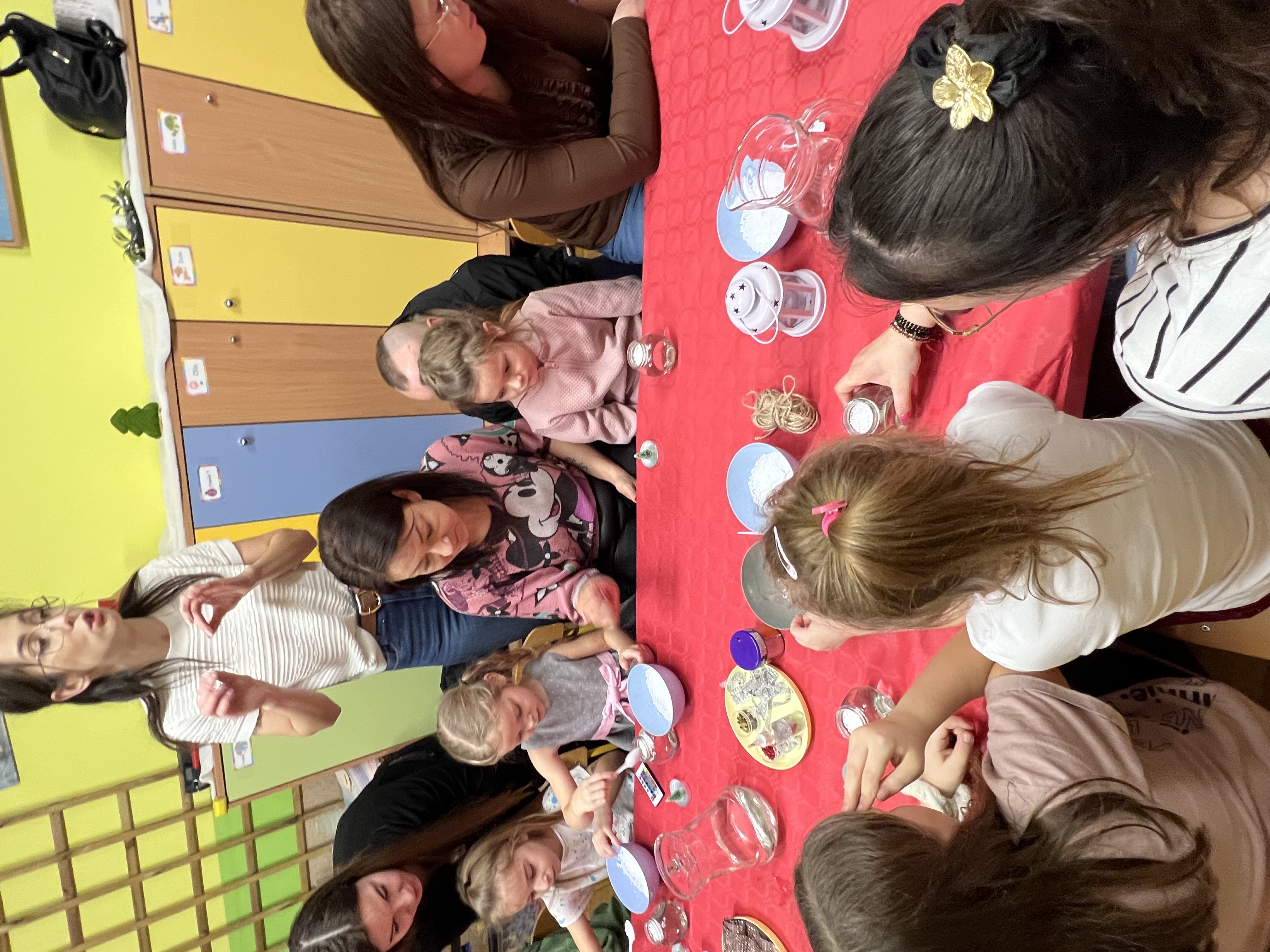 Podczas wspólnie spędzonego czasu dzieci wraz z rodzicami z zaangażowaniem tworzyły zimowe kule śnieżne oraz świąteczne choinki ze sklejki. Kolorowe materiały, brokat oraz inne ozdoby pobudzały wyobraźnię najmłodszych, a efekty pracy zachwycały swoją pomysłowością i starannością wykonania. Każda praca była wyjątkowa i odzwierciedlała kreatywność małych artystów.