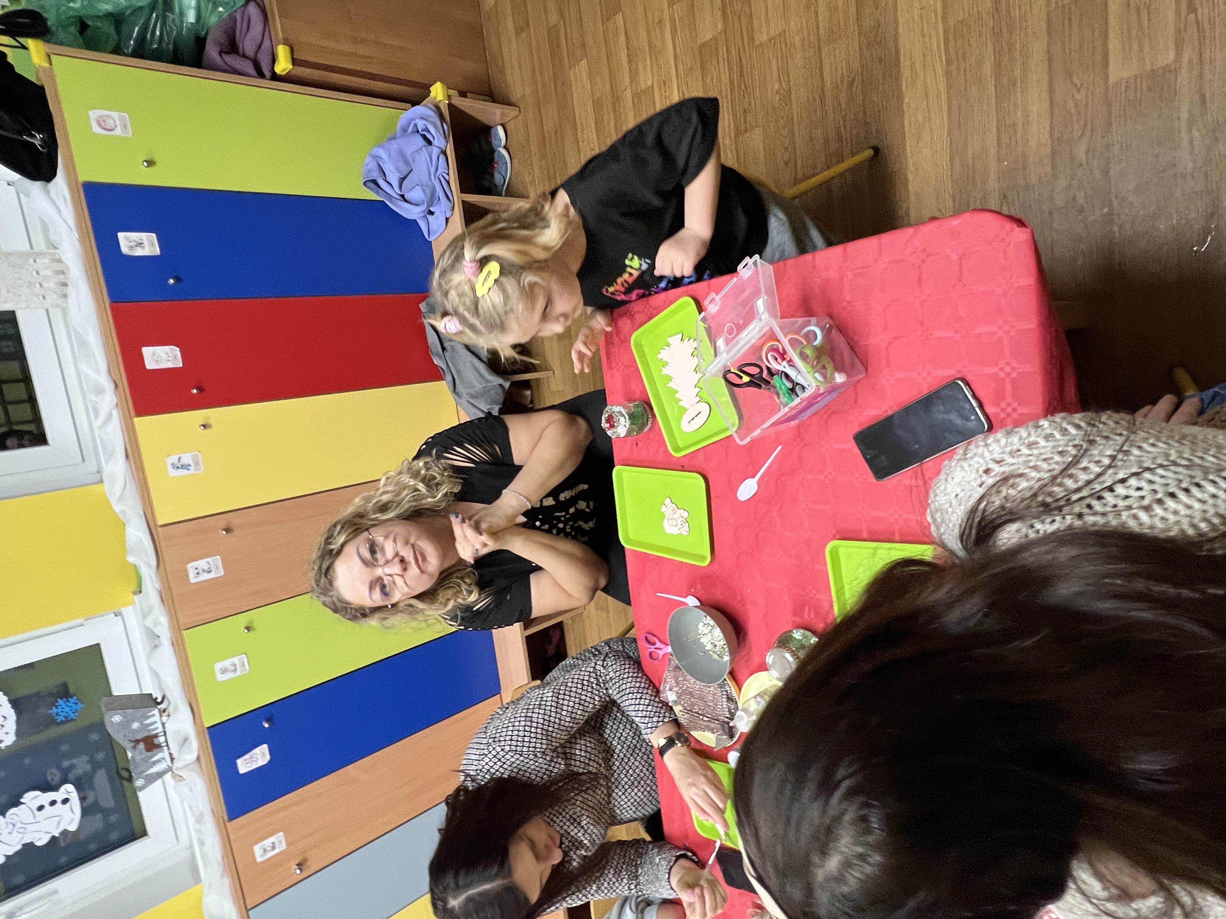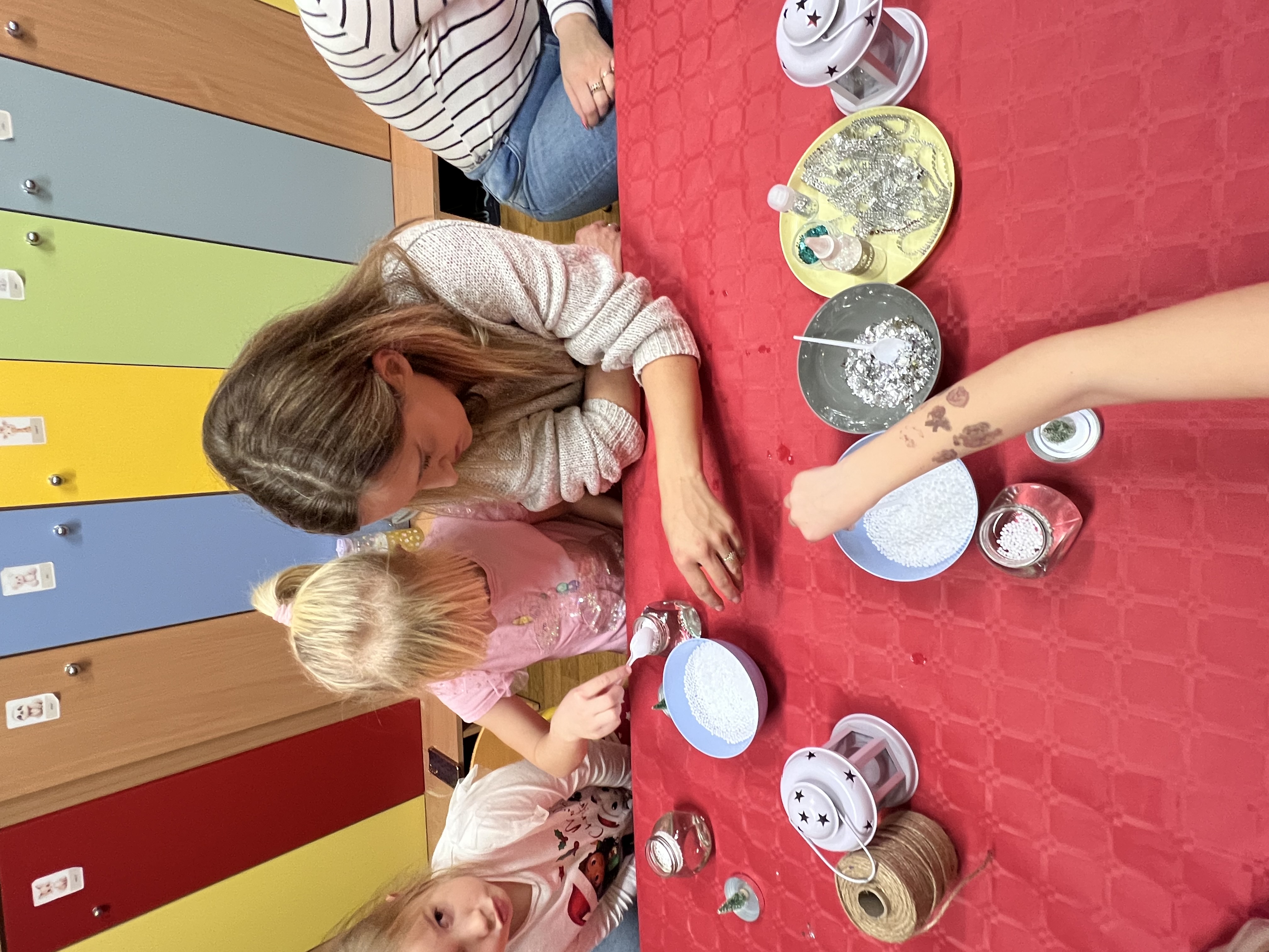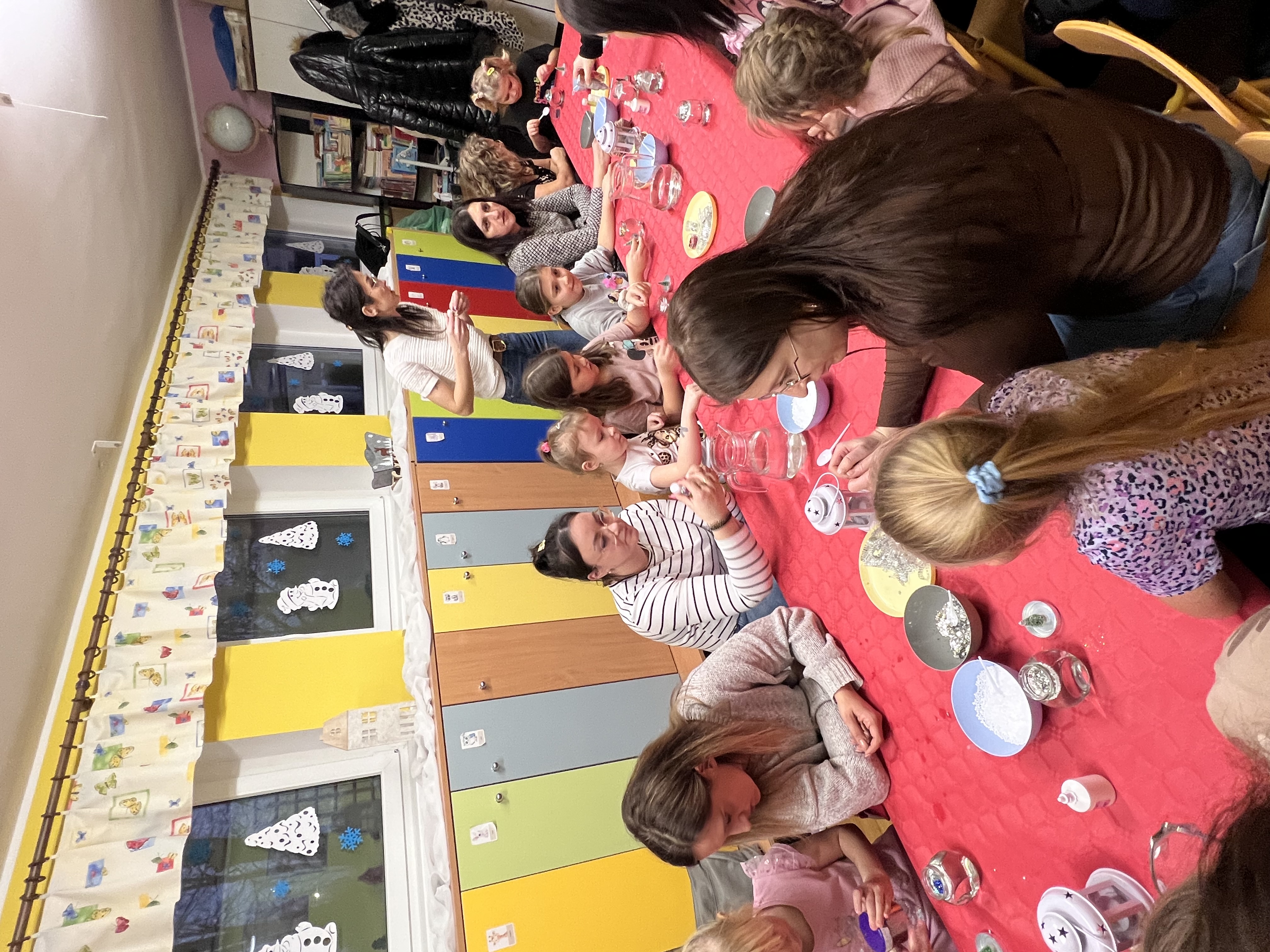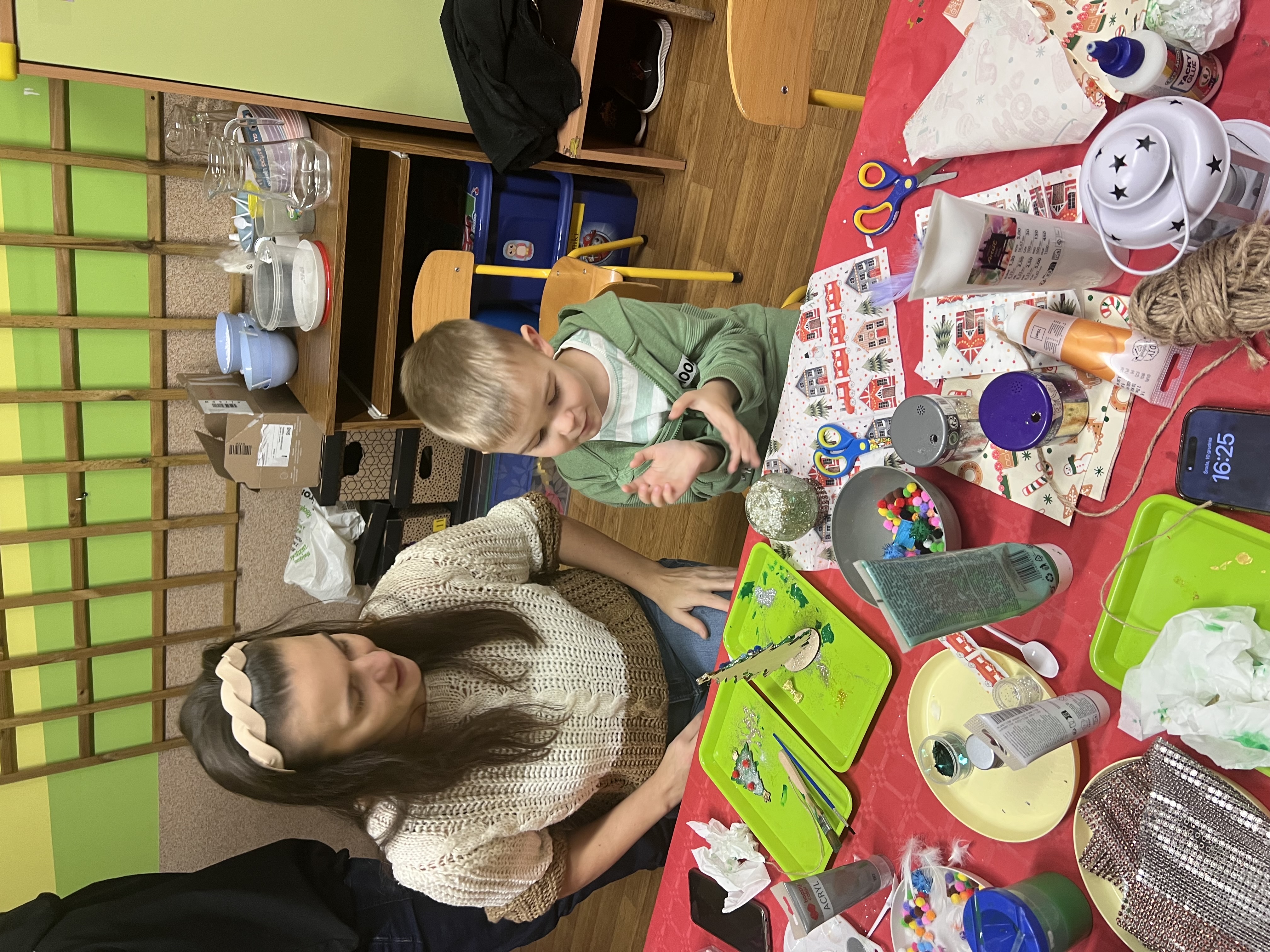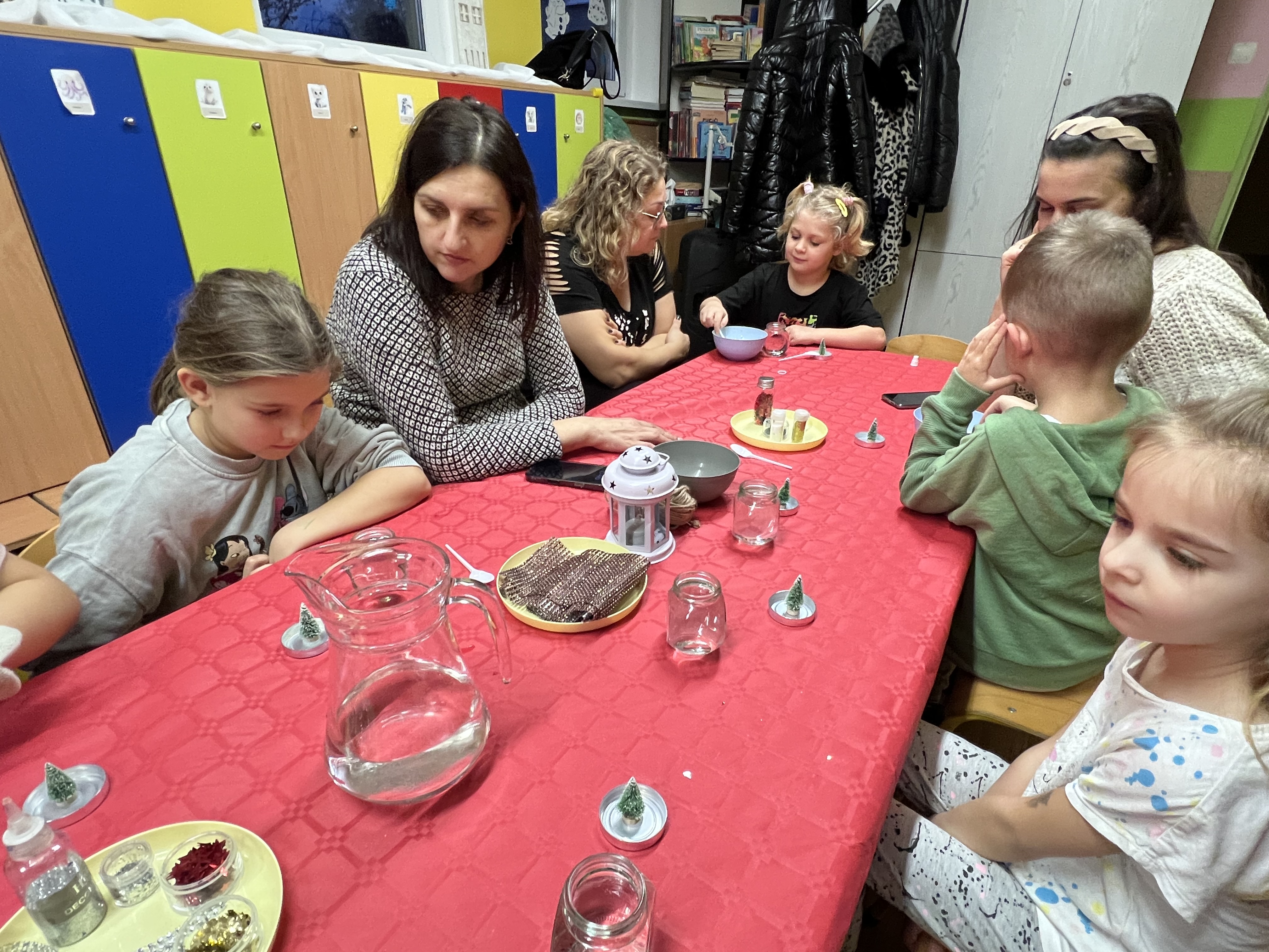 Podczas wspólnie spędzonego czasu dzieci wraz z rodzicami z zaangażowaniem tworzyły zimowe kule śnieżne oraz świąteczne choinki ze sklejki. Kolorowe materiały, brokat oraz inne ozdoby pobudzały wyobraźnię najmłodszych, a efekty pracy zachwycały swoją pomysłowością i starannością wykonania. Każda praca była wyjątkowa i odzwierciedlała kreatywność małych artystów.