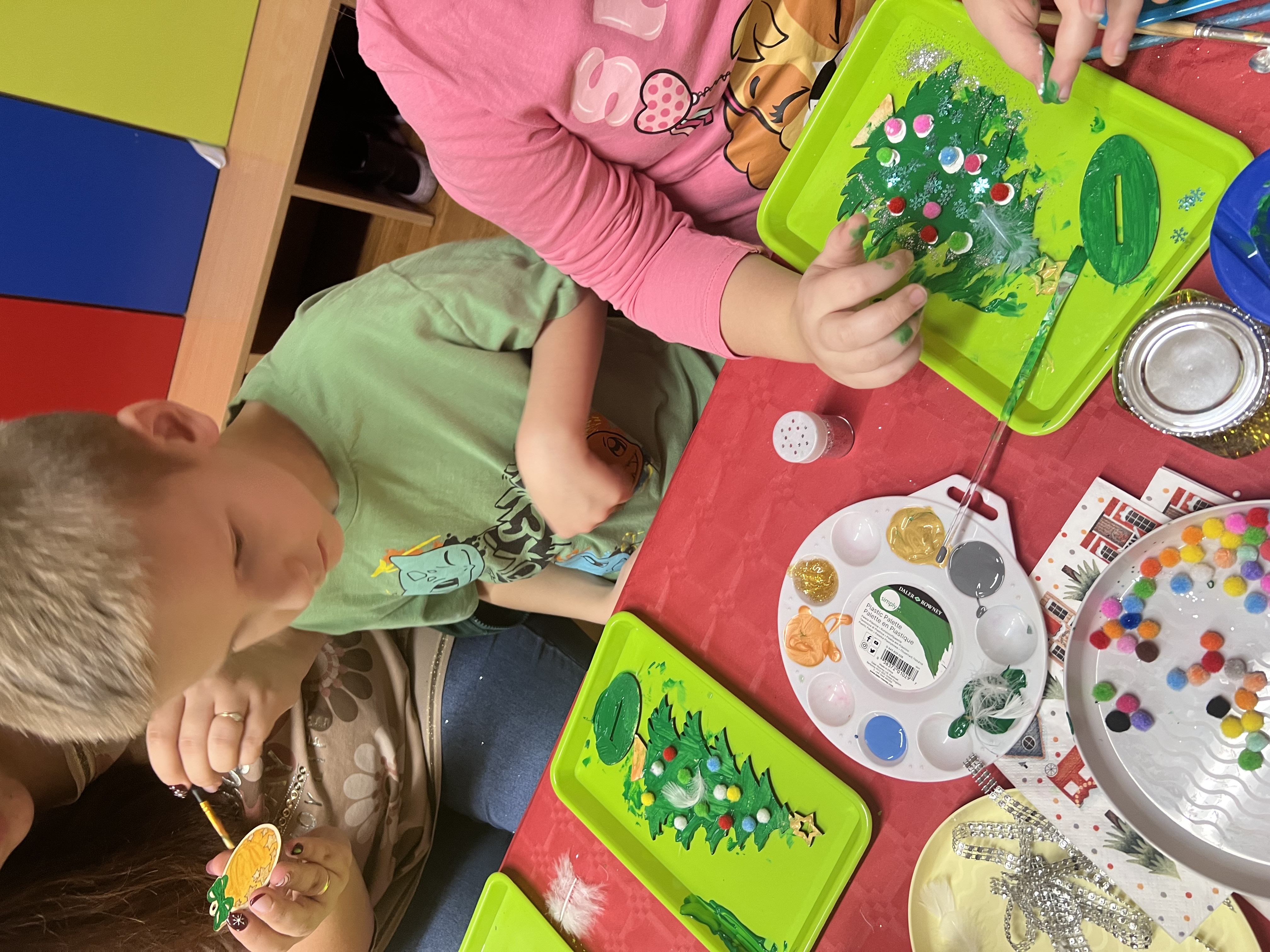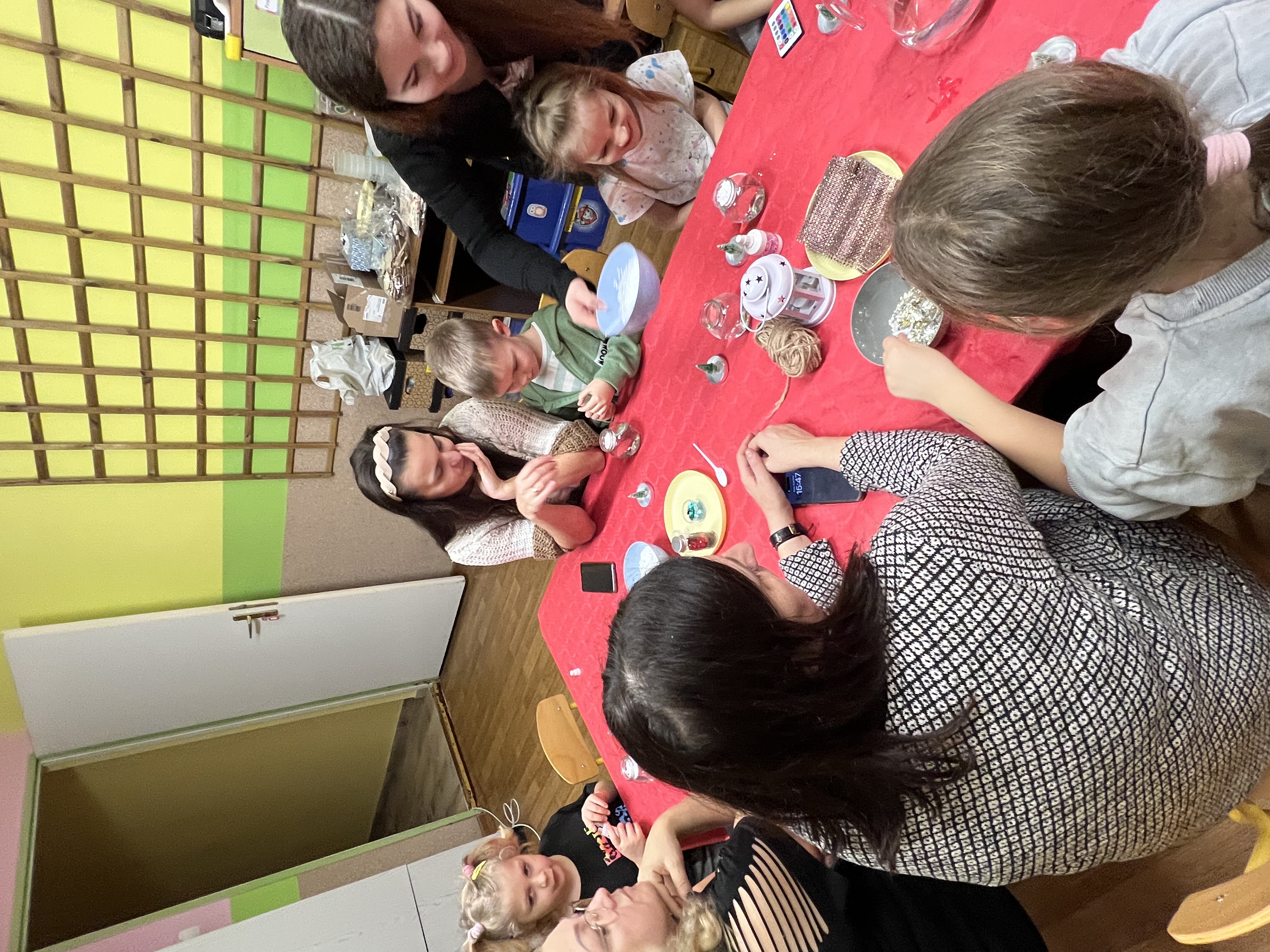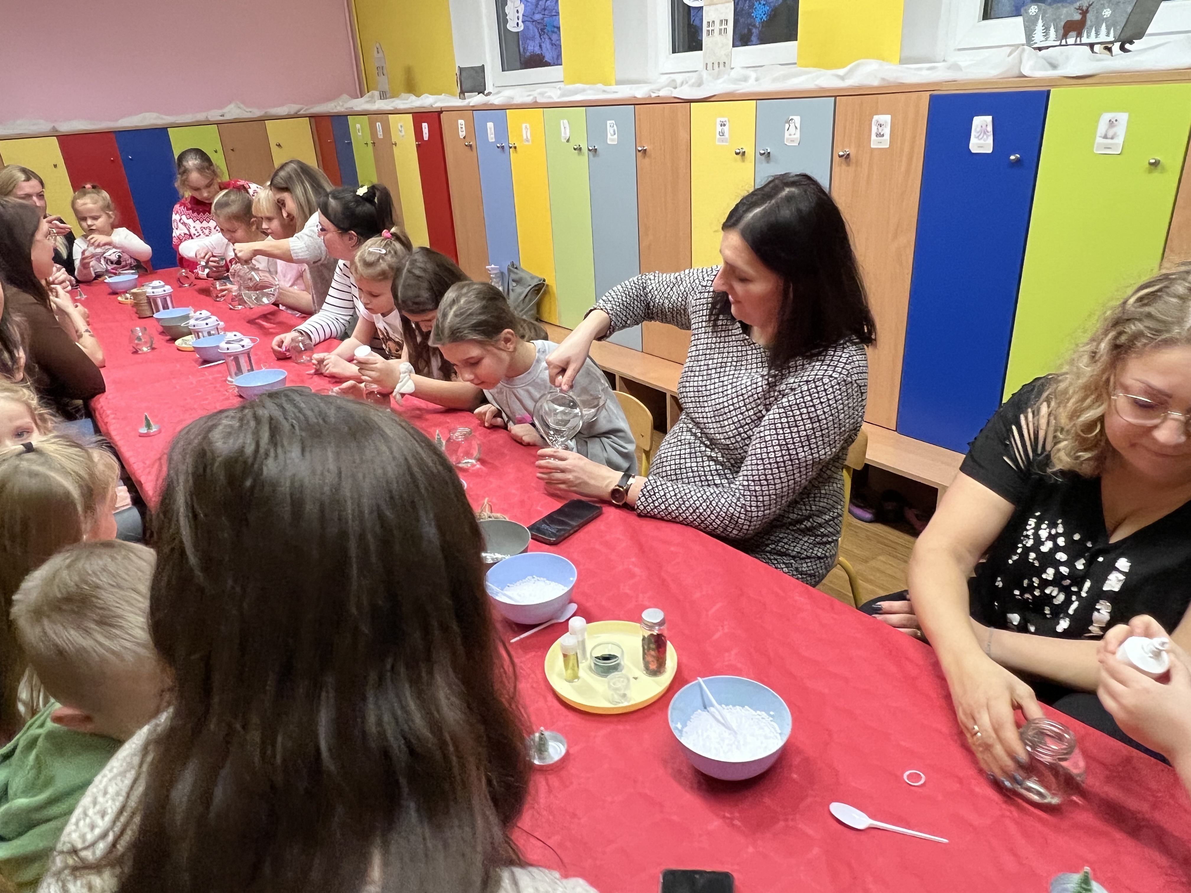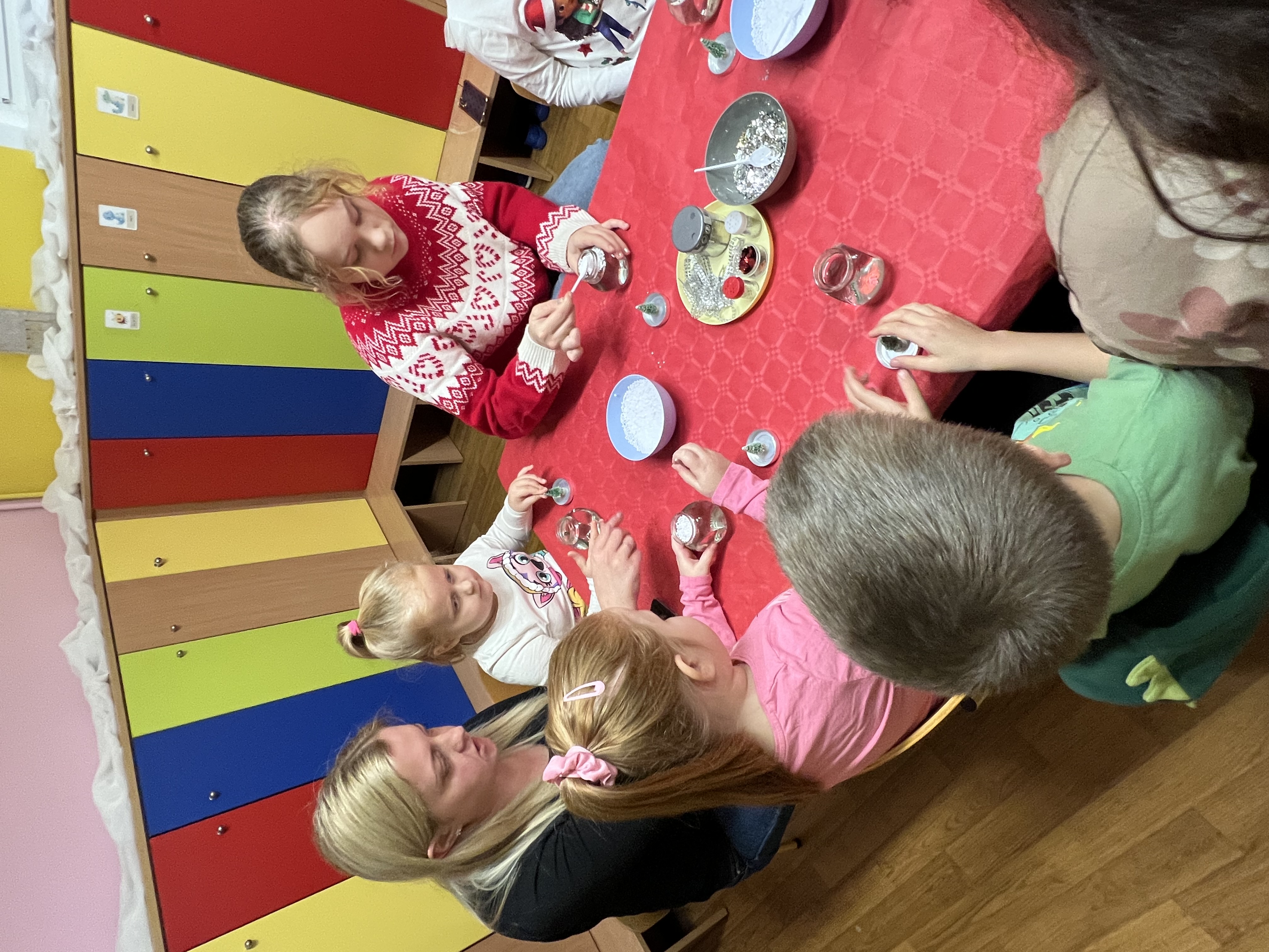 Podczas wspólnie spędzonego czasu dzieci wraz z rodzicami z zaangażowaniem tworzyły zimowe kule śnieżne oraz świąteczne choinki ze sklejki. Kolorowe materiały, brokat oraz inne ozdoby pobudzały wyobraźnię najmłodszych, a efekty pracy zachwycały swoją pomysłowością i starannością wykonania. Każda praca była wyjątkowa i odzwierciedlała kreatywność małych artystów.