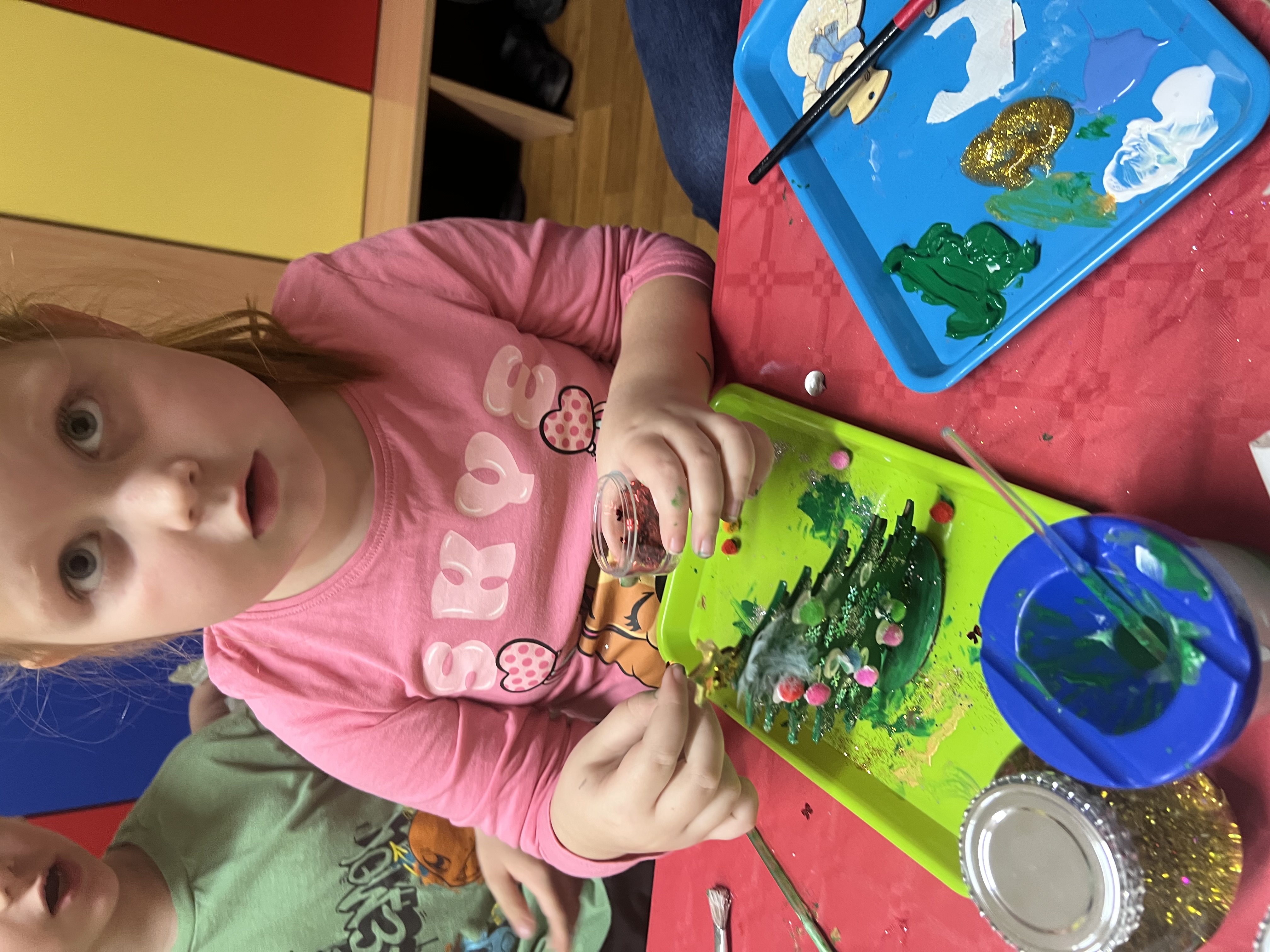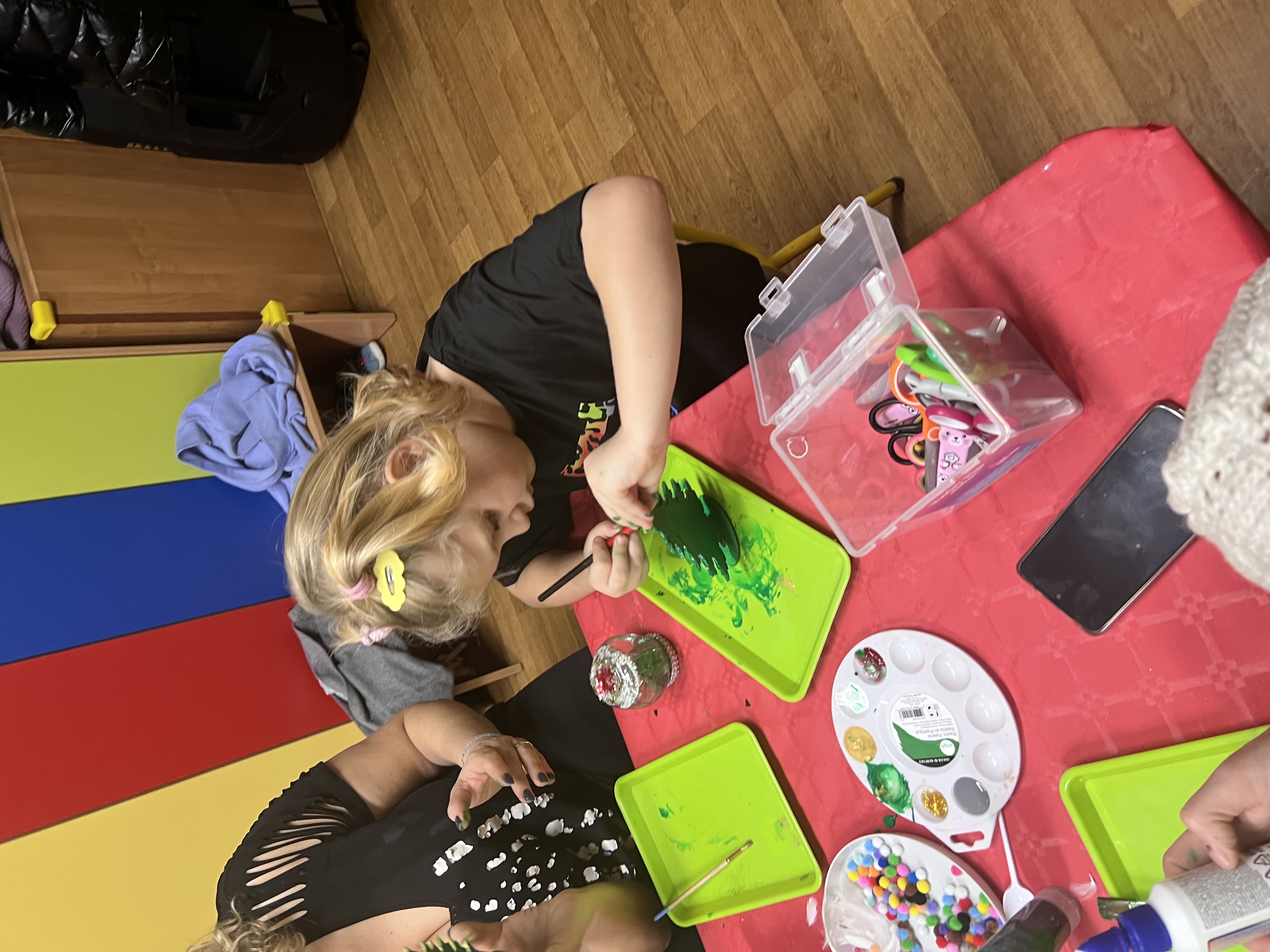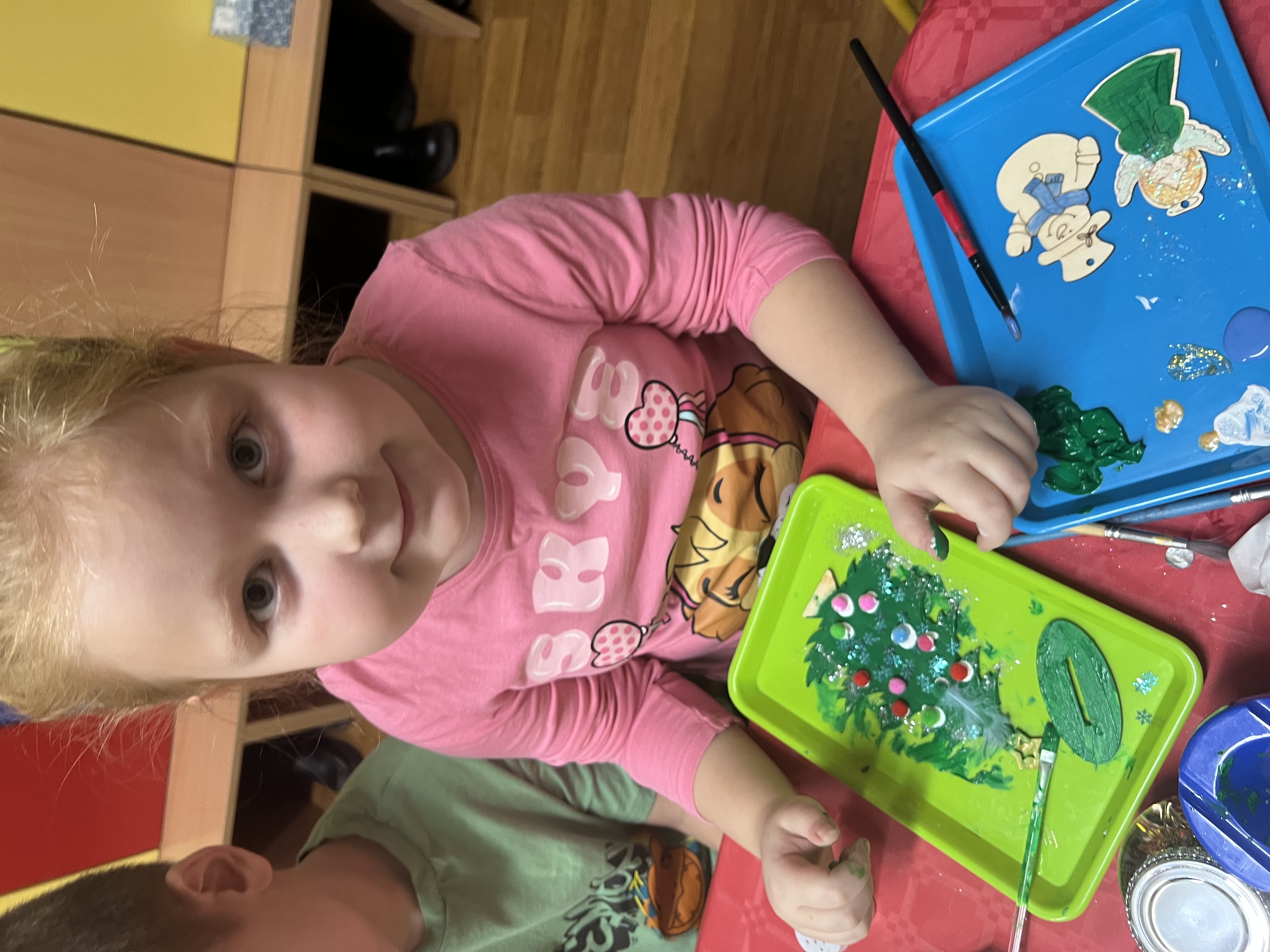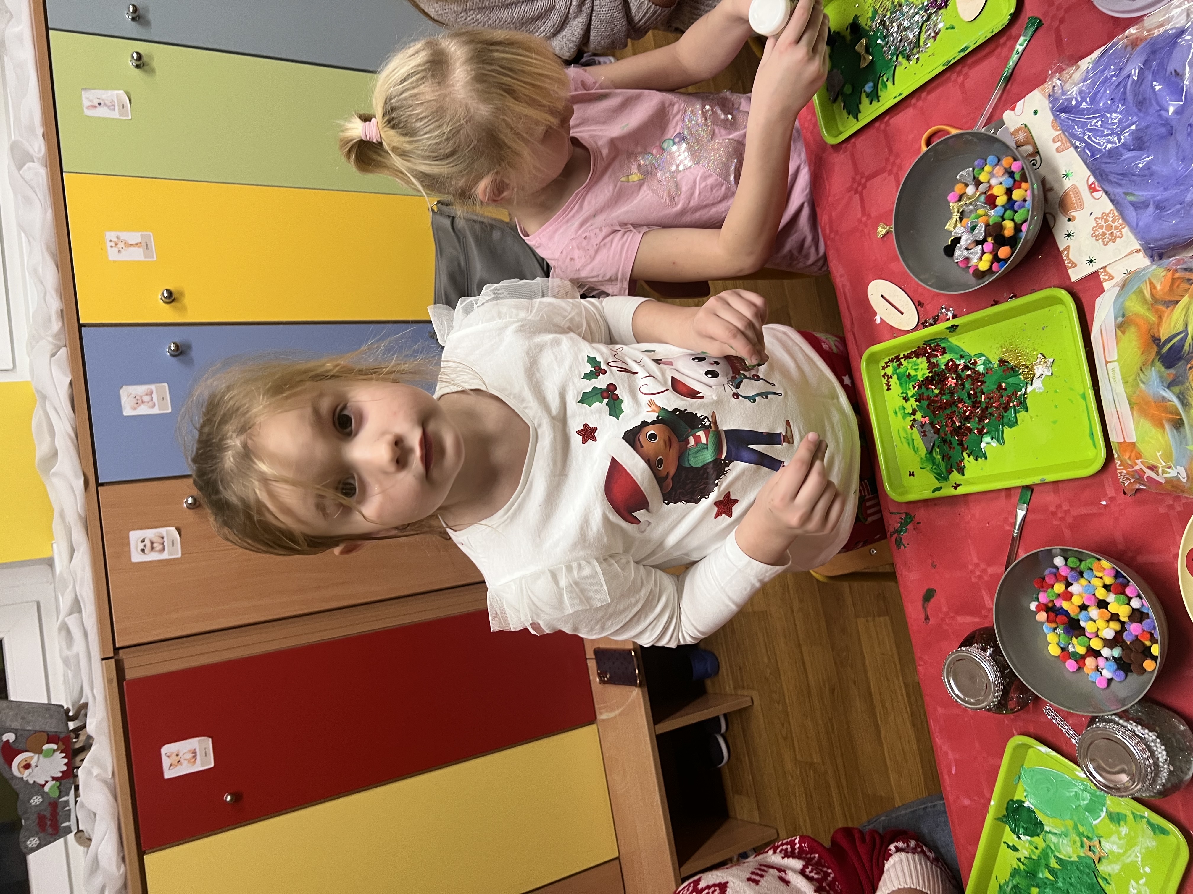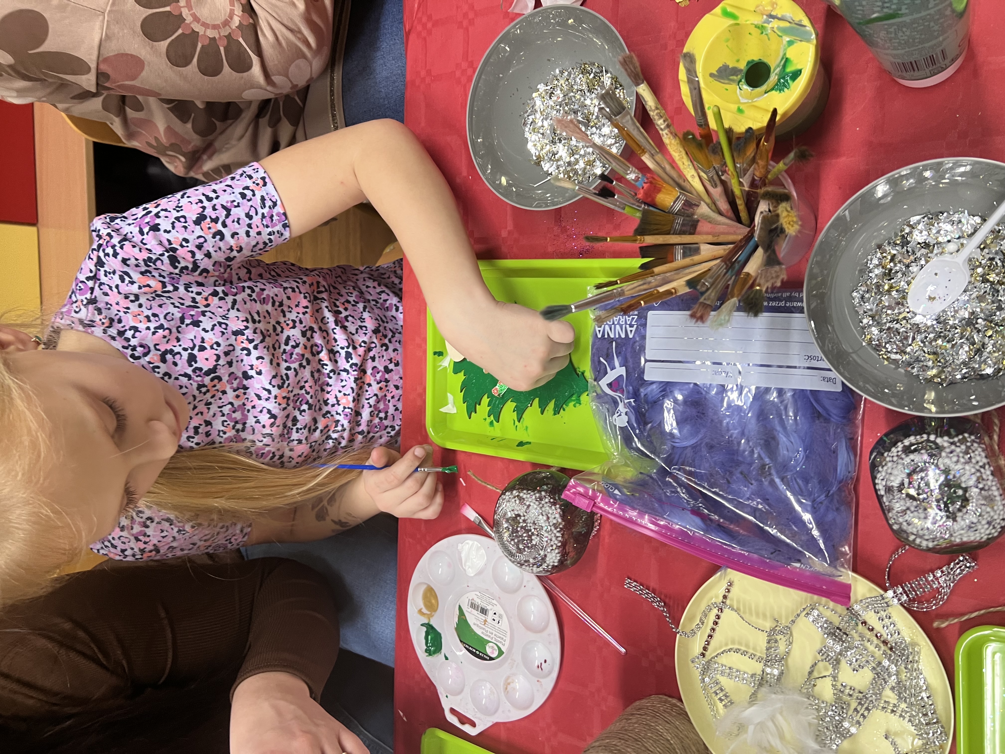 Podczas wspólnie spędzonego czasu dzieci wraz z rodzicami z zaangażowaniem tworzyły zimowe kule śnieżne oraz świąteczne choinki ze sklejki. Kolorowe materiały, brokat oraz inne ozdoby pobudzały wyobraźnię najmłodszych, a efekty pracy zachwycały swoją pomysłowością i starannością wykonania. Każda praca była wyjątkowa i odzwierciedlała kreatywność małych artystów.